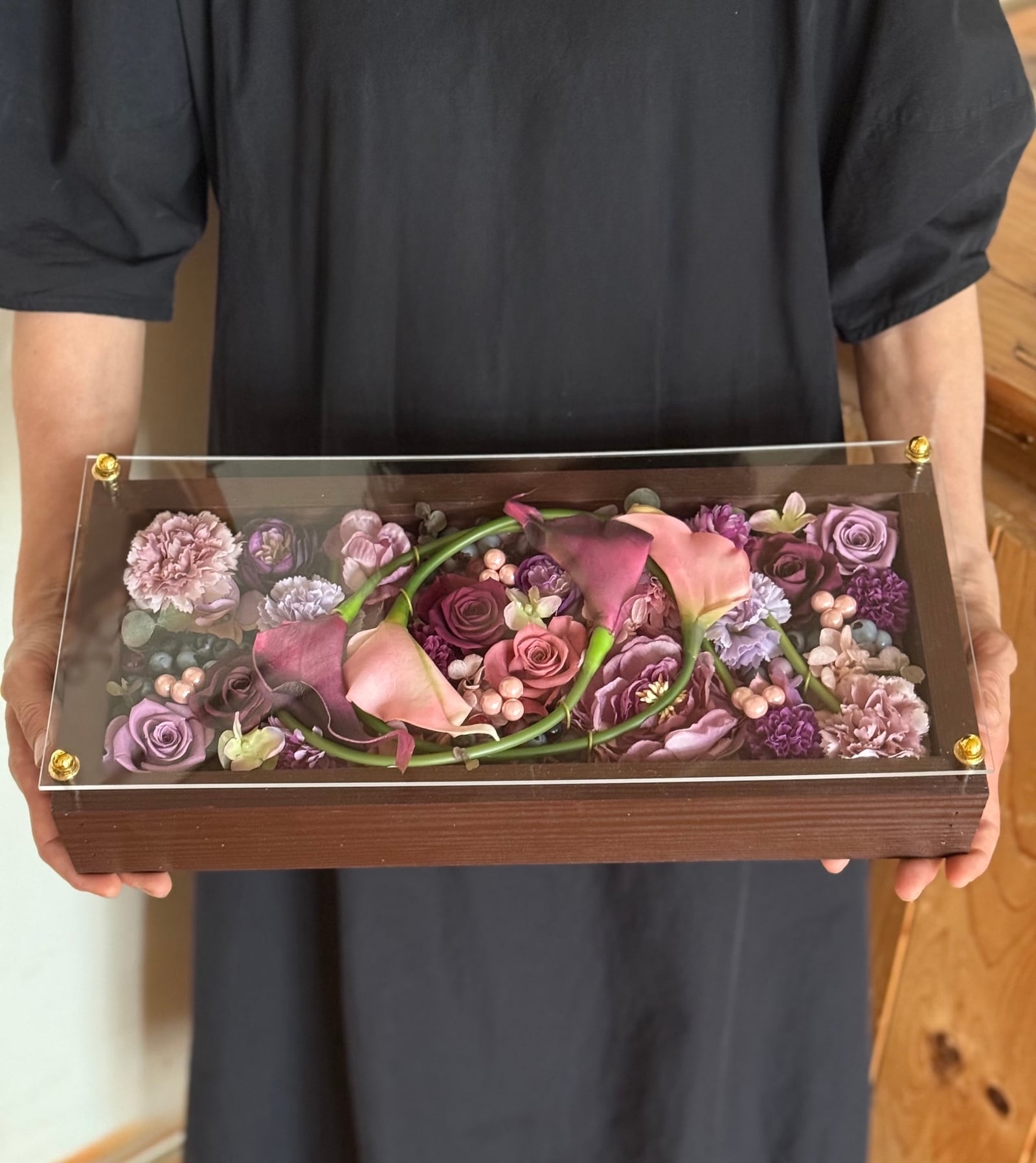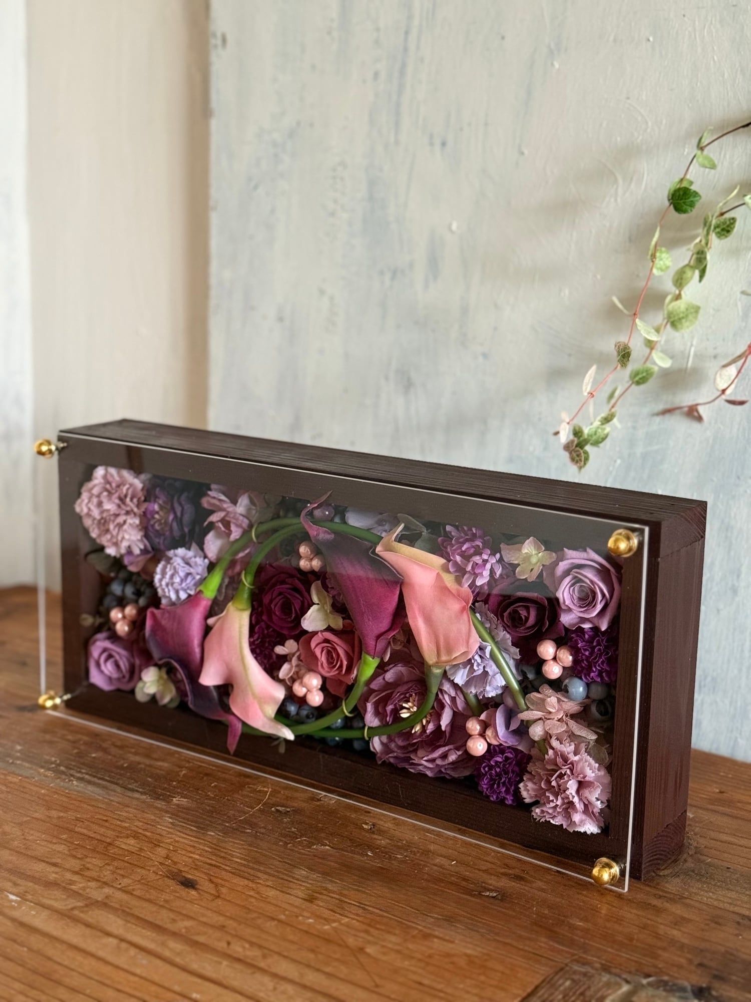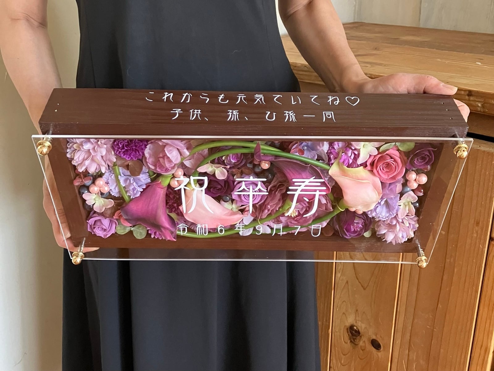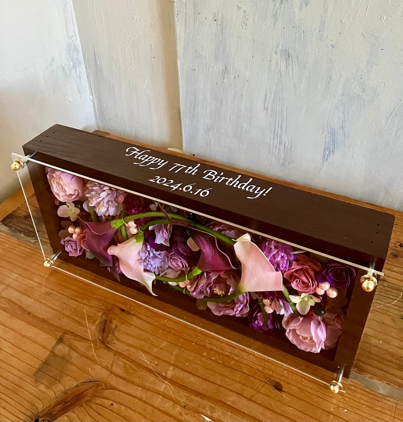 茶色のロングサイズのウッドフレームにプリザーブドフラワーと造花をぎっしり詰め込み、アクリル板にはカッティングシートでメッセージをお入れします。