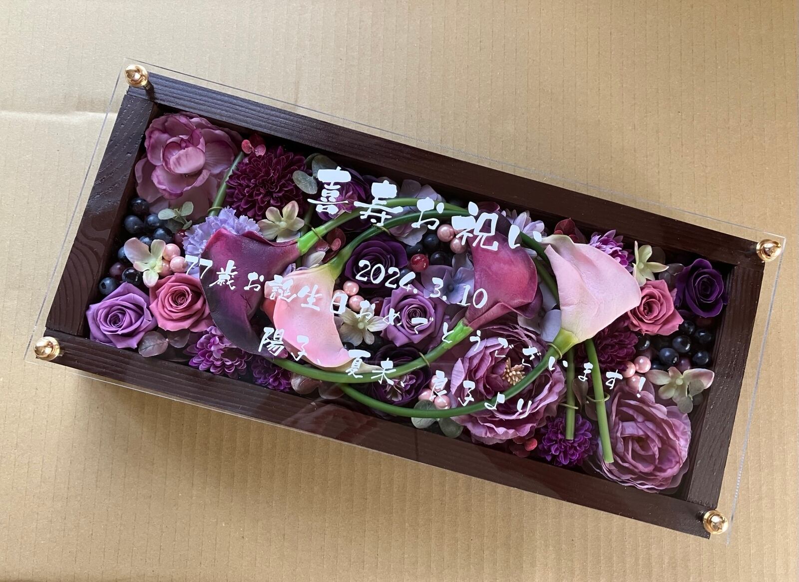 古希祝い・喜寿祝い・卒寿祝い【名入れ】プリザーブドフラワーアレンジ ウッドフレーム 茶木枠横置き〈パープル〉
