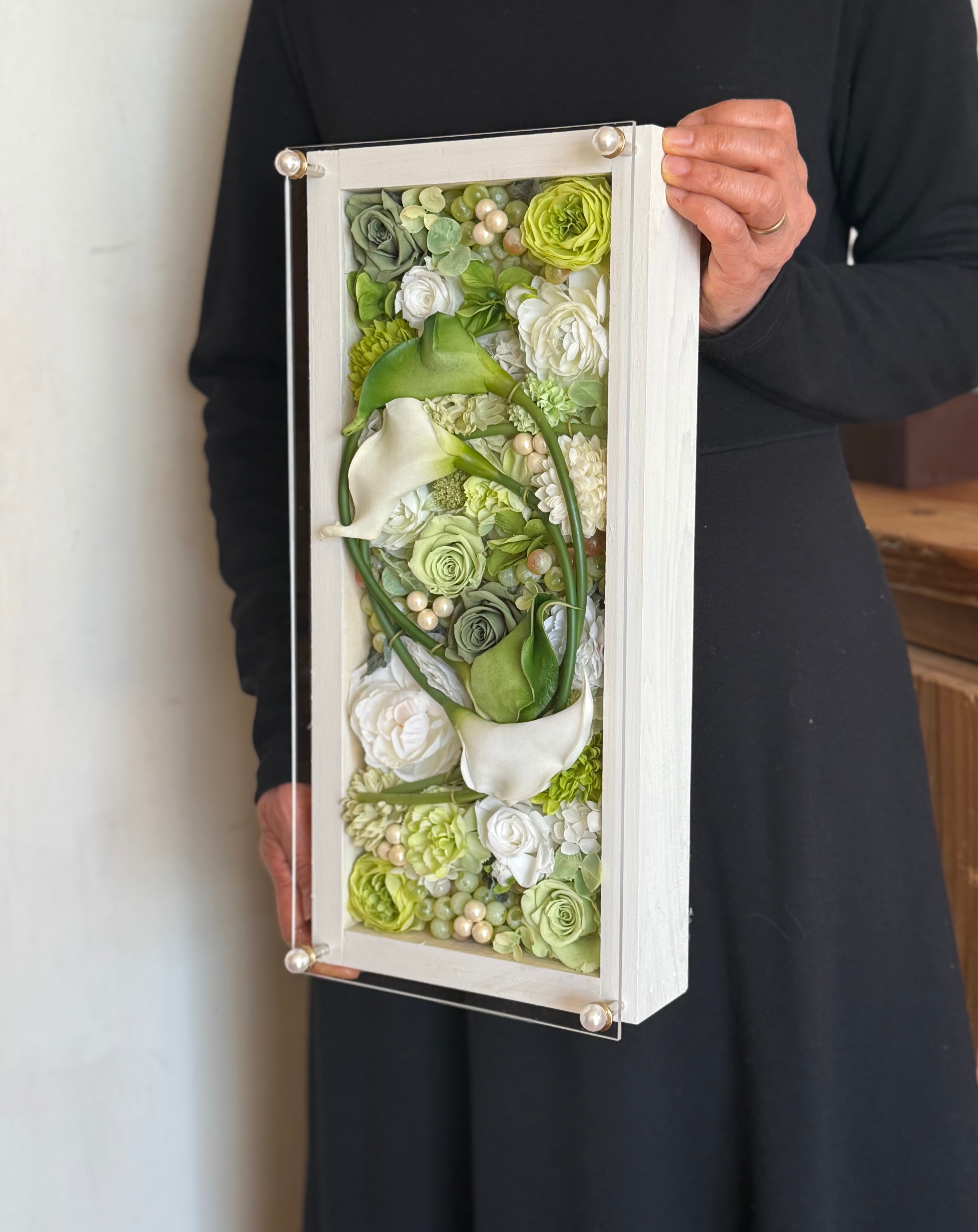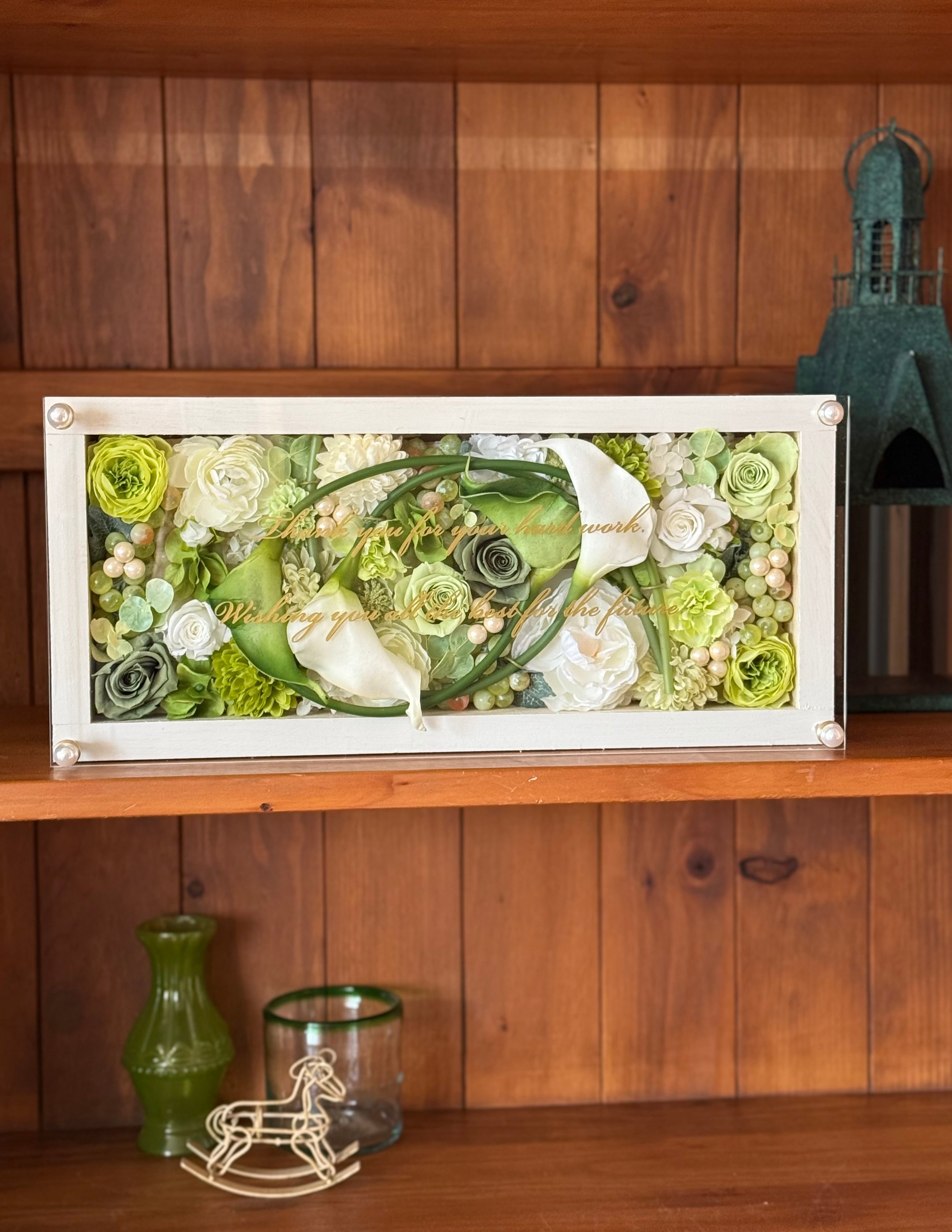 新築祝い・結婚祝い・開店祝い【名入れ】プリザーブドフラワーアレンジ ウッドフレーム 白木枠ロング〈白グリーン〉