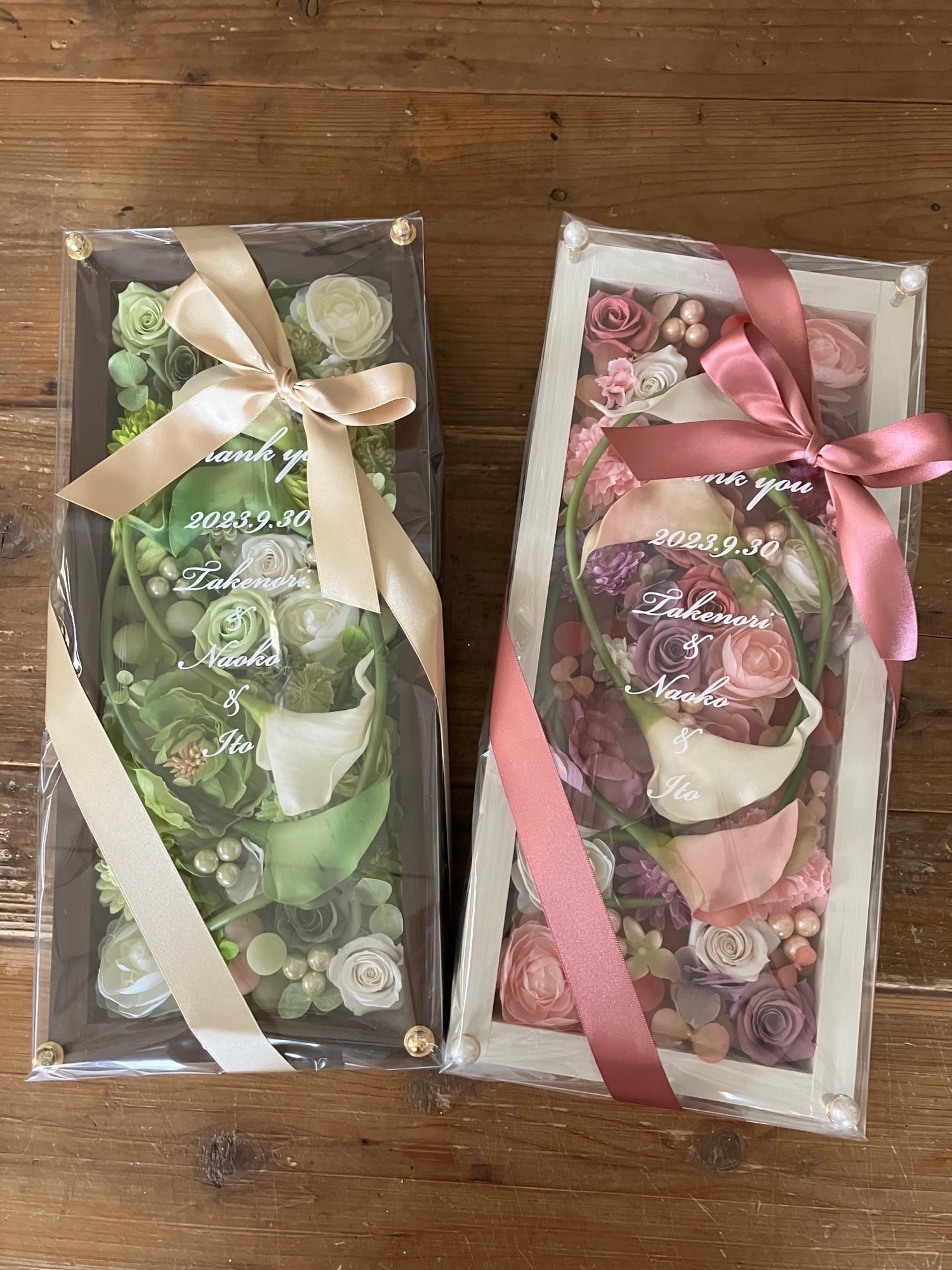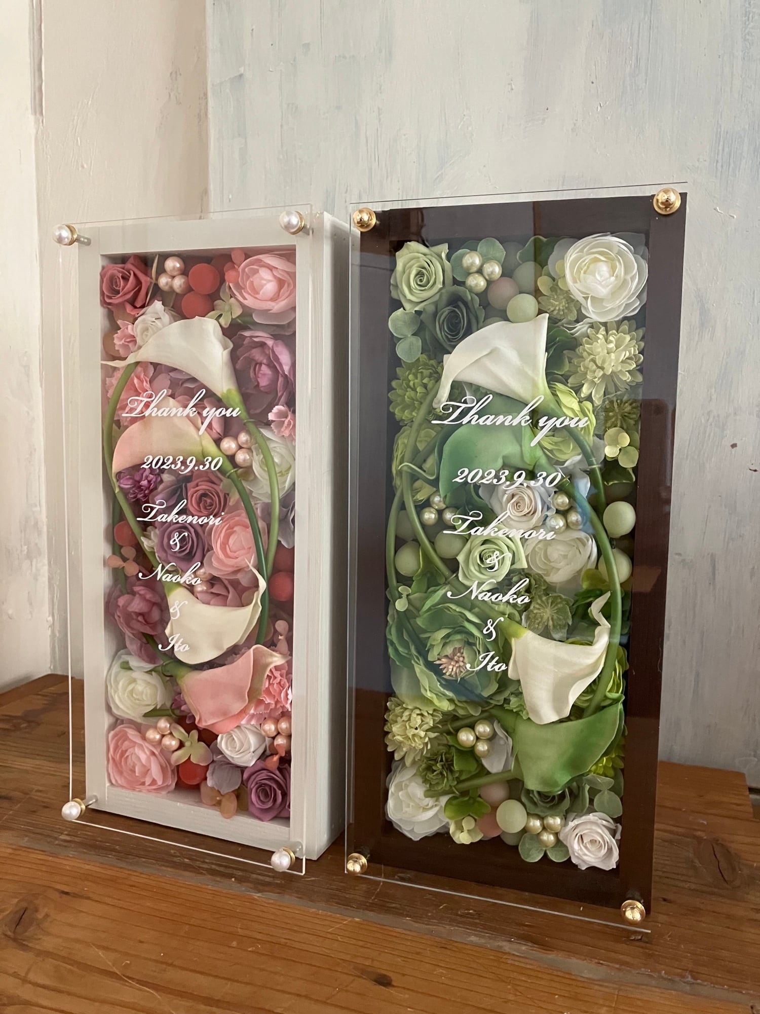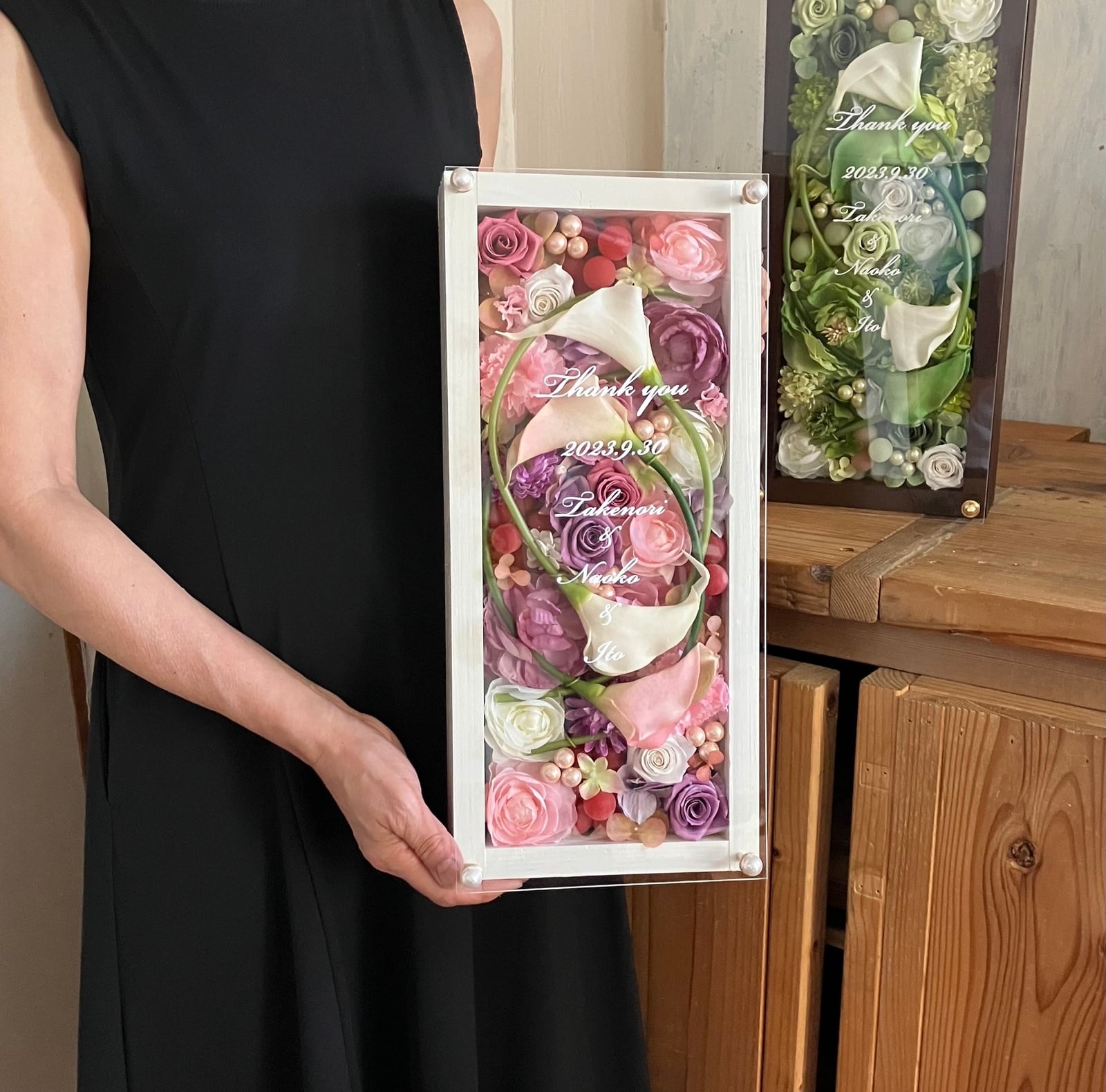感謝のギフト|結婚式 両親贈呈品プリザーブドフラワーアレンジ ウッドフレーム 木枠ロング〈白パープルピンク&白グリーン〉文字入れ 2個セット