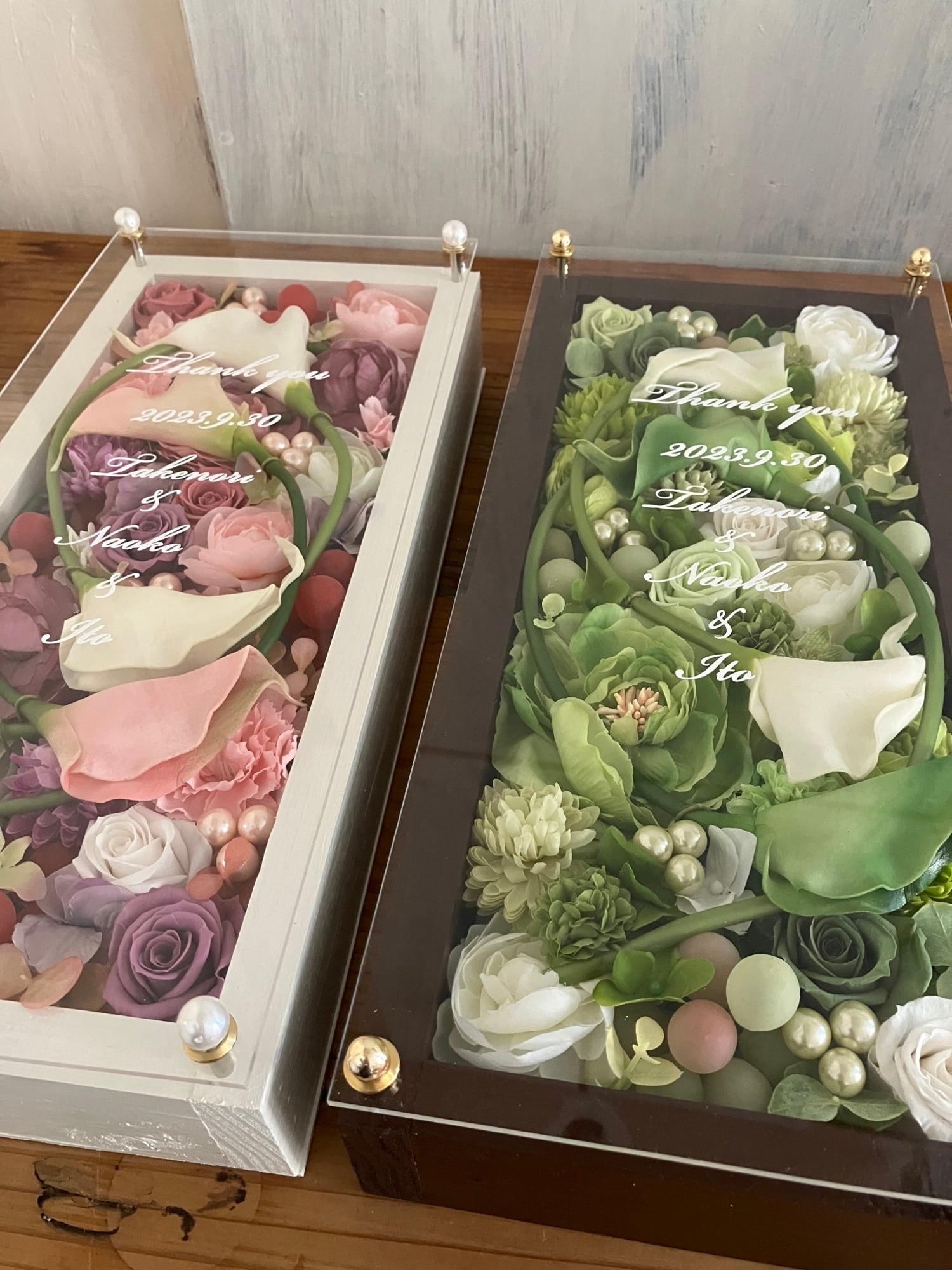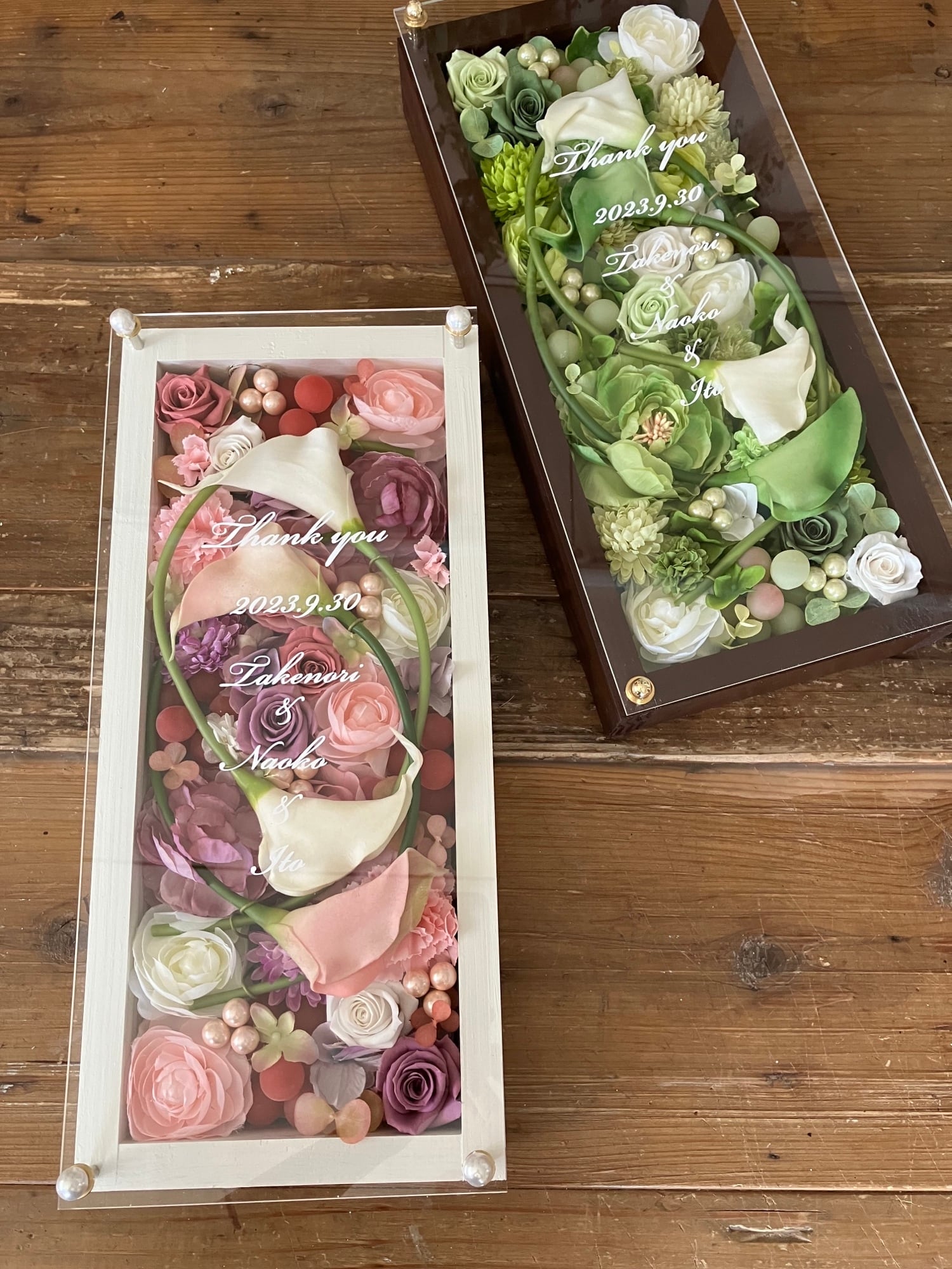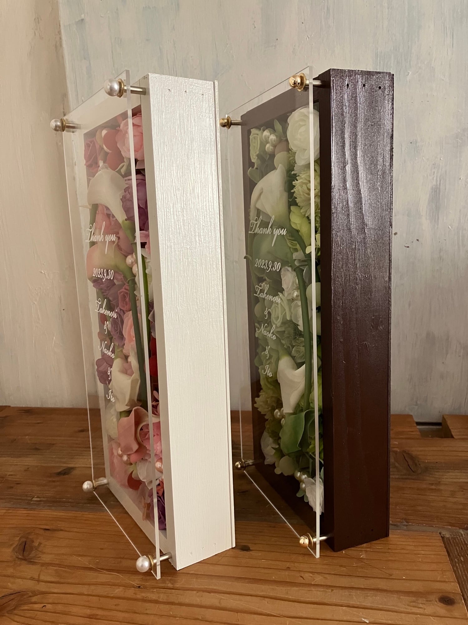 ロングサイズのウッドフレームにプリザーブドフラワーと造花をぎっしり詰め込み、アクリル板にはカッティングシートでメッセージをお入れします。