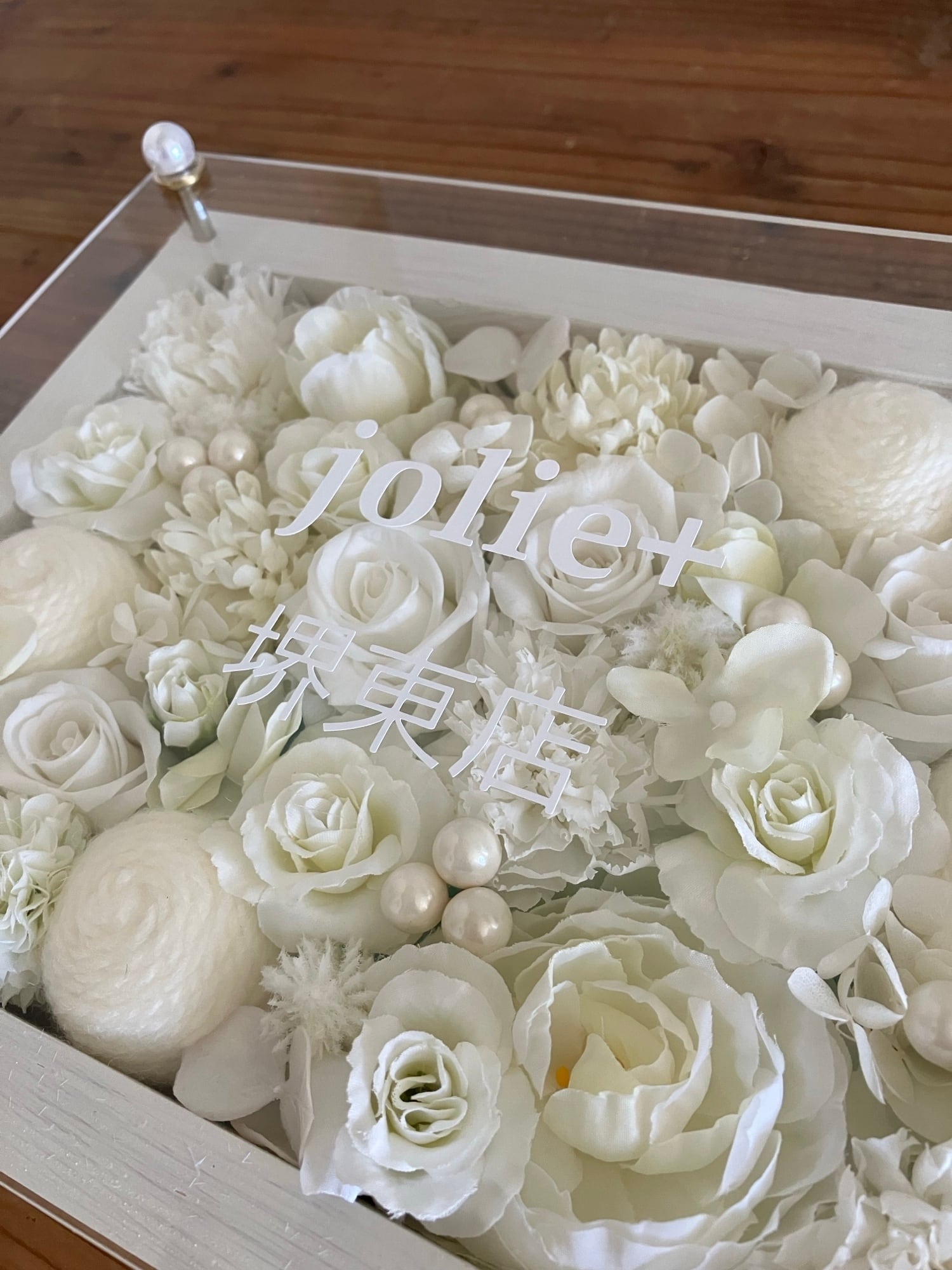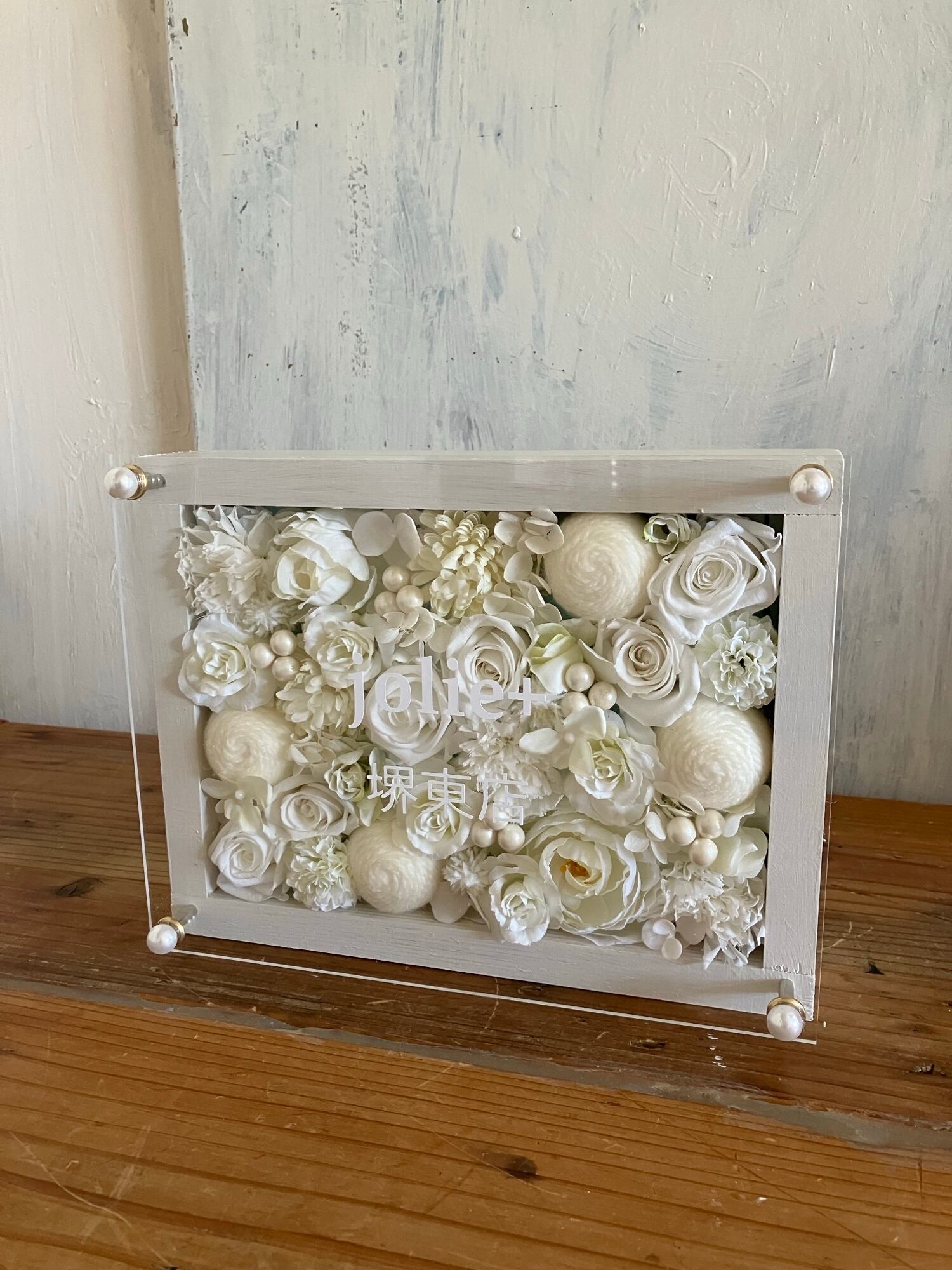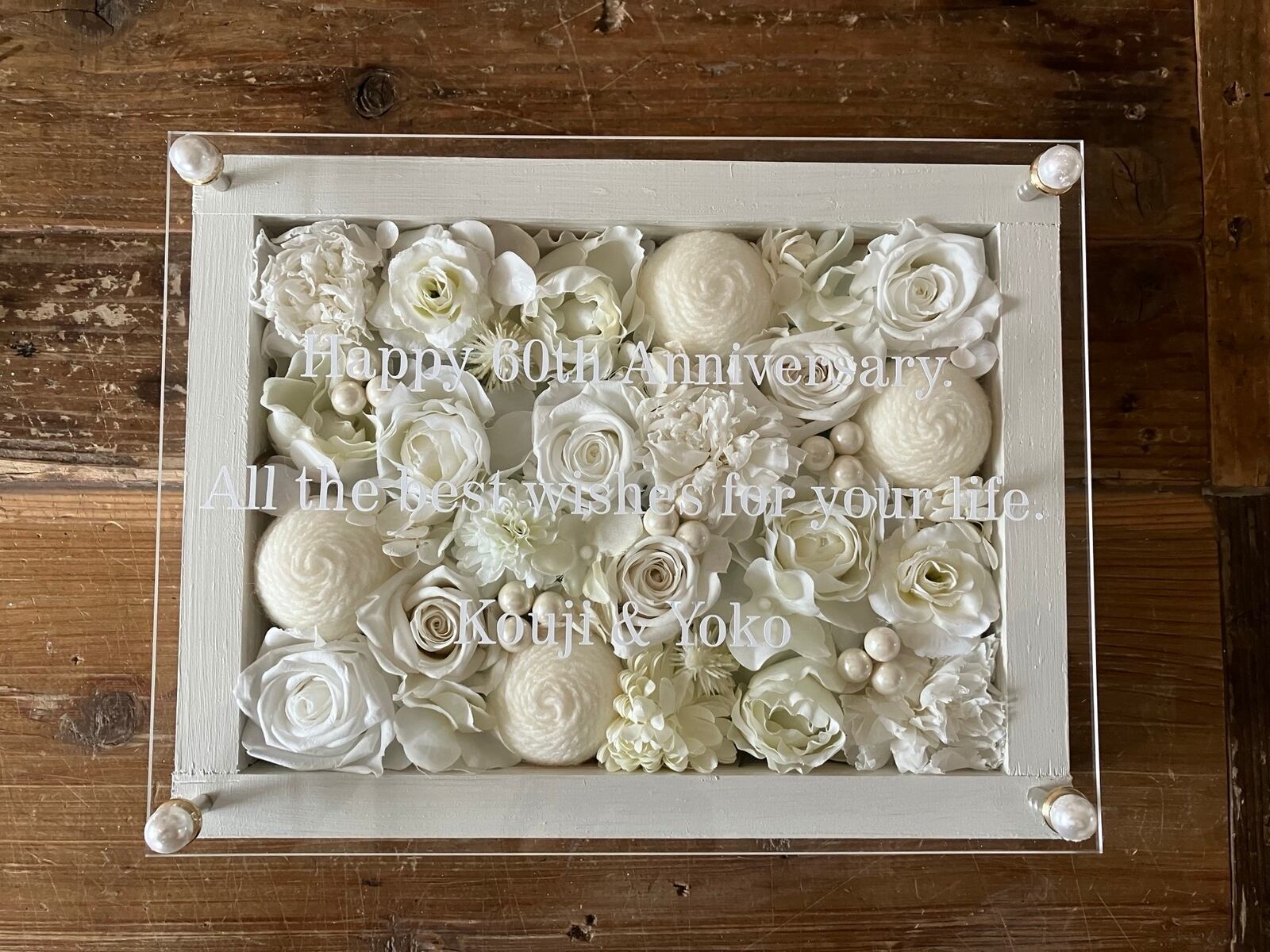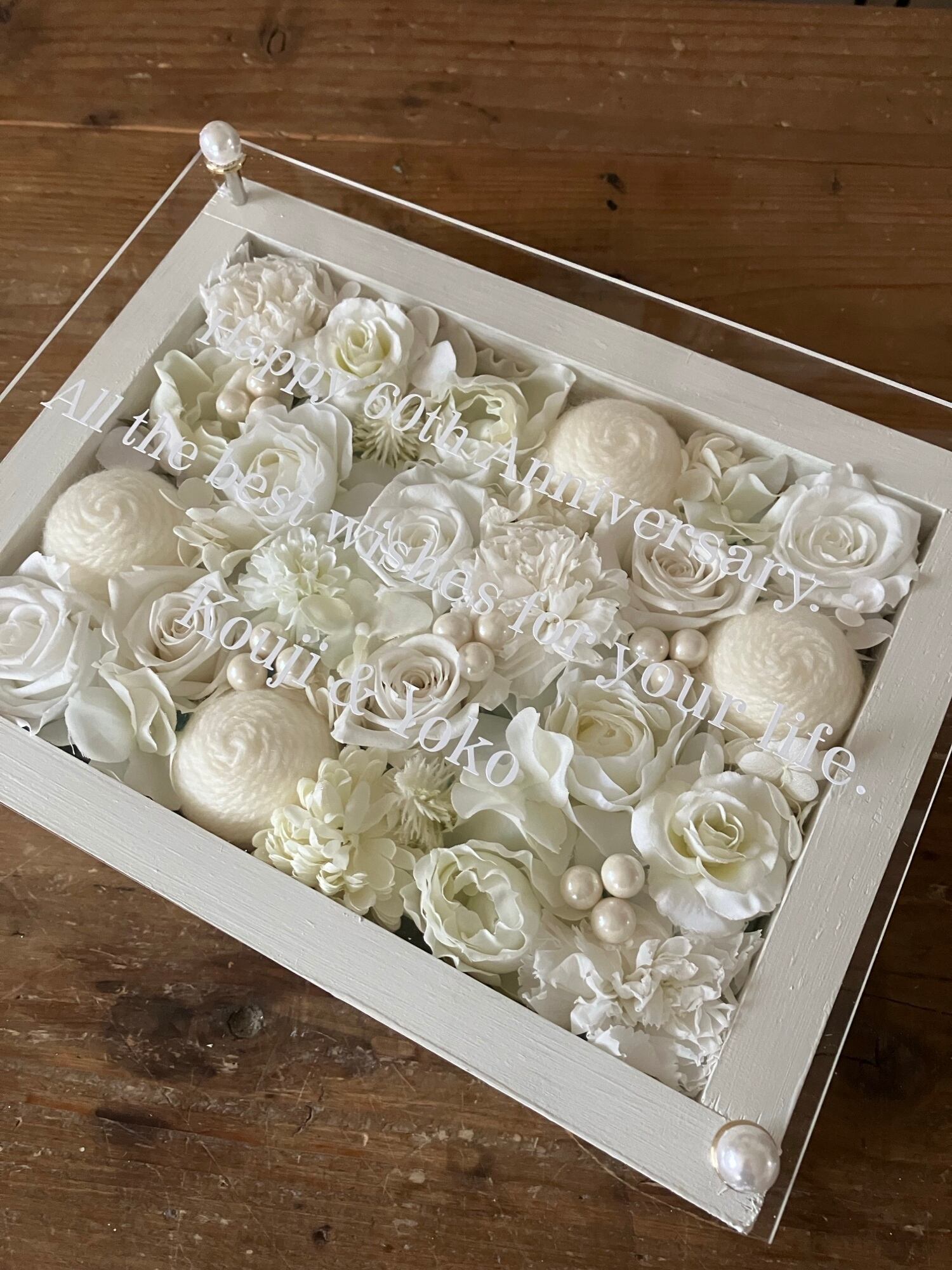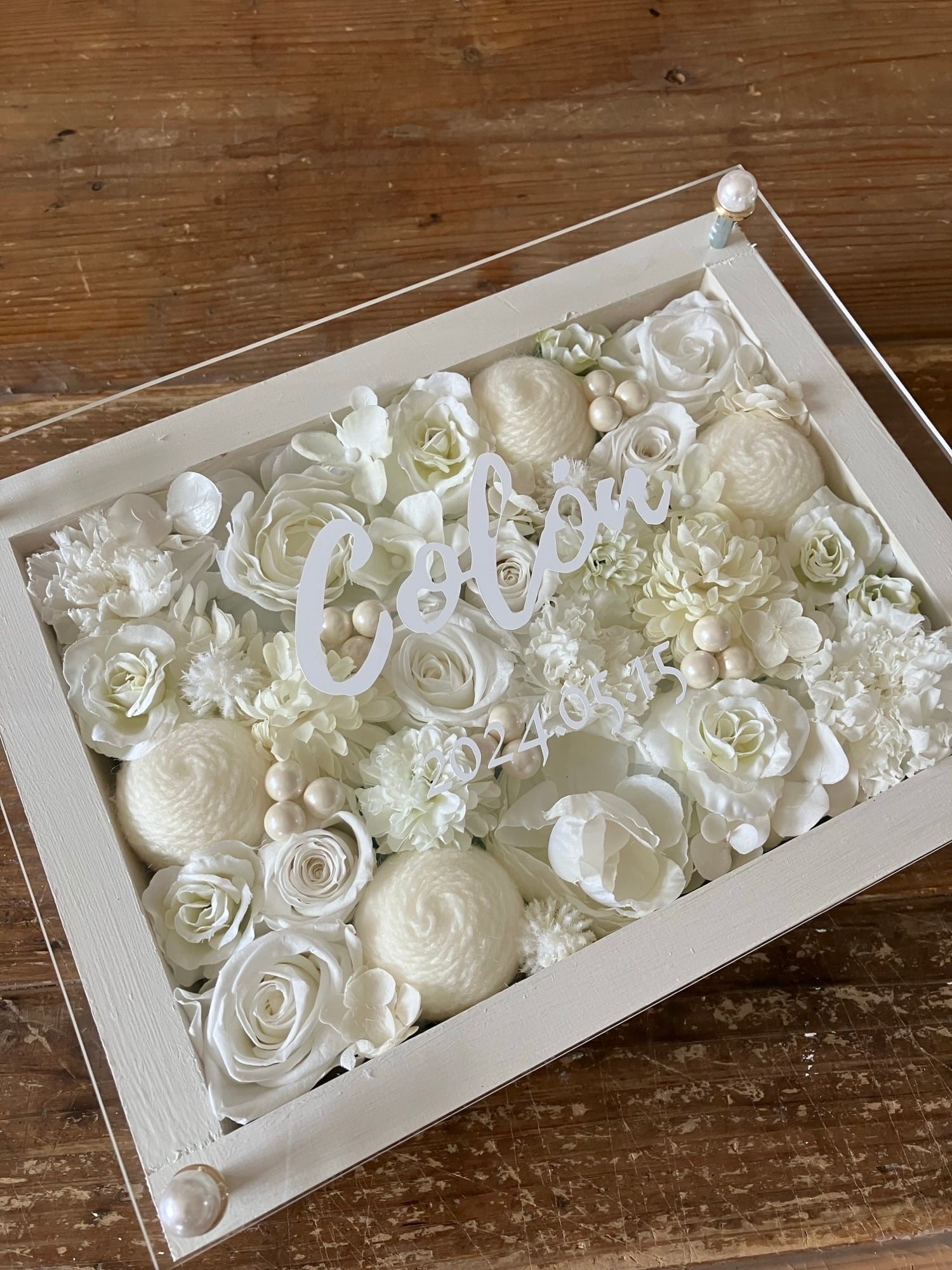 ウッドフレームにプリザーブドフラワーと造花をぎっしり詰め込み、アクリル板にはカッティングシートでメッセージをお入れします。
