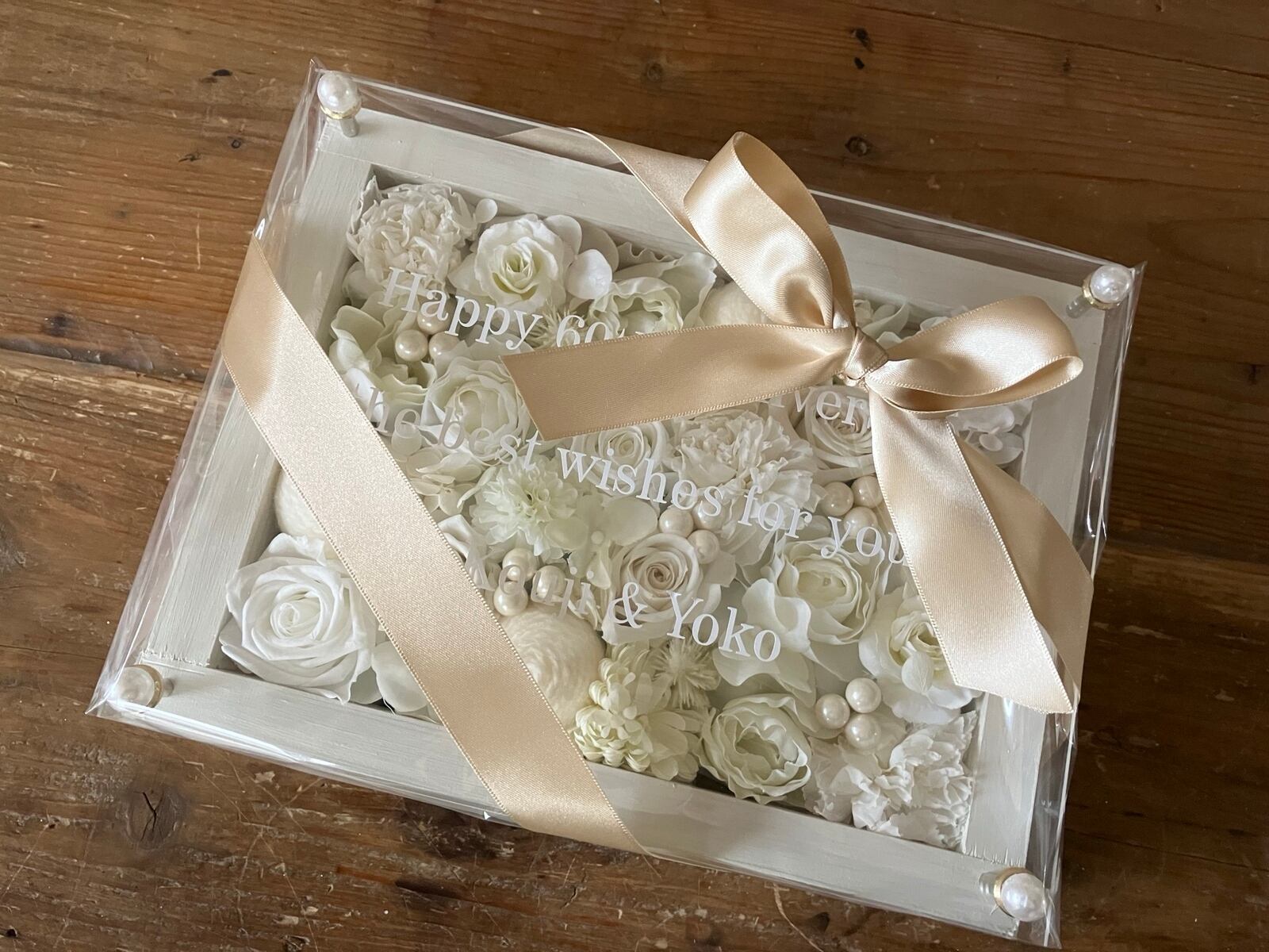 開店祝い・サロンオープン祝い・開院祝い・還暦祝い【名入れ】 プリザーブドフラワーアレンジ ウッドフレーム 木枠横置き〈白〉プライム