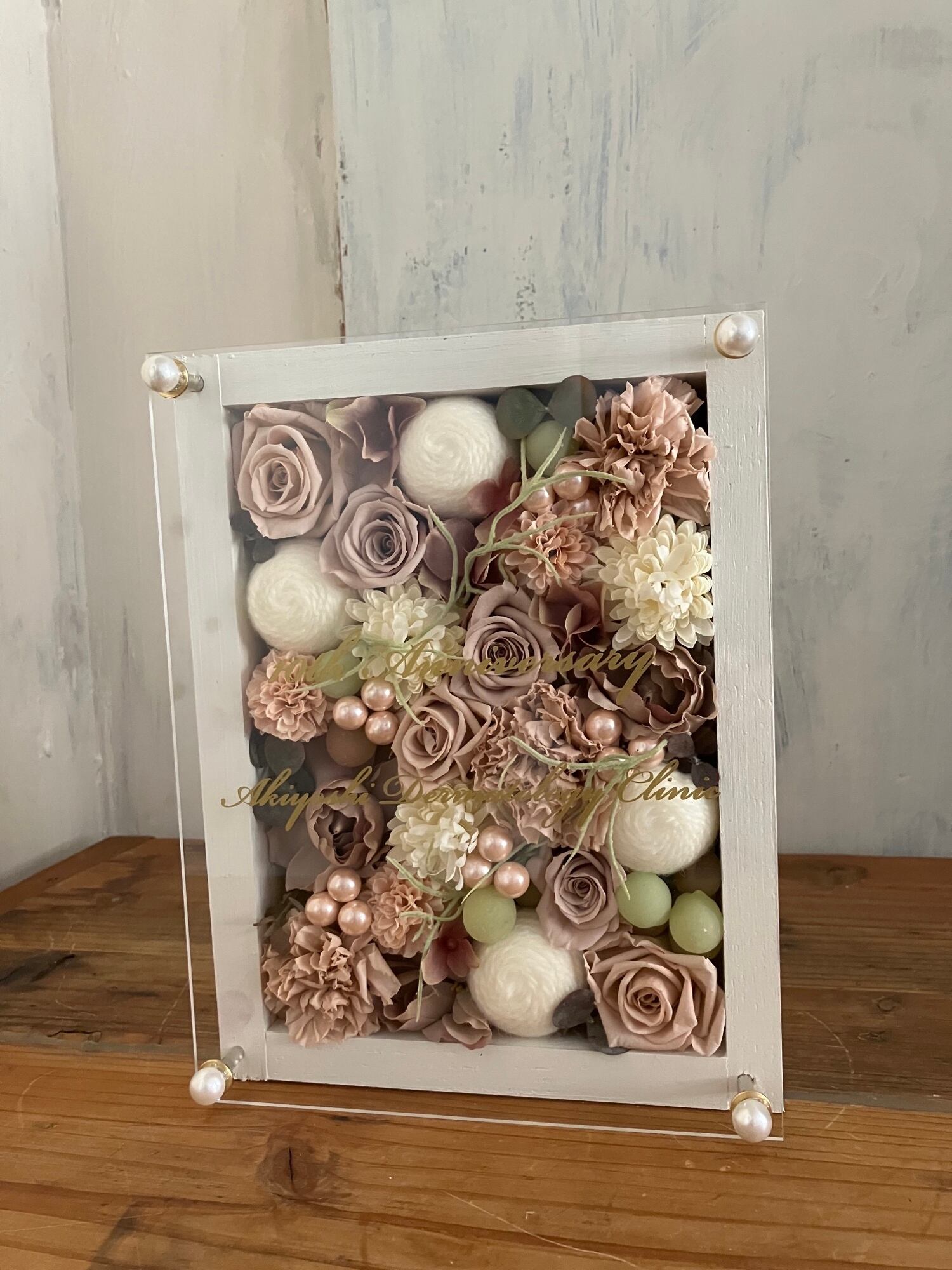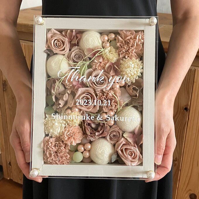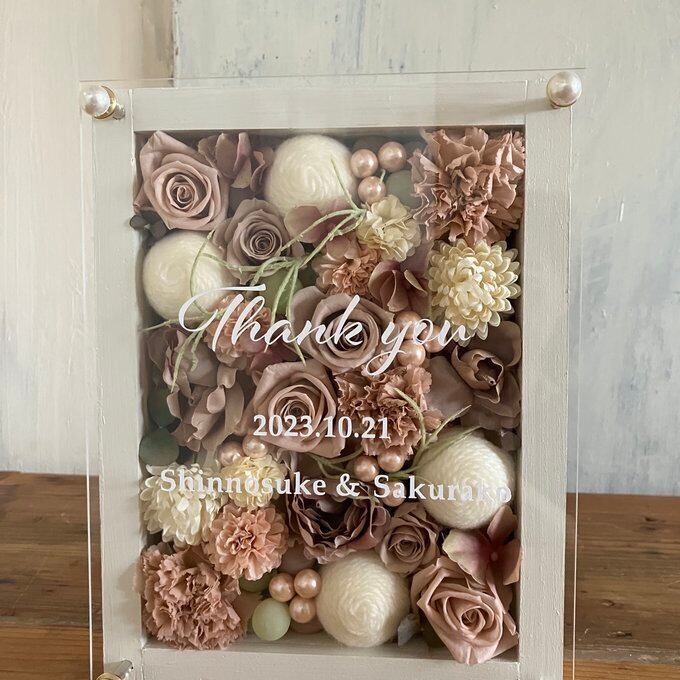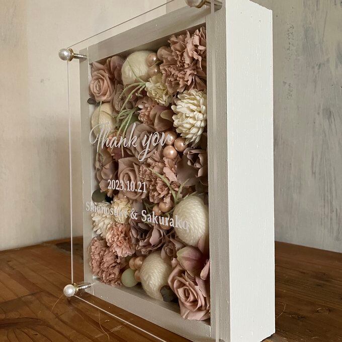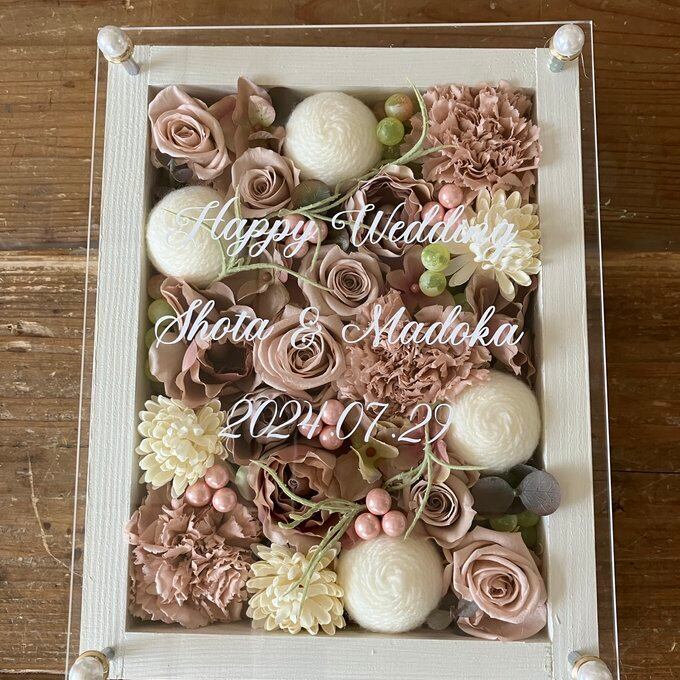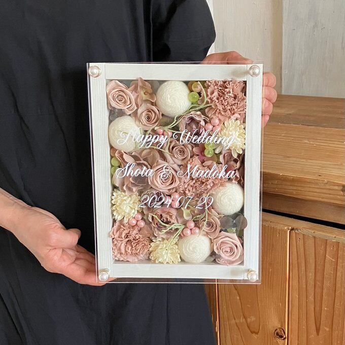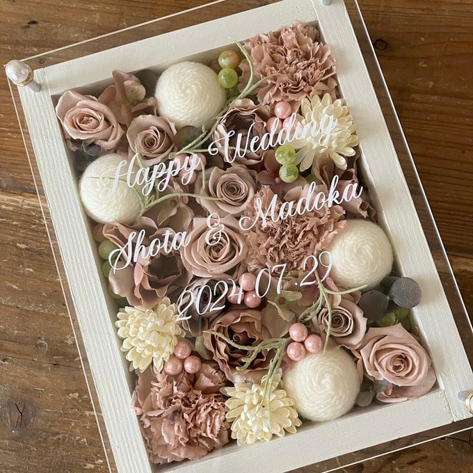 ウッドフレームにプリザーブドフラワーと造花をぎっしり詰め込み、アクリル板にはカッティングシートでメッセージをお入れします。