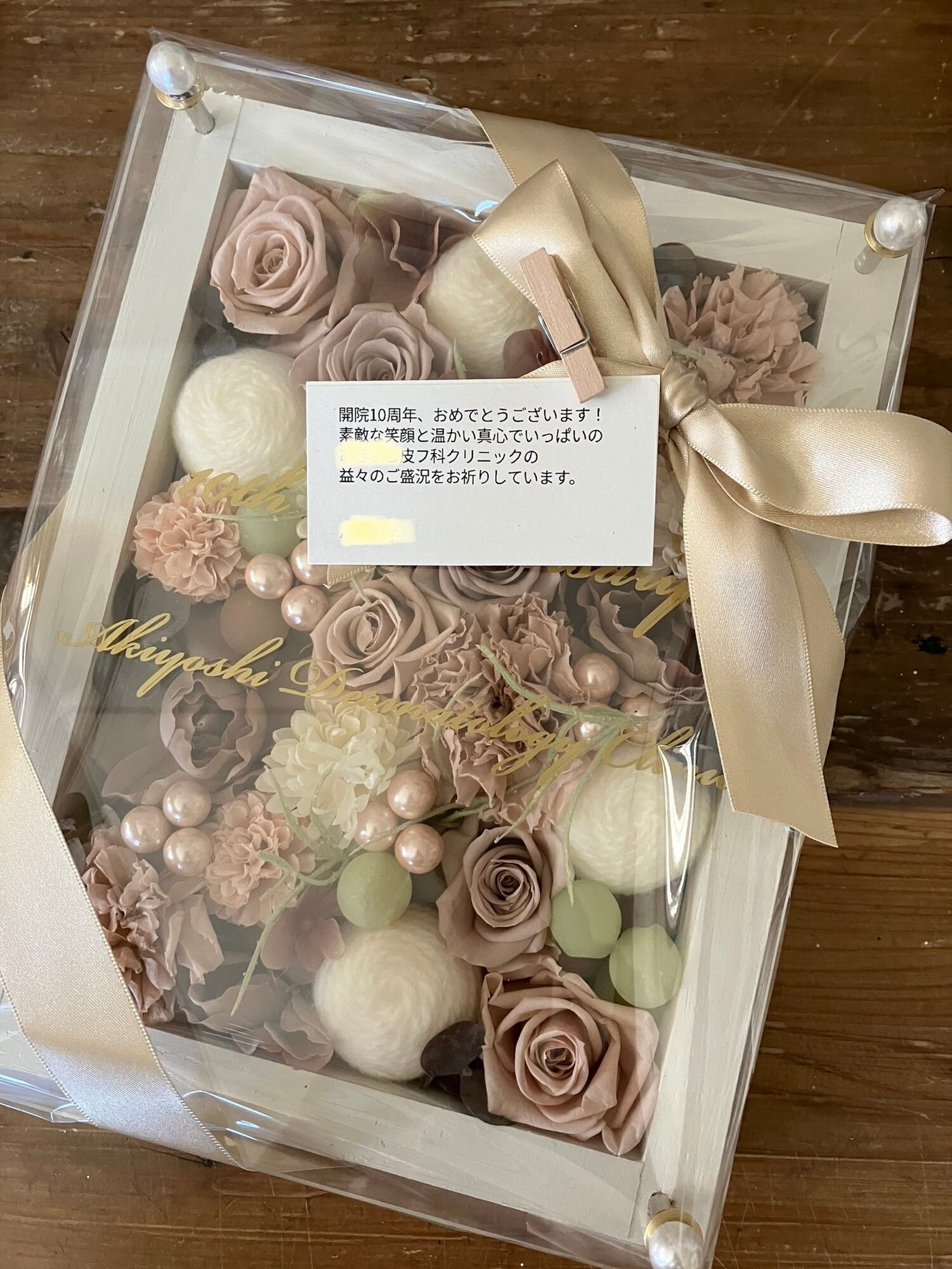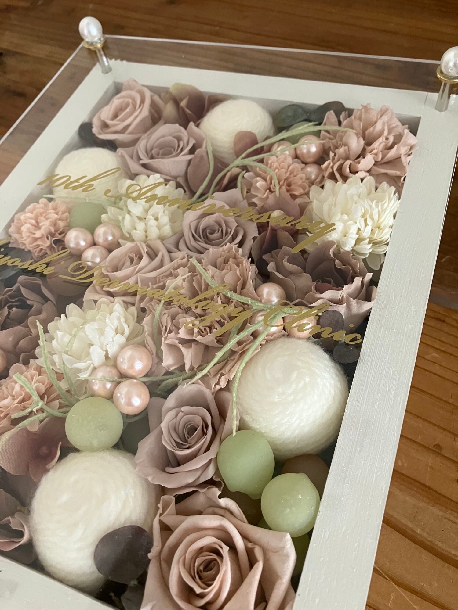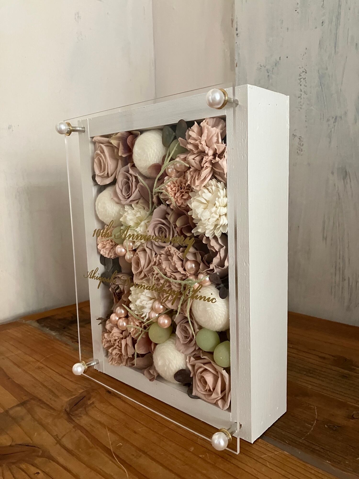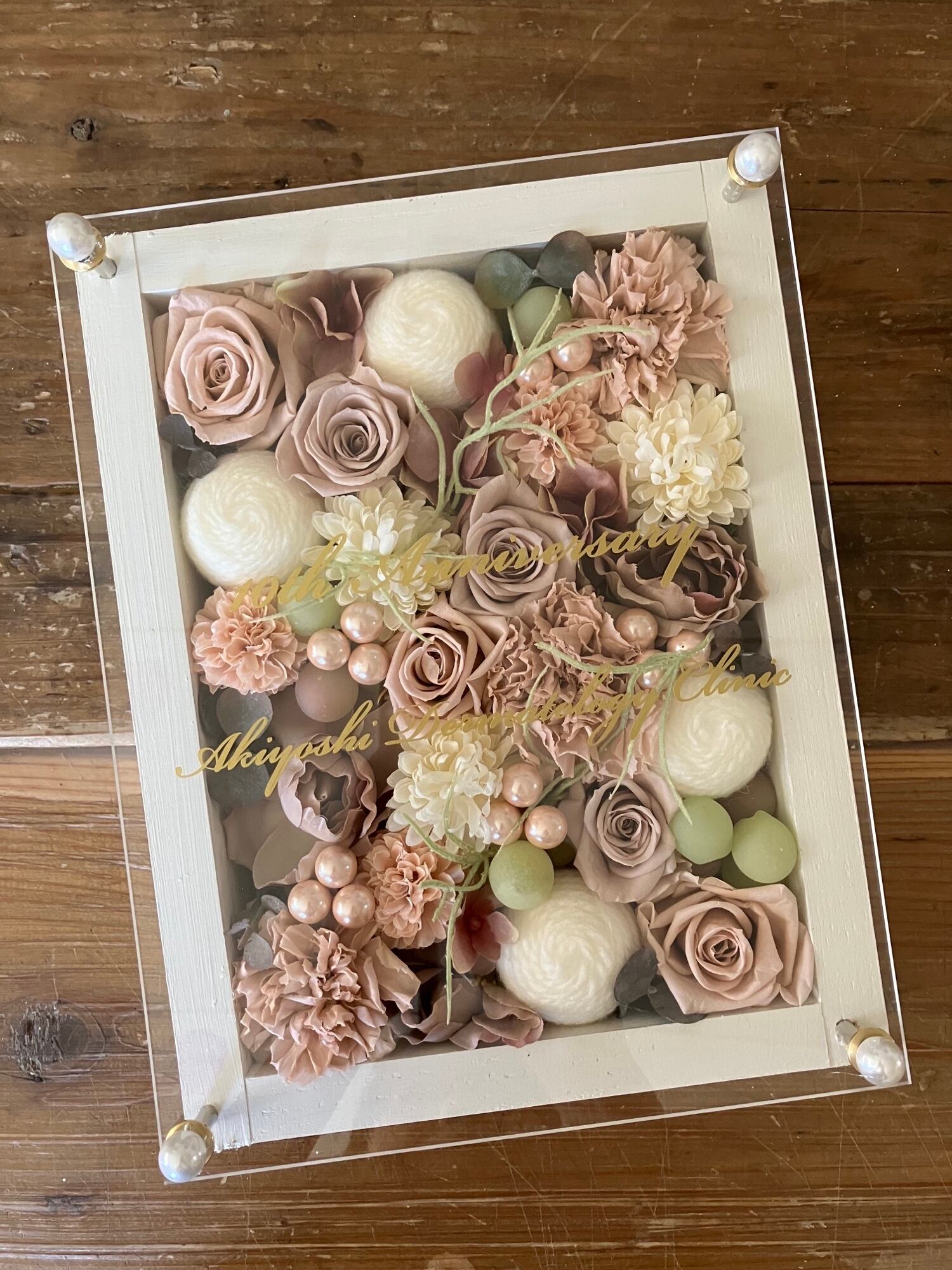 ウッドフレームにプリザーブドフラワーと造花をぎっしり詰め込み、アクリル板にはカッティングシートでメッセージをお入れします。