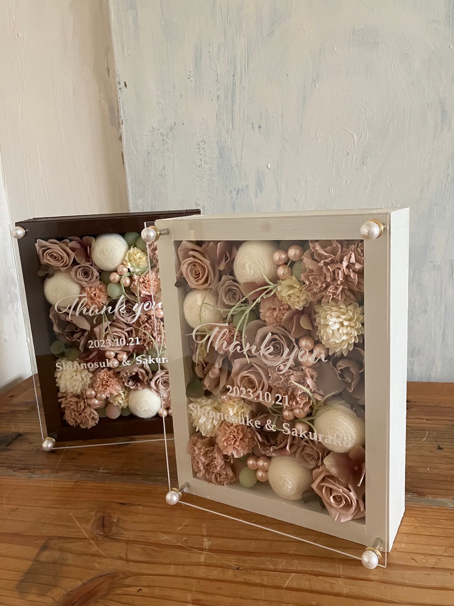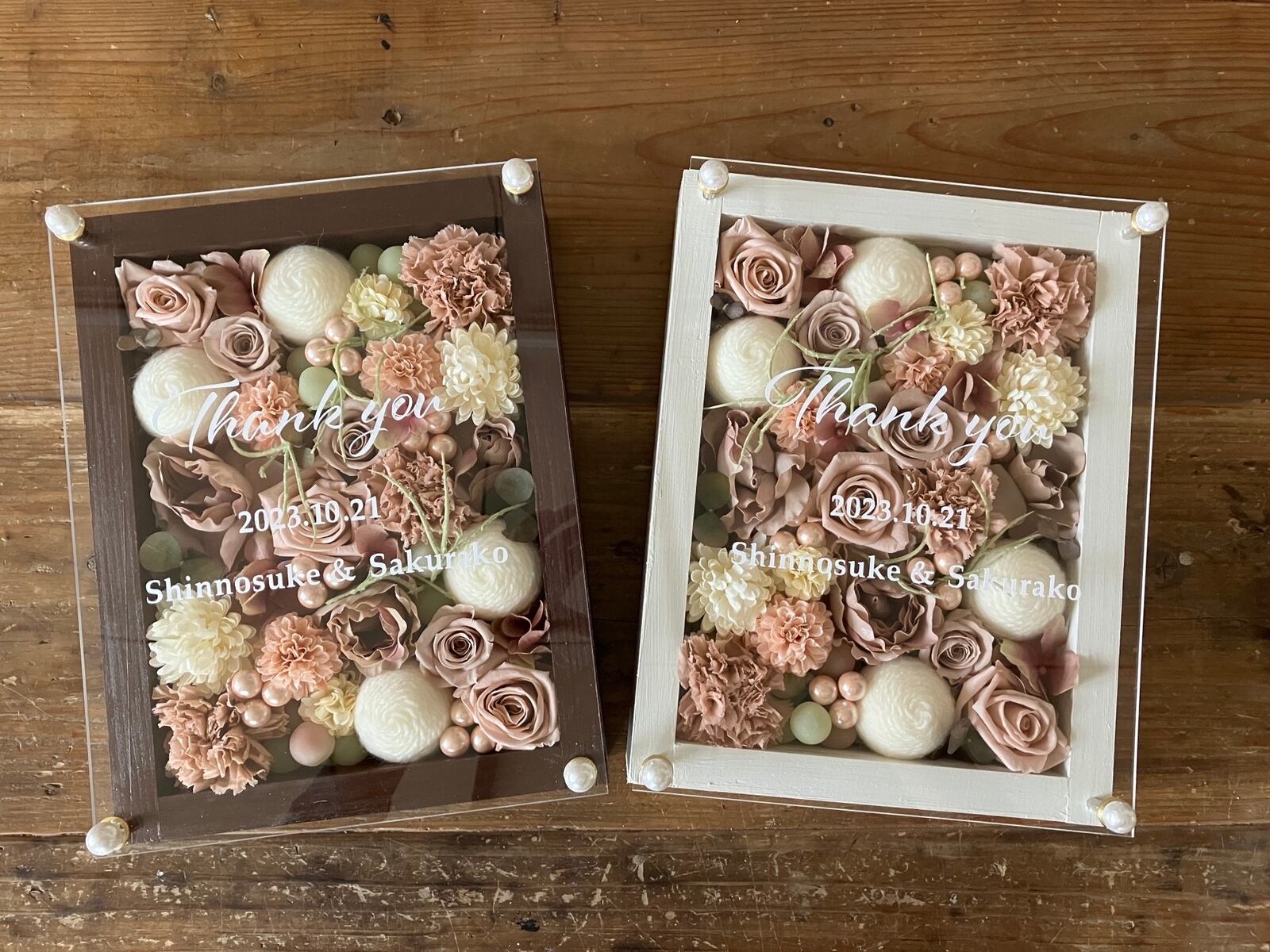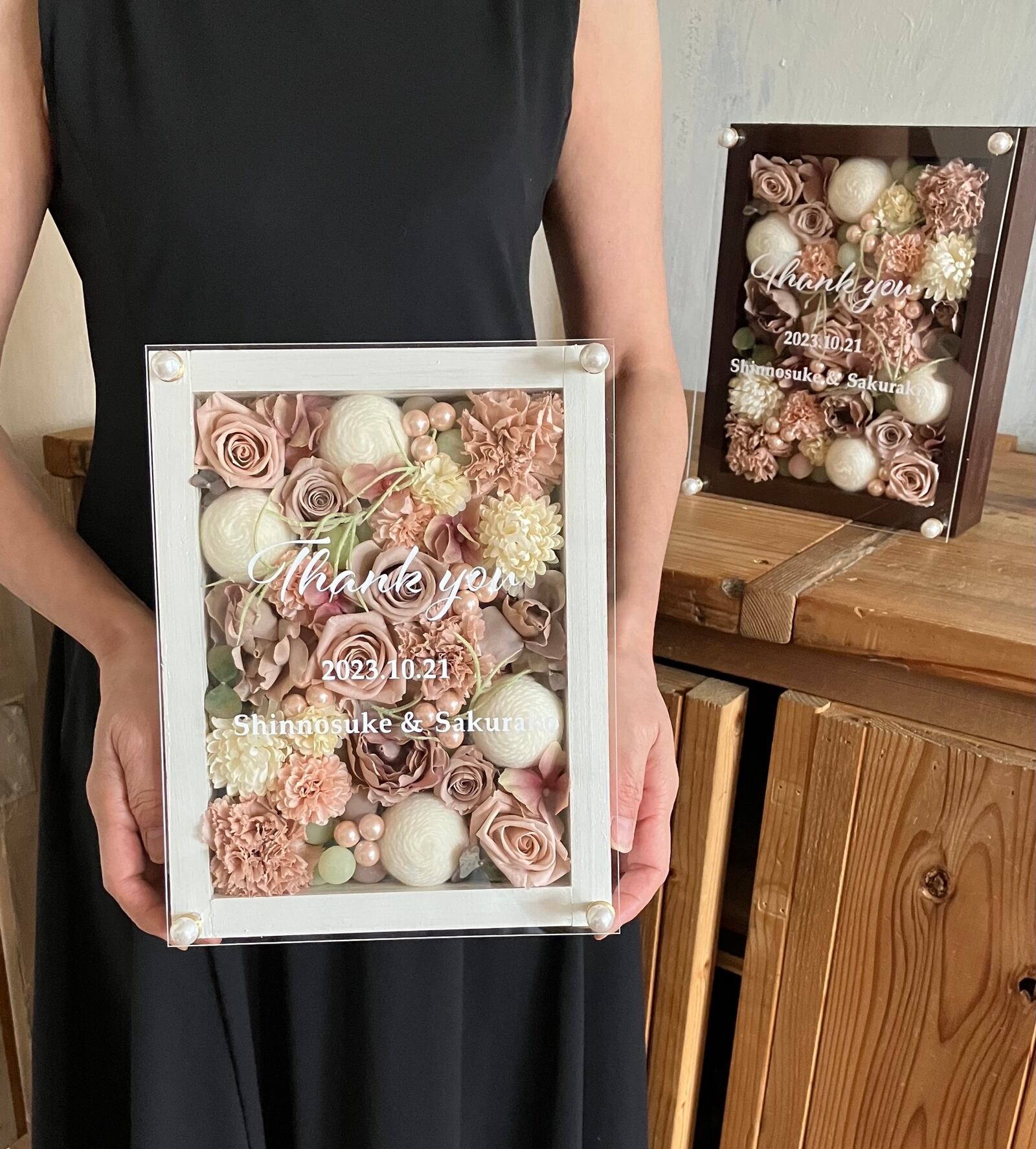 ウッドフレームにプリザーブドフラワーと造花をぎっしり詰め込み、アクリル板にはカッティングシートで名前、挙式日、生まれてから今日までの日数などをお入れします