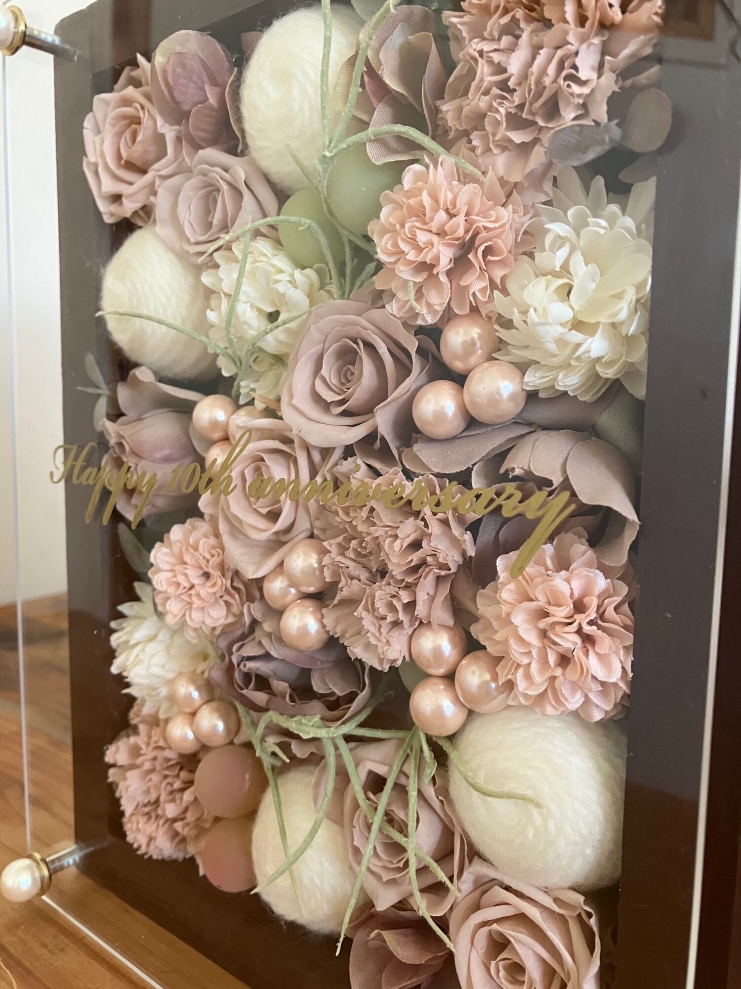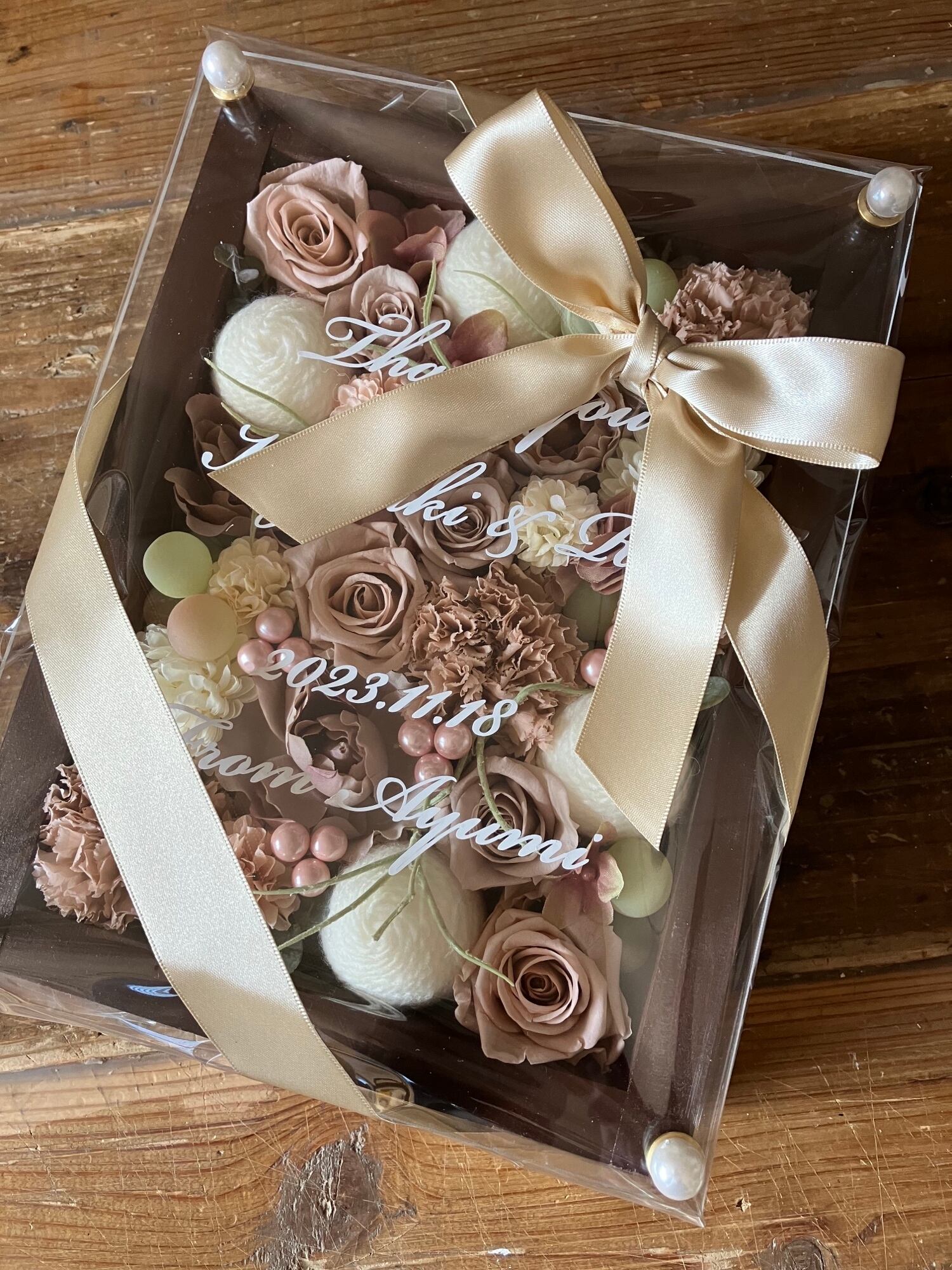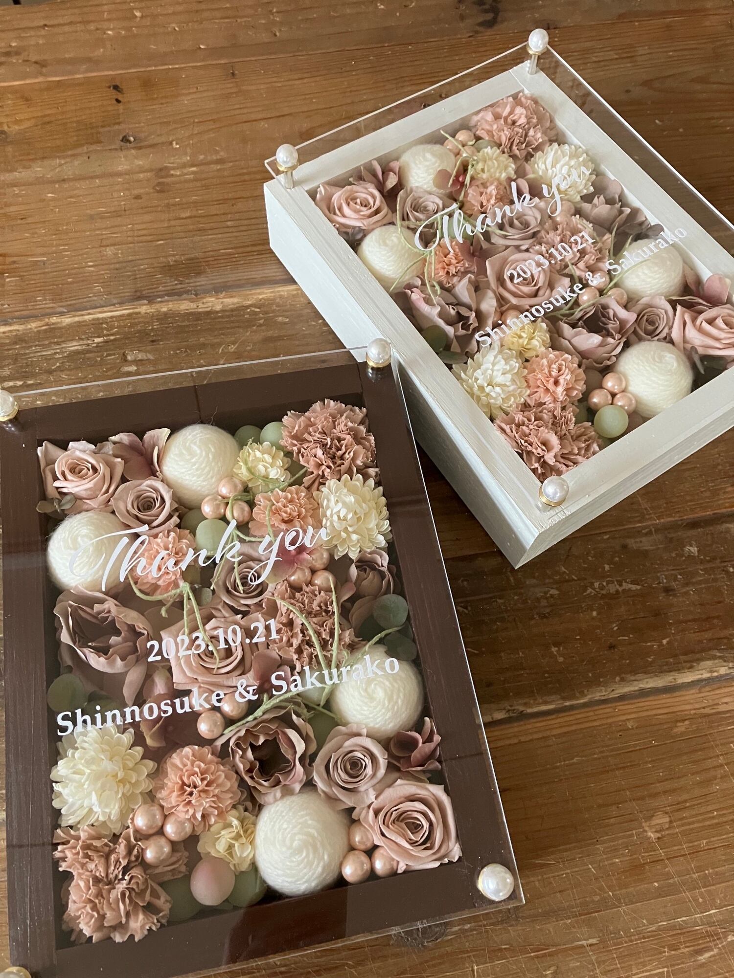 ウッドフレームにプリザーブドフラワーと造花をぎっしり詰め込み、アクリル板にはカッティングシートで名前、挙式日、生まれてから今日までの日数などをお入れします