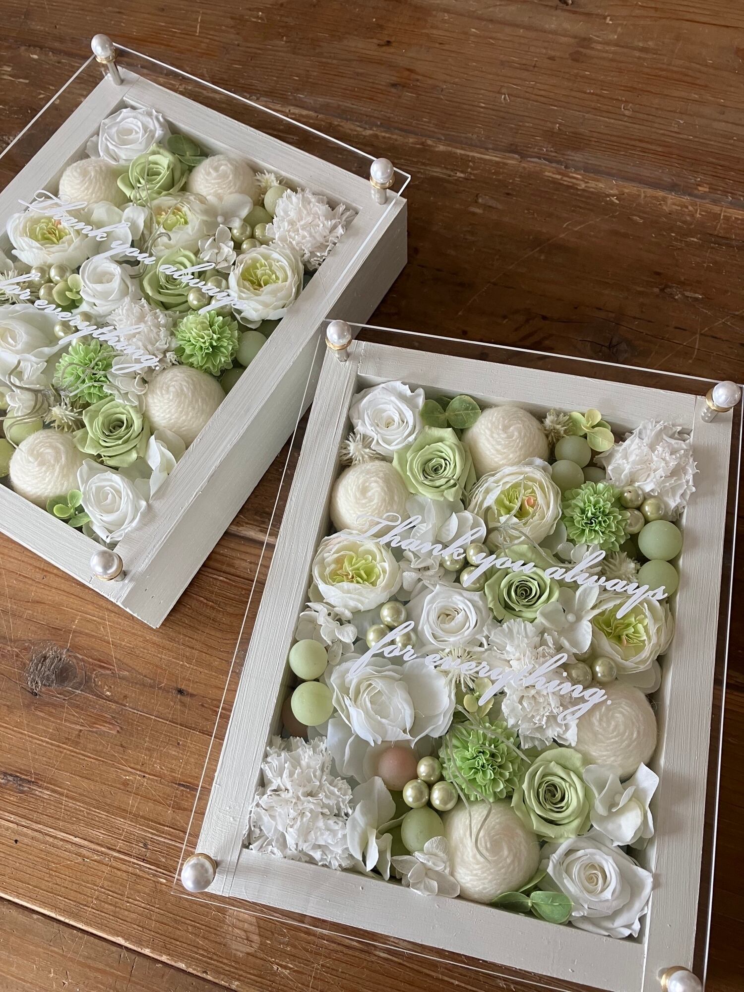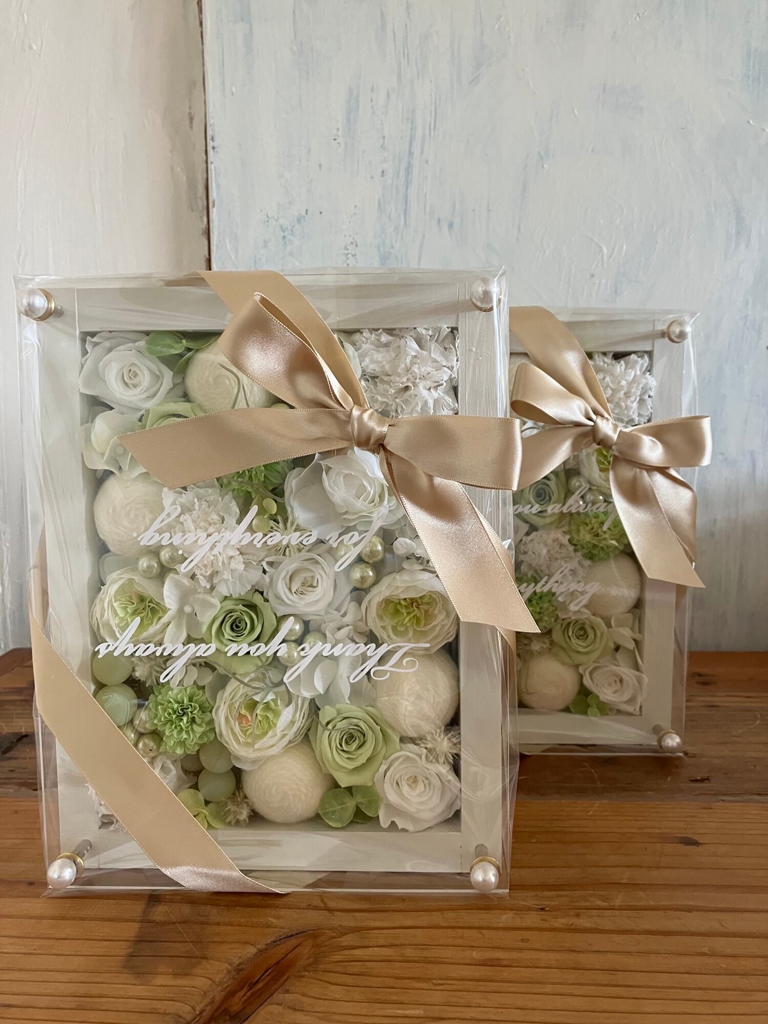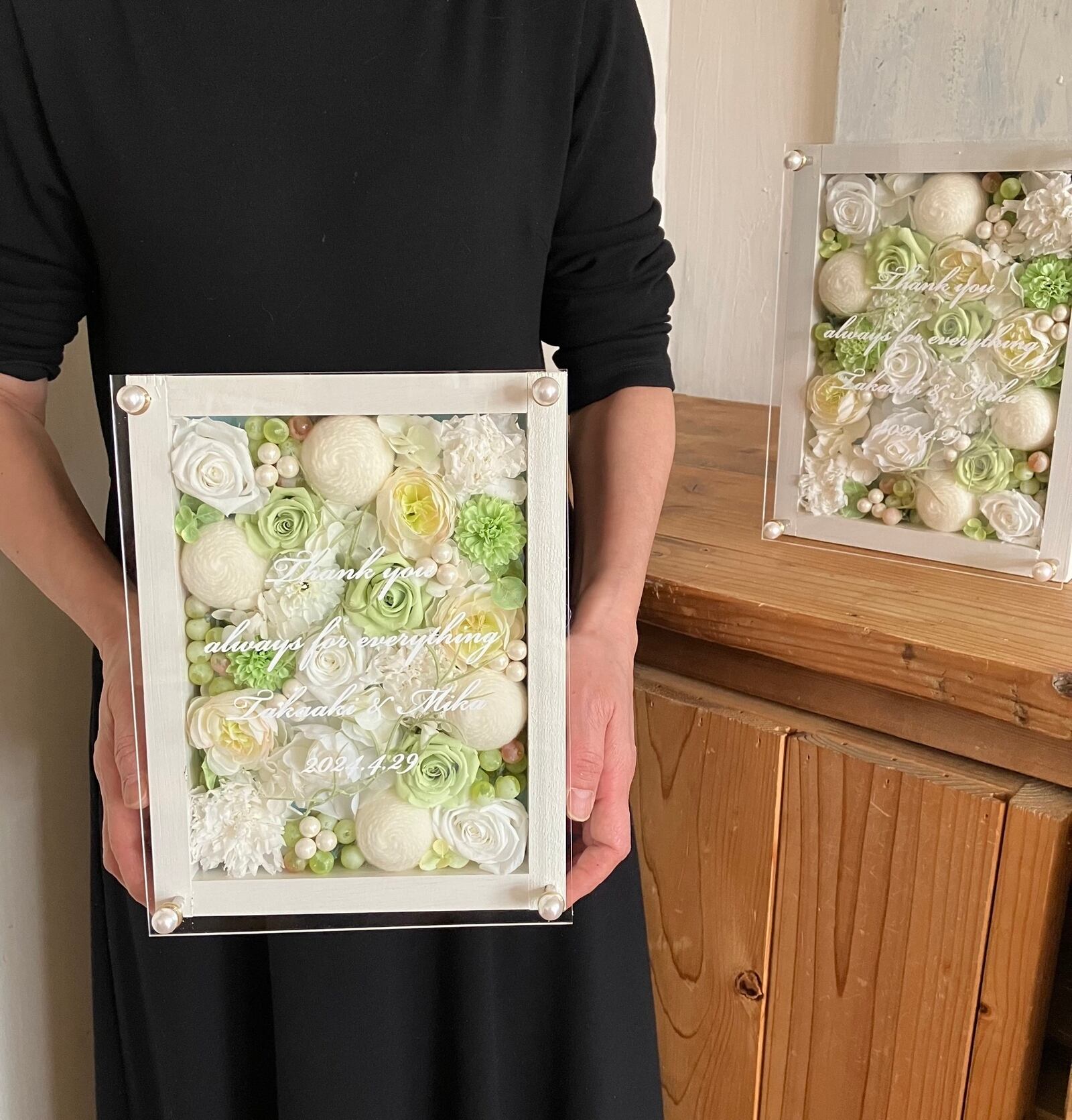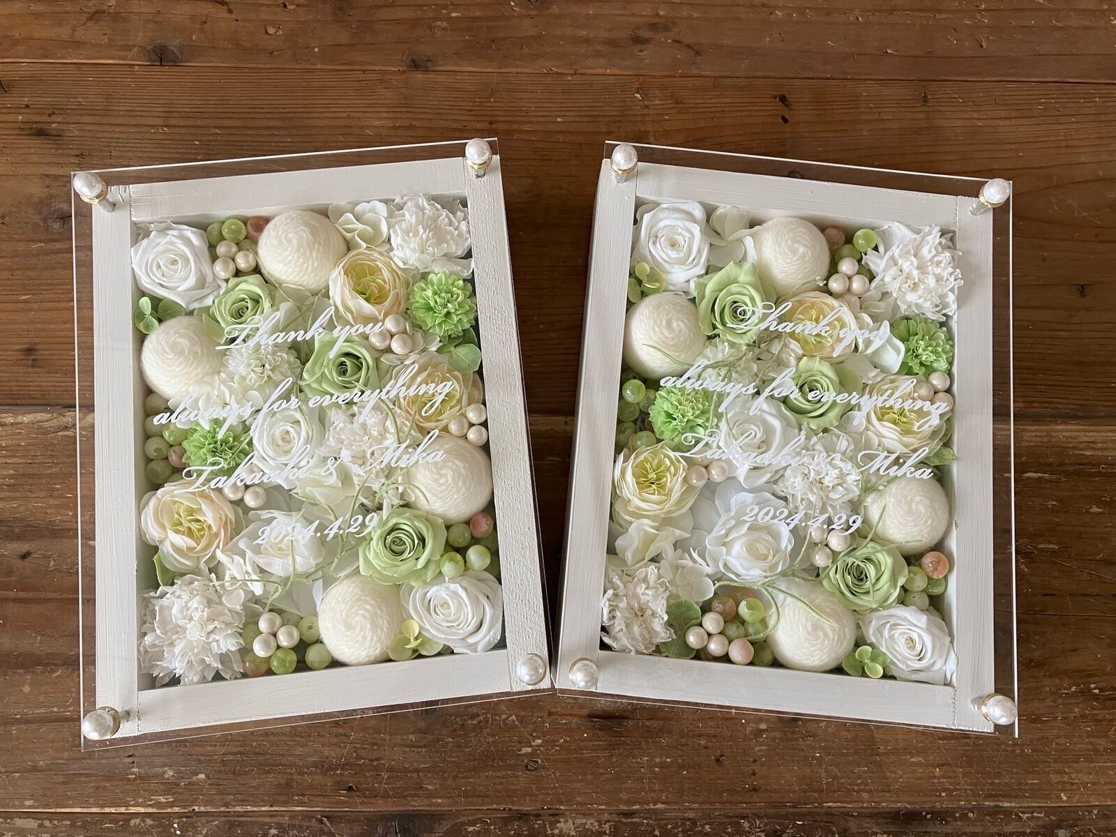 子育て感謝状・両親贈呈品 2個セット【名入れ】プリザーブドフラワーアレンジ ウッドフレーム 白木枠〈白グリーンペア〉結婚式 ギフト プライム