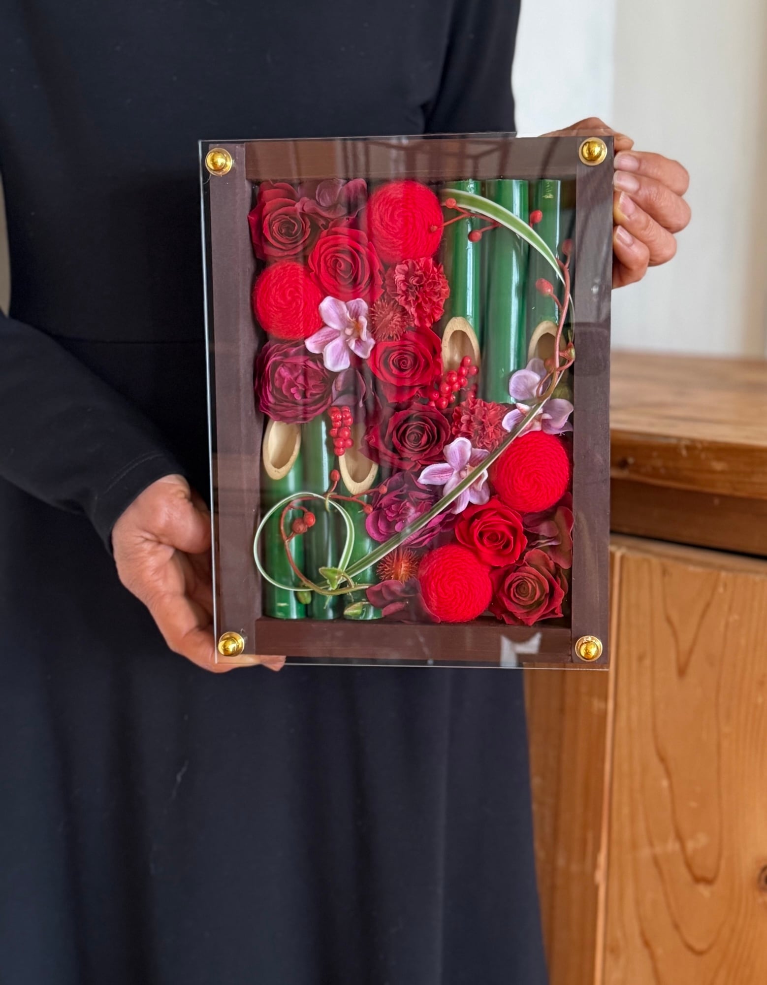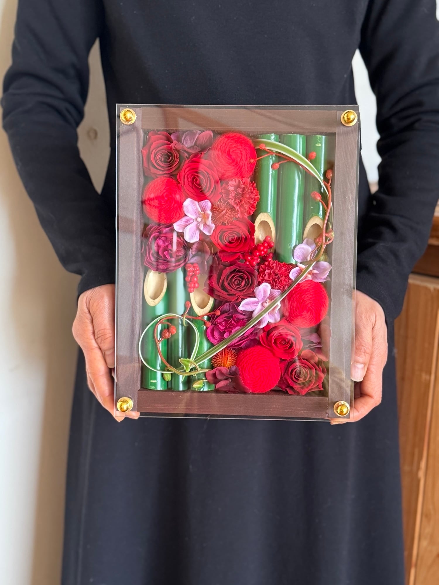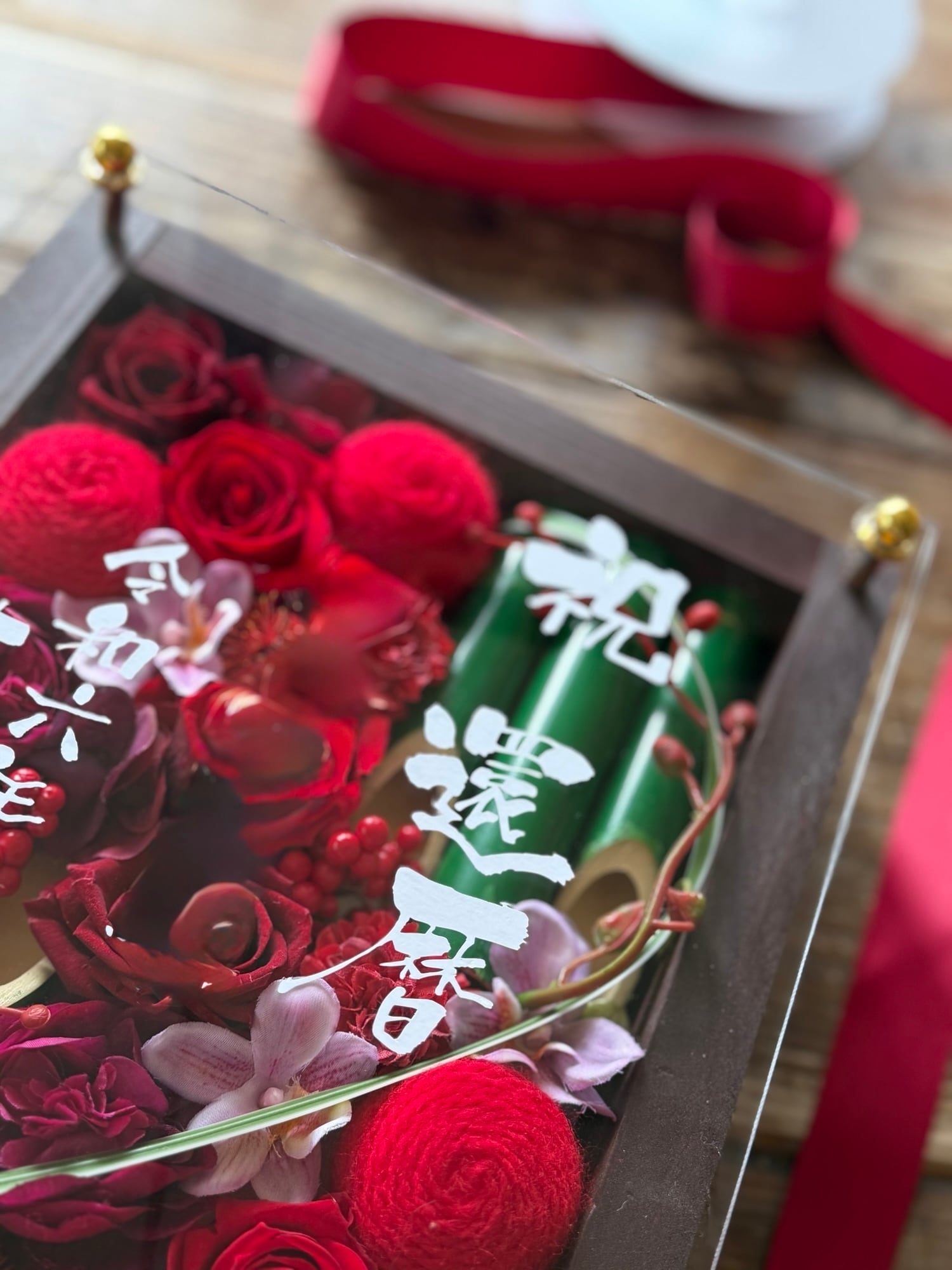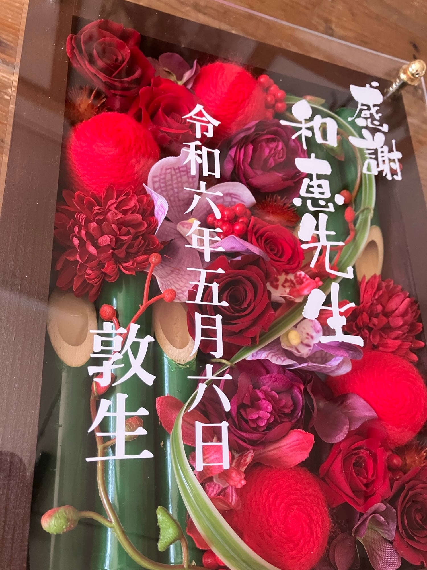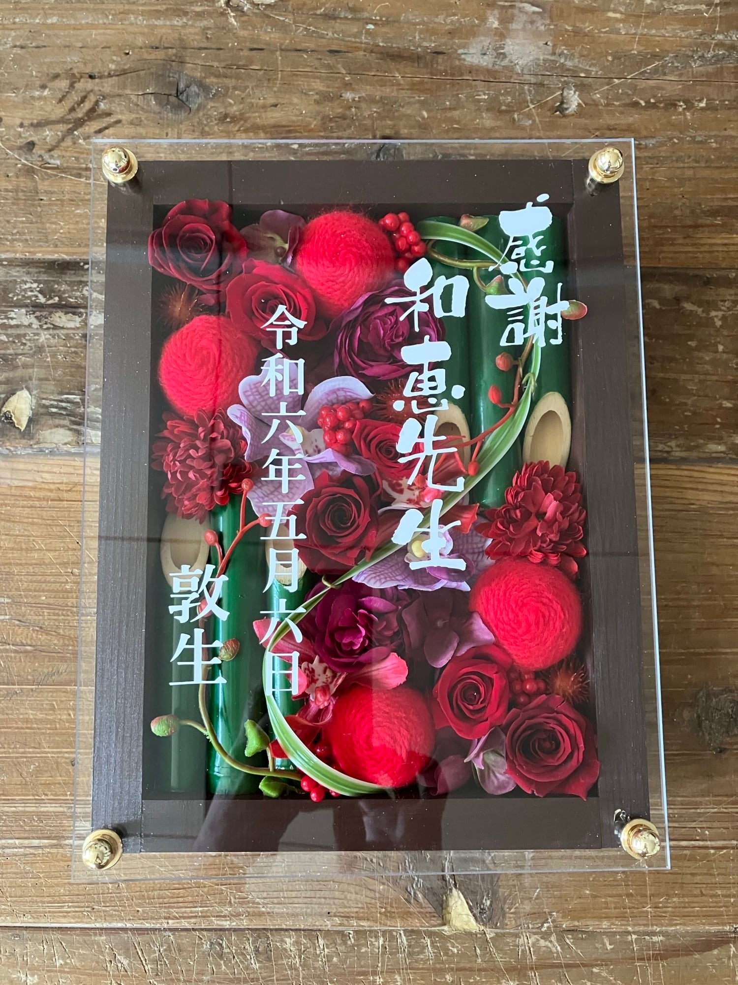 竹を使った赤い華やかな名入れお花フレーム