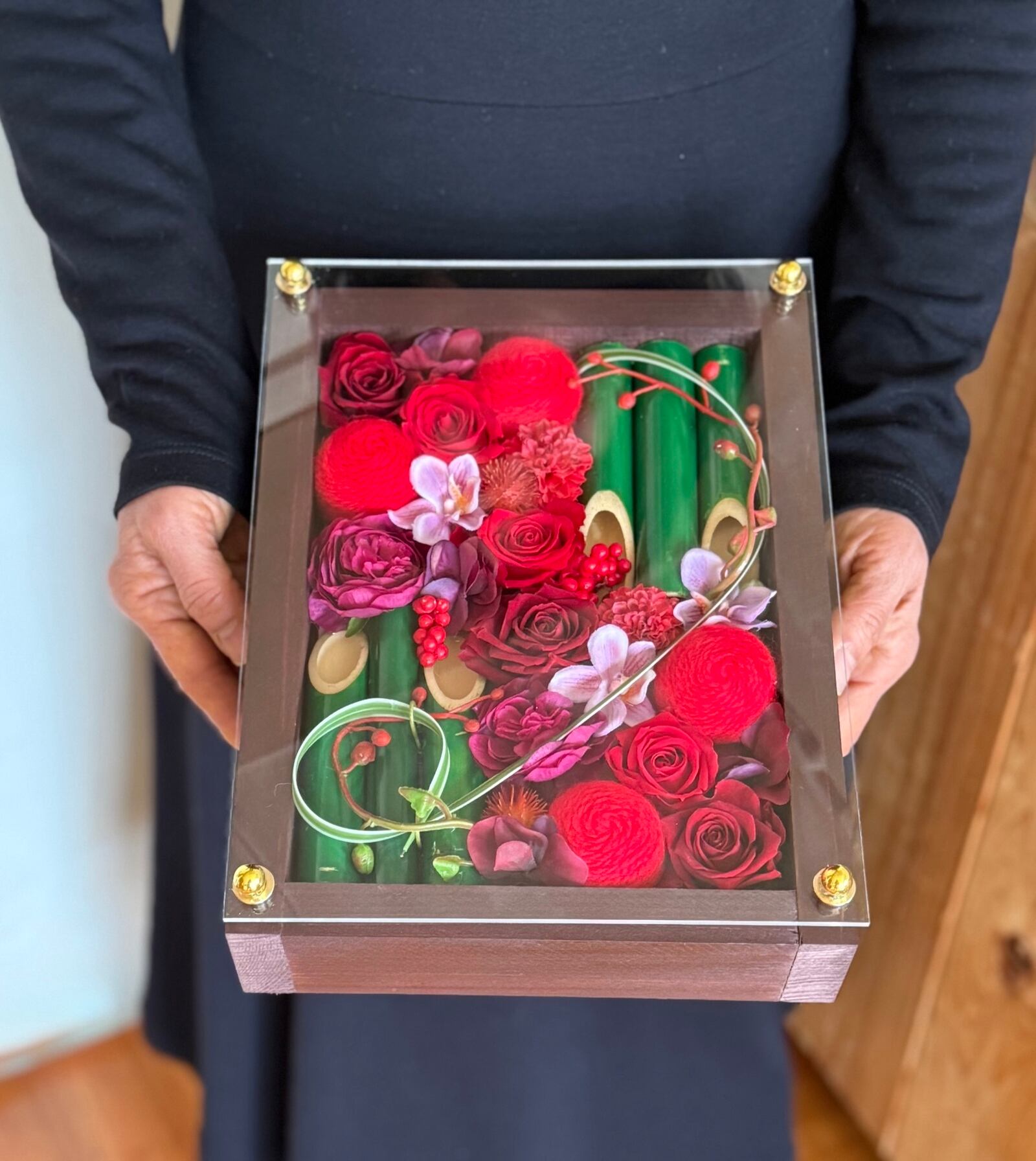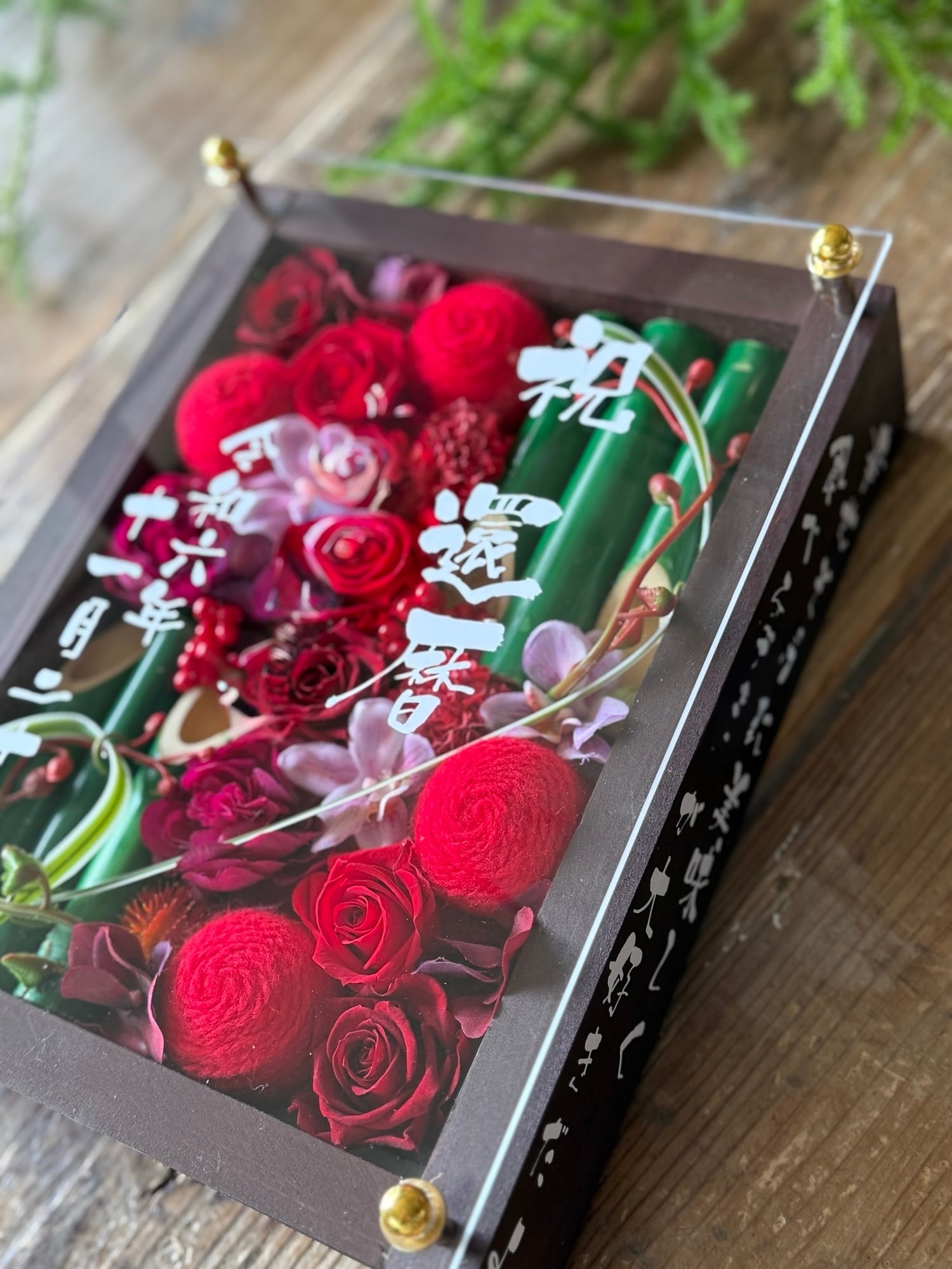 還暦祝い・退職祝い【名入れ】プリザーブドフラワーアレンジ ウッドフレーム 竹 茶木枠〈赤〉