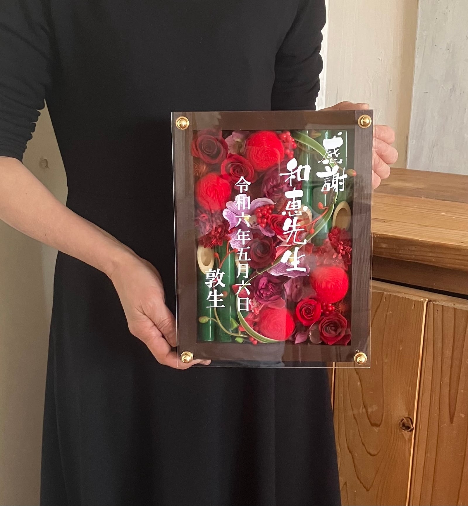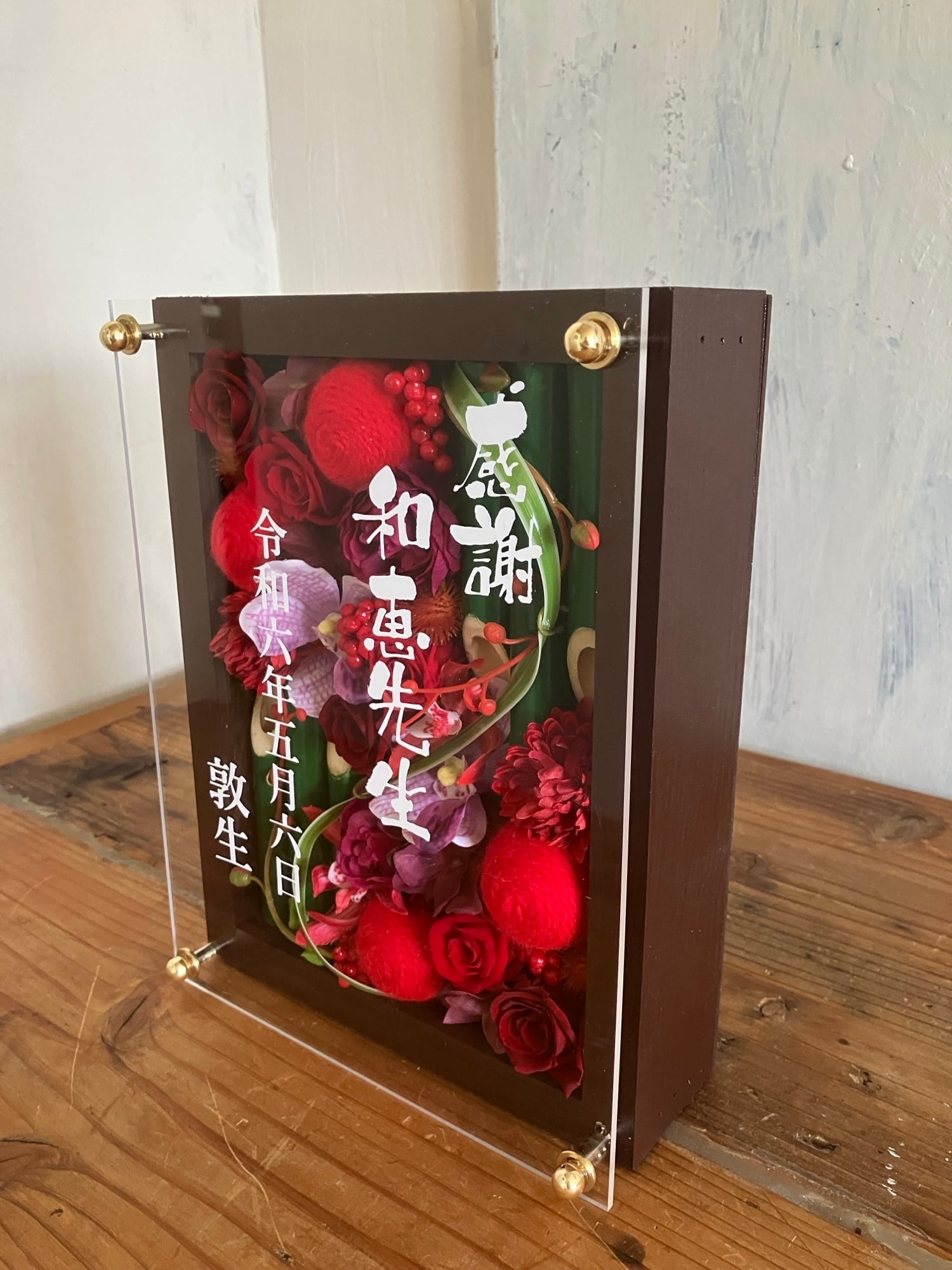 ウッドフレームにプリザーブドフラワーと造花をバランスよく詰め込み、アクリル板にはカッティングシートでメッセージをお入れします。
