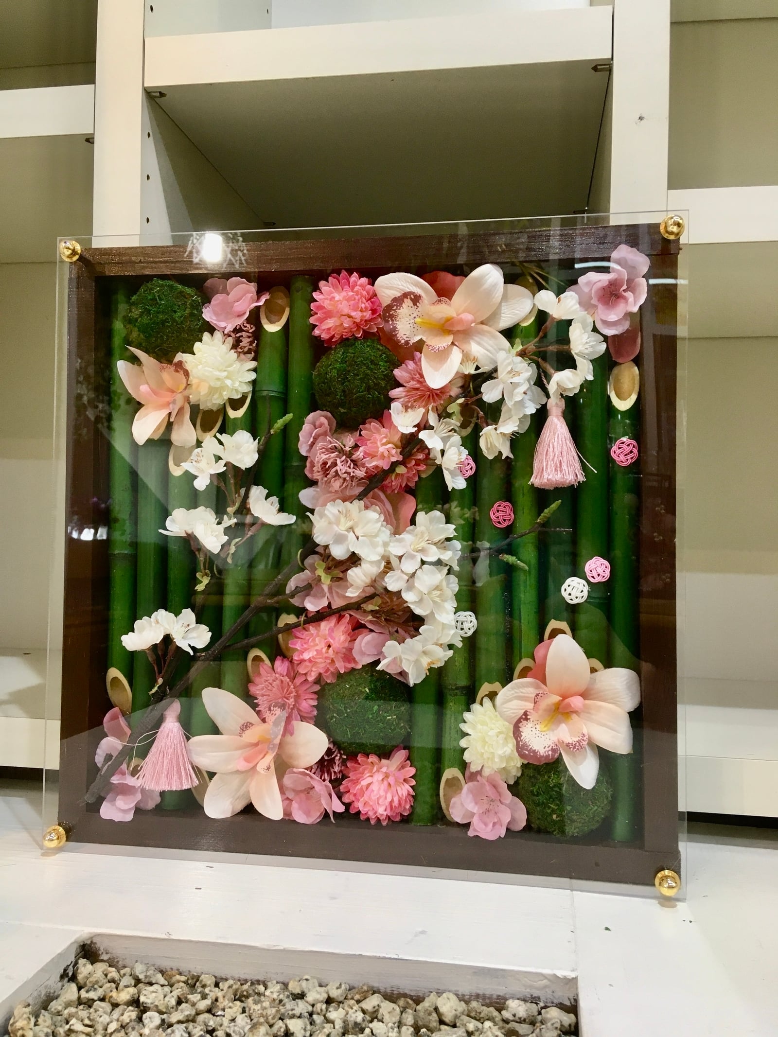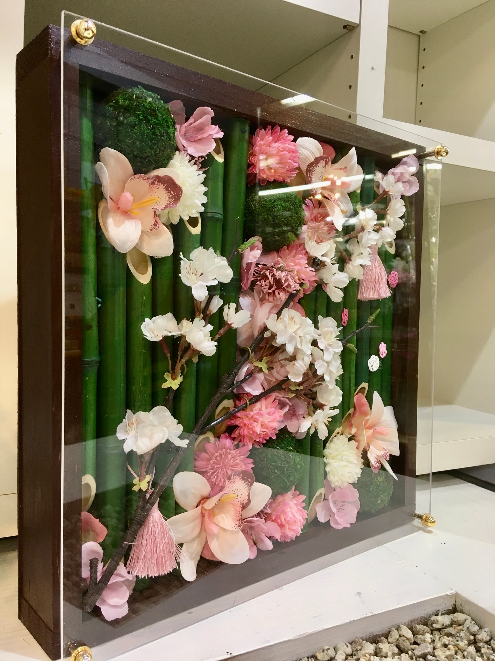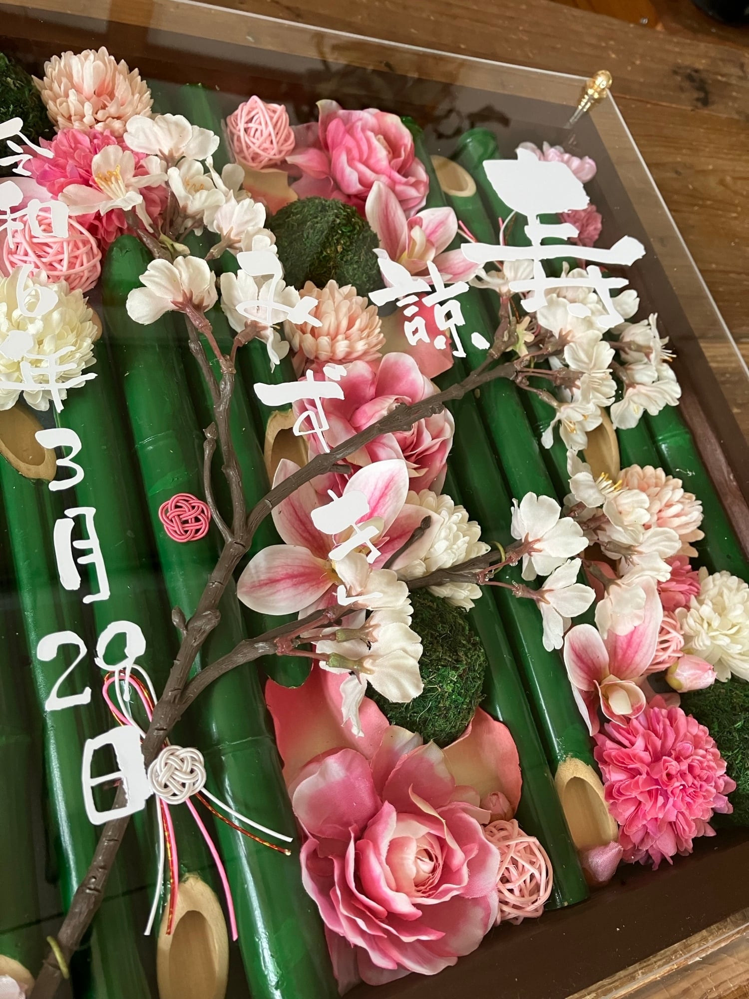 茶色のウッドフレームに竹と春のお花を