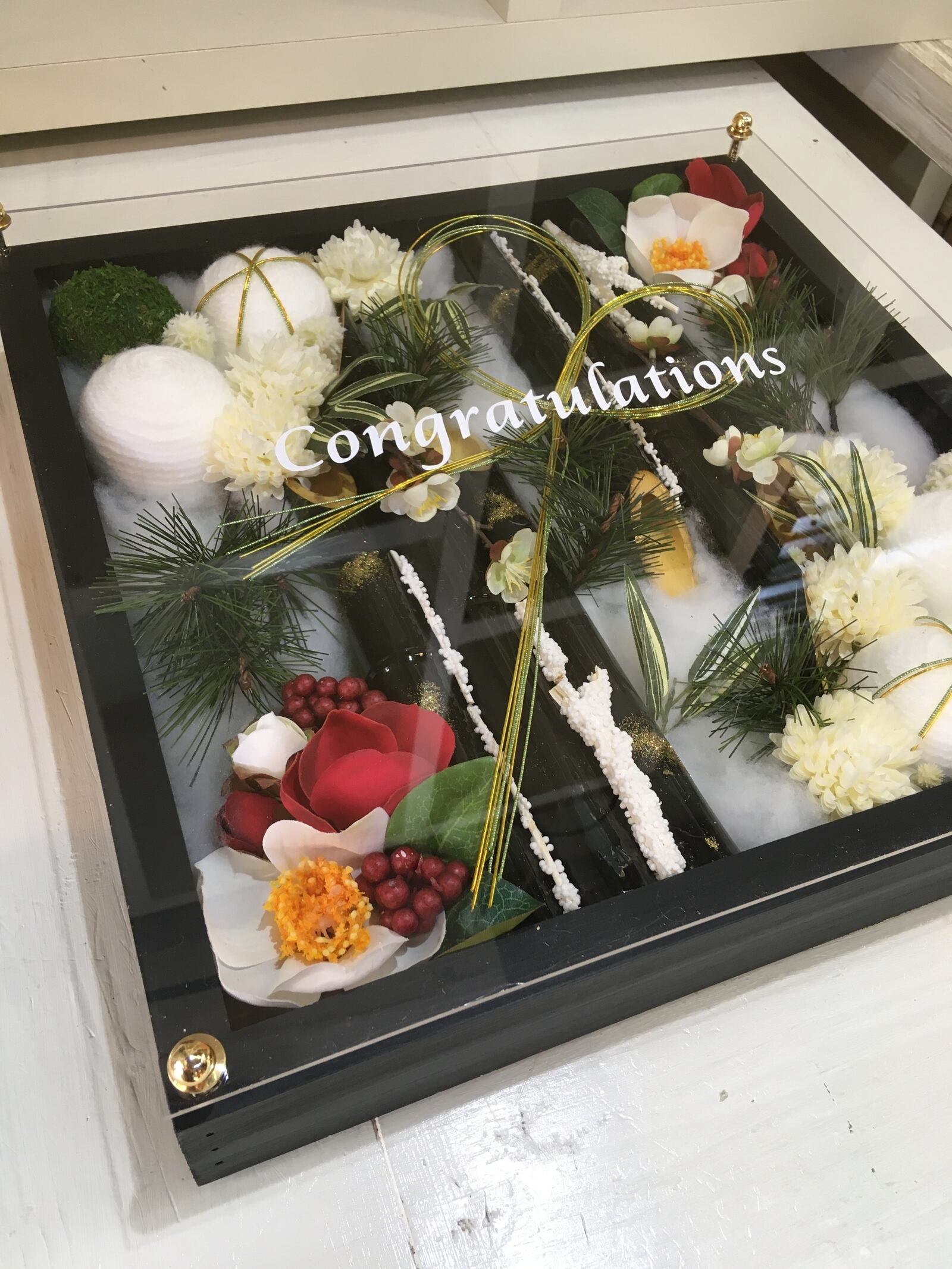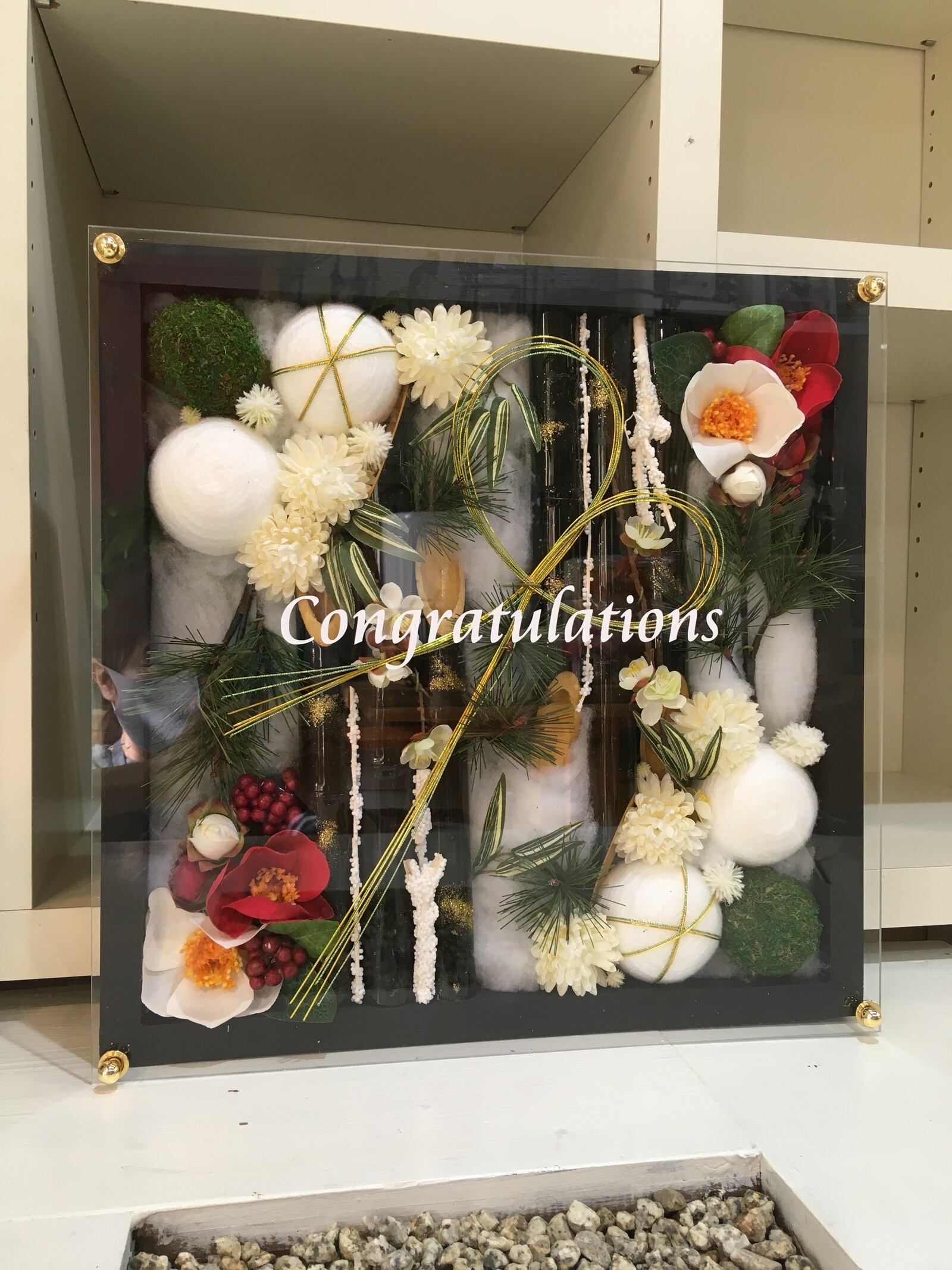 黒色のウッドフレームに黒竹と松や椿などのお花を