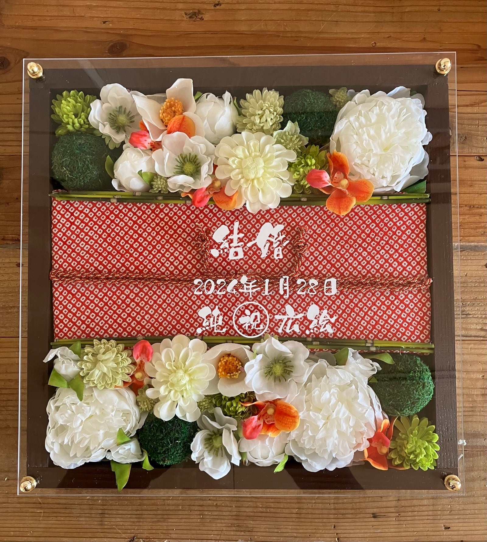 茶色のウッドフレームにちりめん布や組紐・和風のお花を