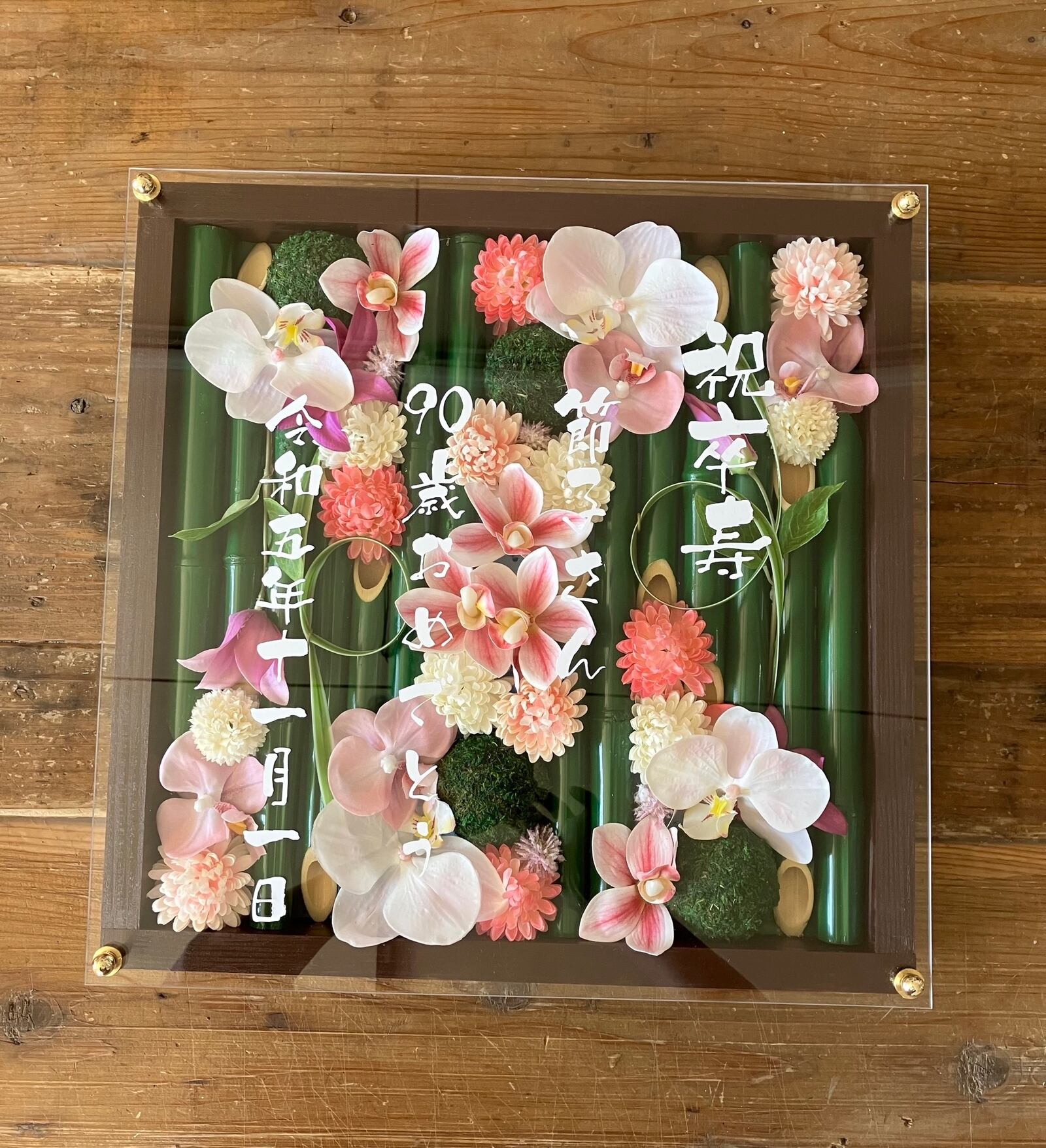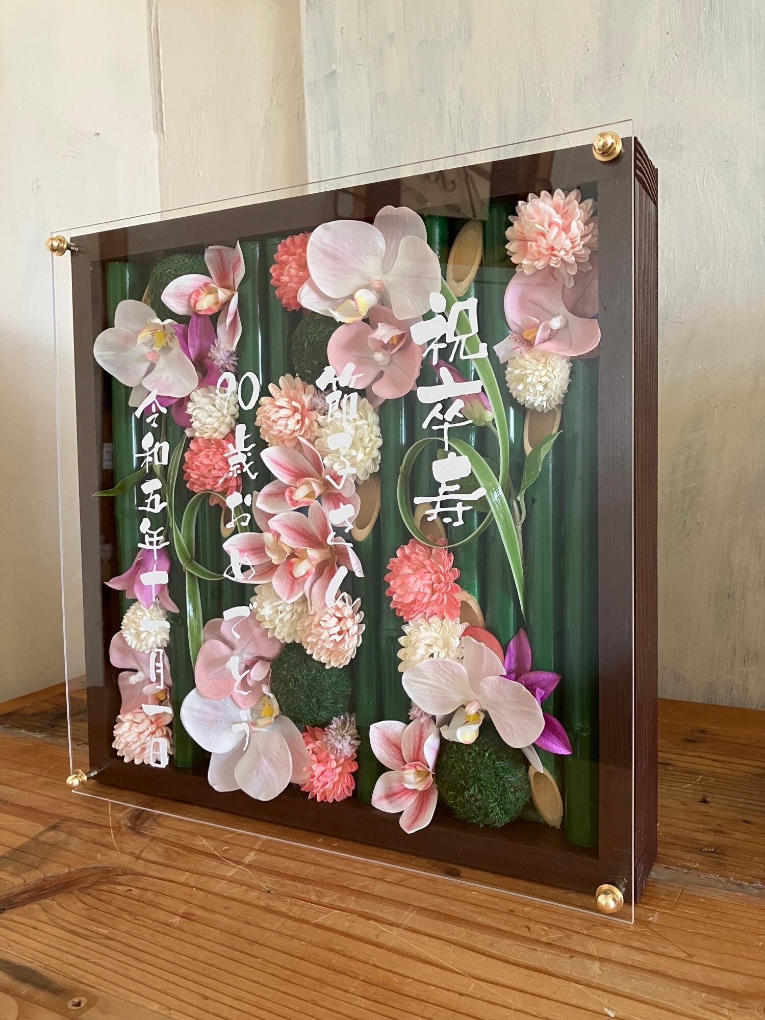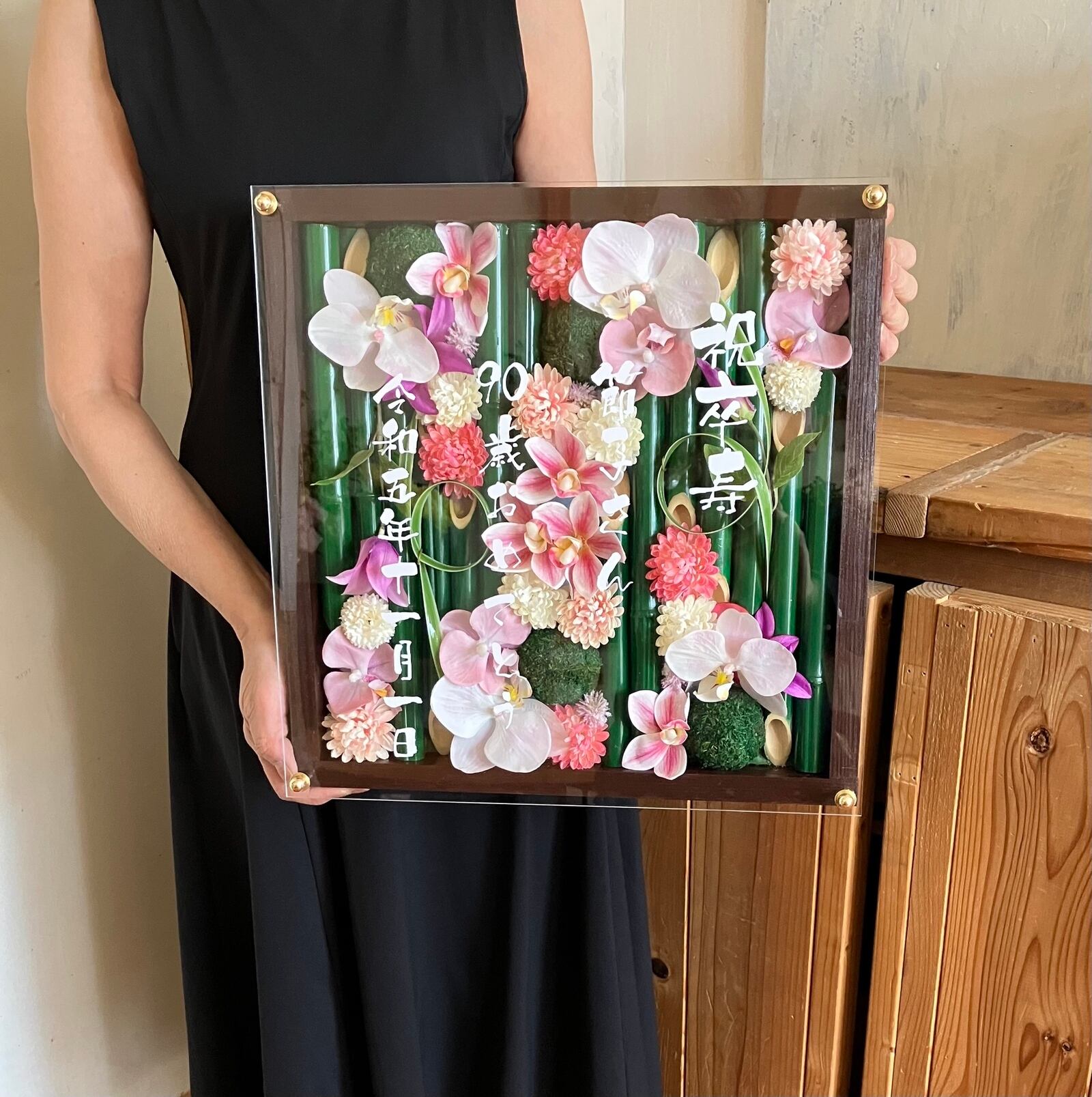 開店祝い・周年祝い・結婚祝い・和婚ウェルカムボード【名入れ】ウッドフレーム 竹 胡蝶蘭 茶木枠〈白ピンク〉