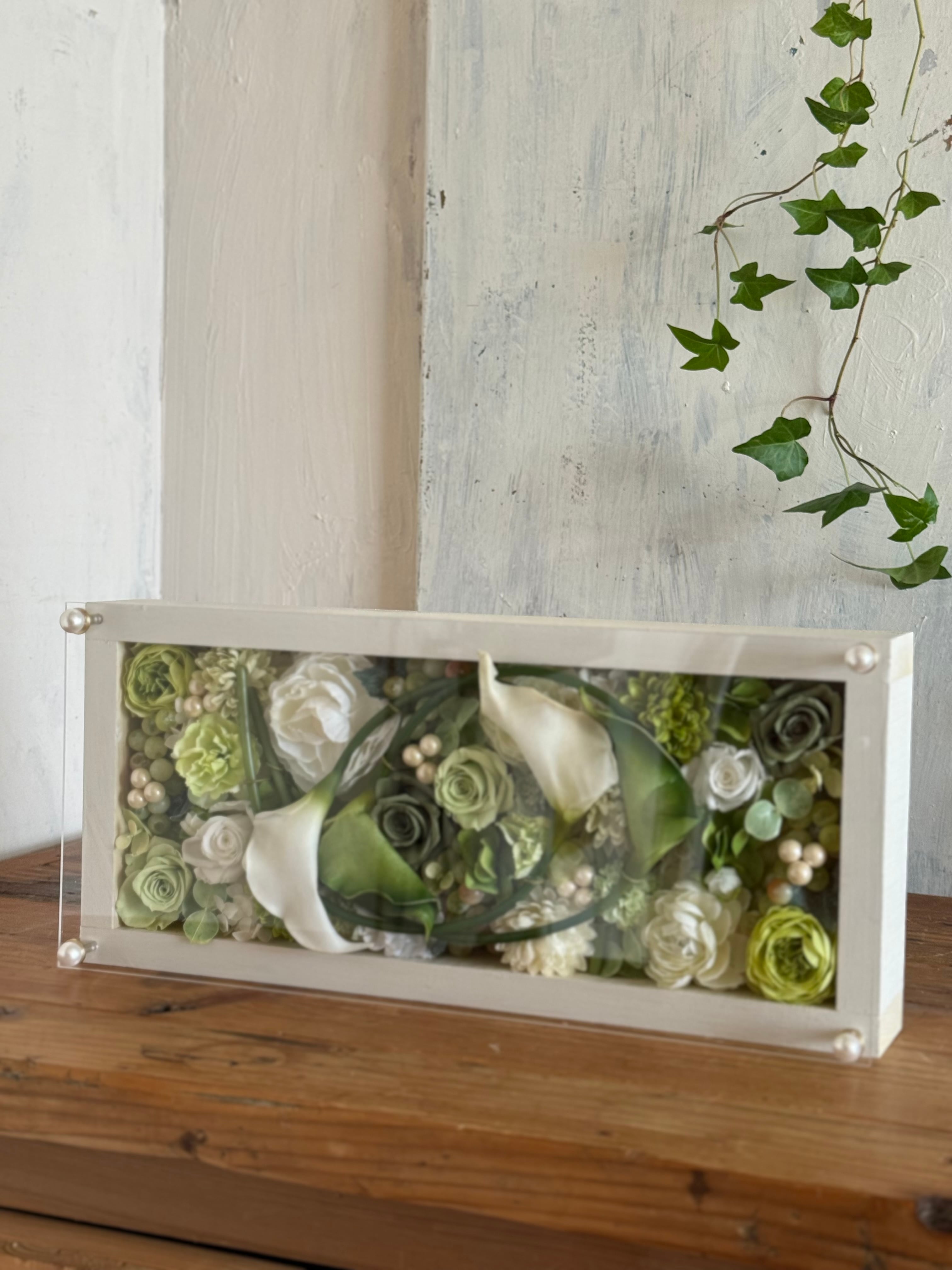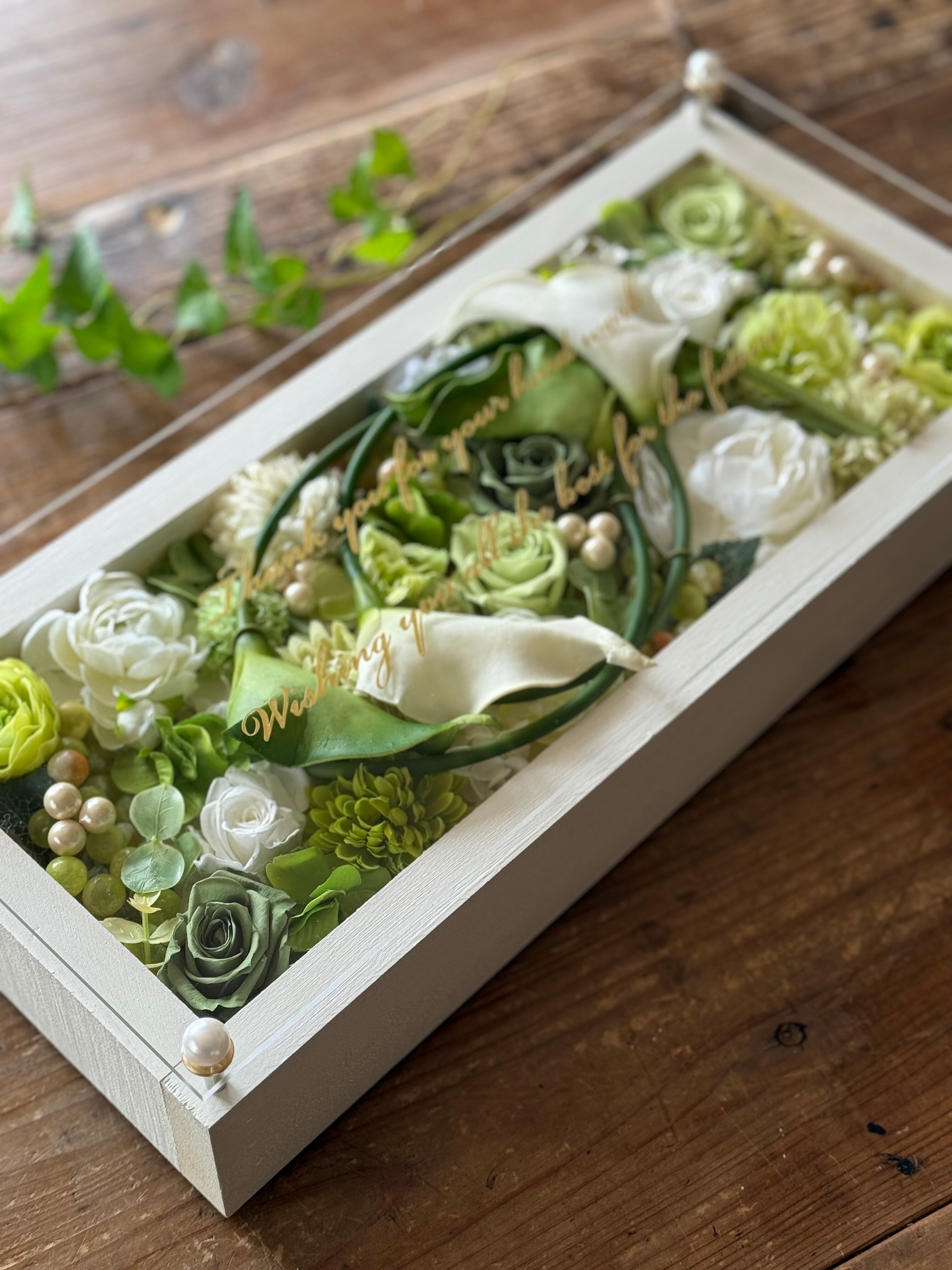退職祝い 開店祝い 開院祝い サロンオープン祝い【名入れ】プリザーブドフラワーアレンジ ウッドフレーム 白木枠ロング 横置きタイプ〈白グリーン〉