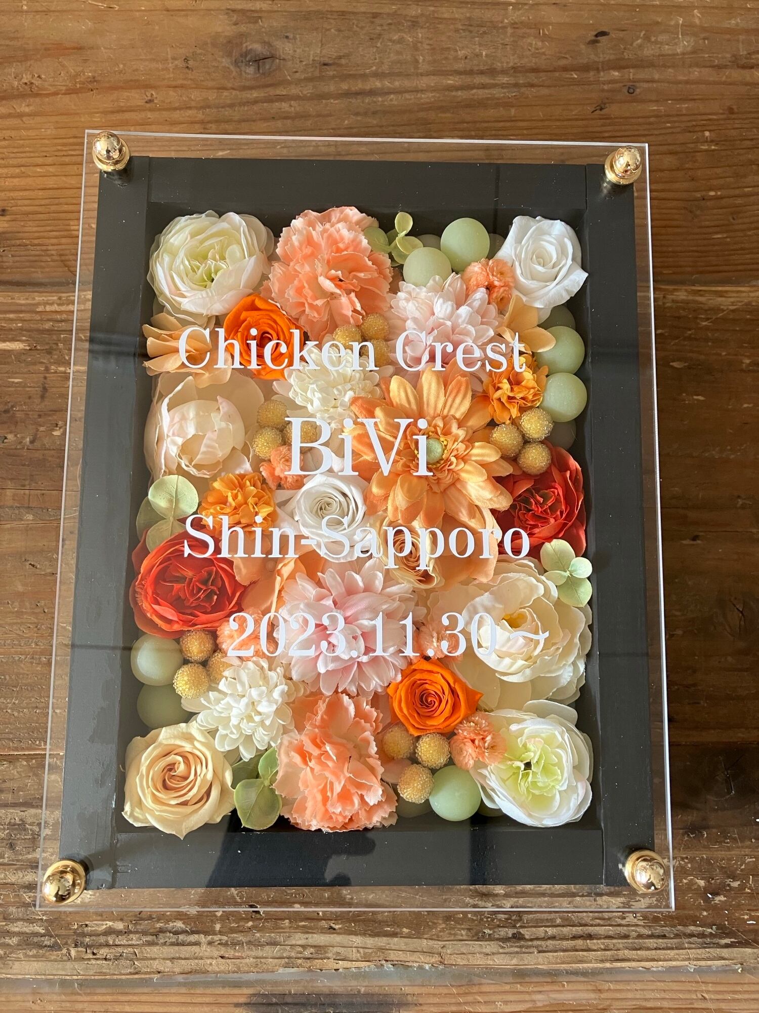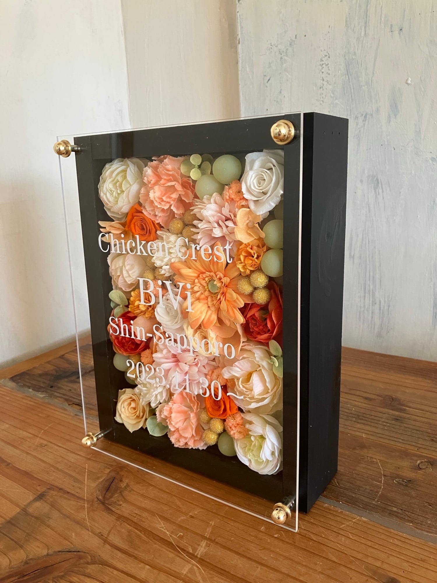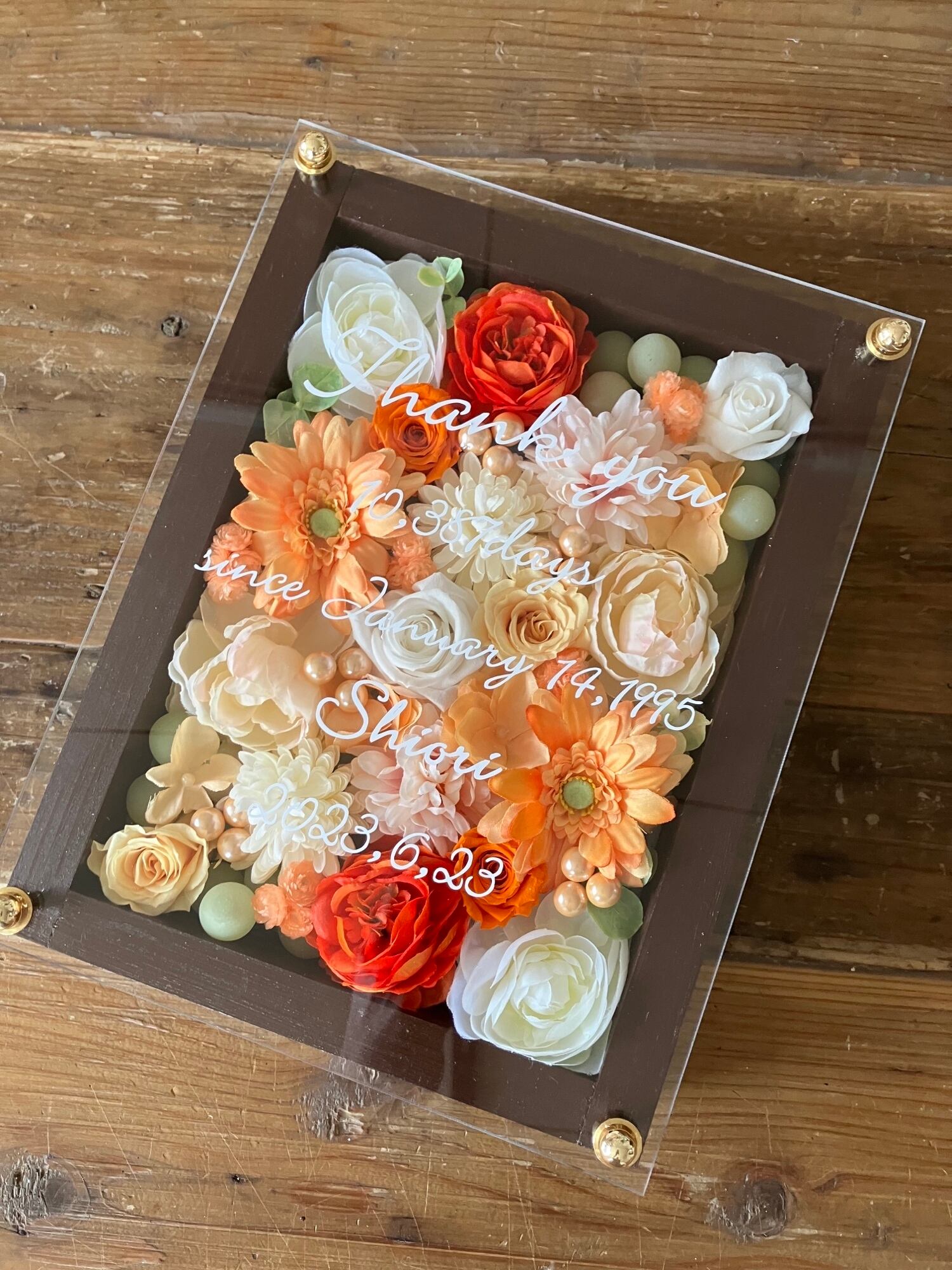 ウッドフレームにプリザーブドフラワーと造花をぎっしり詰め込みアクリル板にはカッティングシートでメッセージをお入れします。