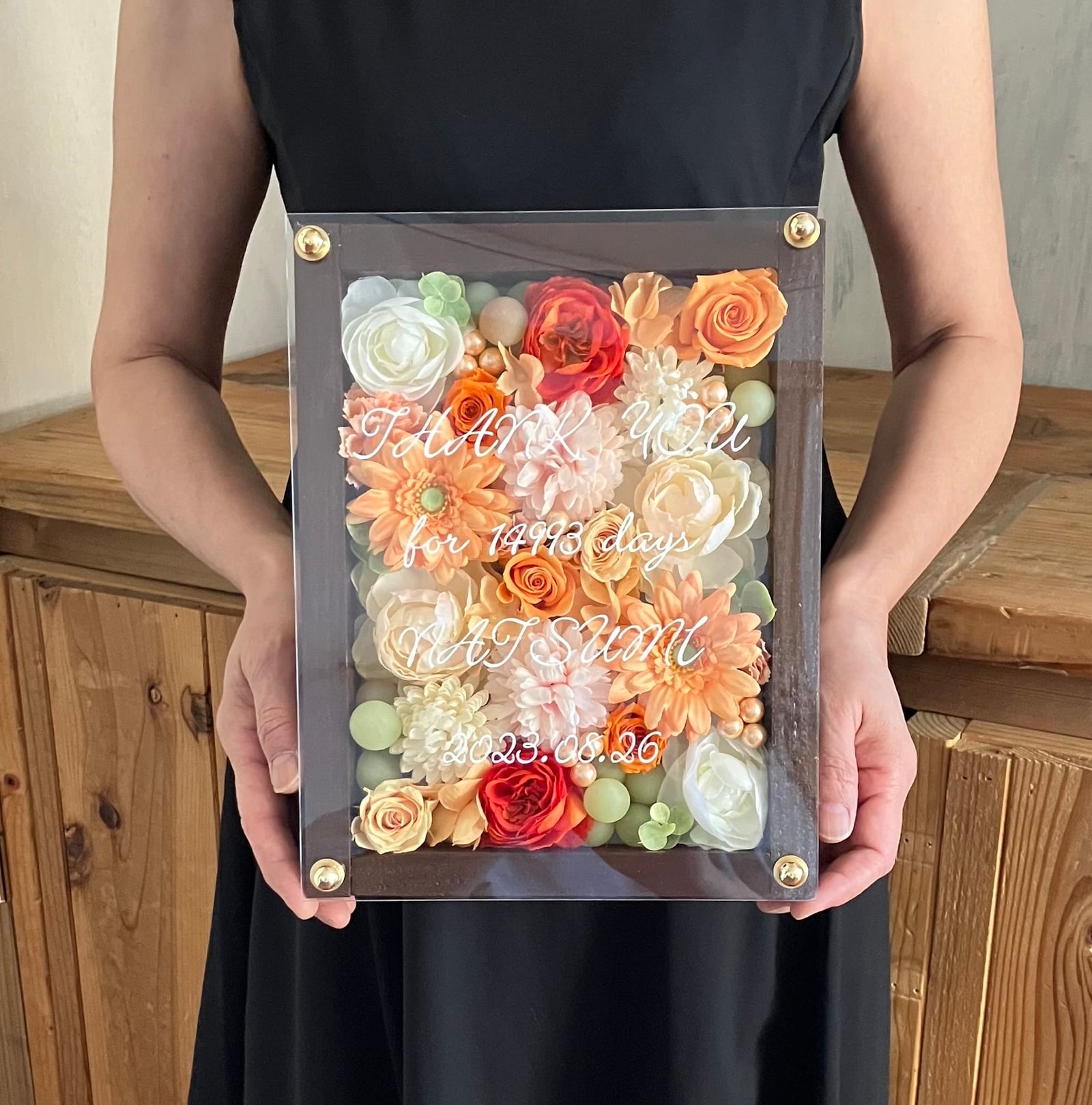 結婚祝い・結婚記念日祝い・退職祝い・サロンオープン祝い・開店祝い【名入れ】プリザーブドフラワーアレンジ ウッドフレーム 木枠〈オレンジ白ベージュ〉