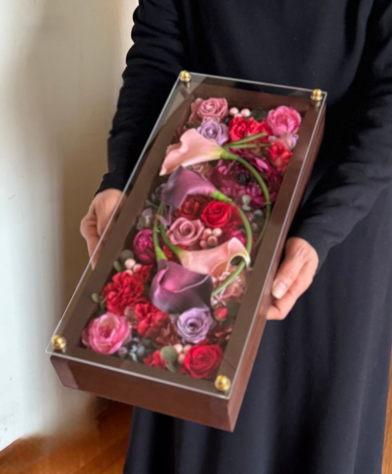還暦祝い・退職祝い・金婚式祝い・周年祝い【名入れ ゴールド文字】プリザーブドフラワーアレンジ ウッドフレーム ロング木枠〈ボルドー〉