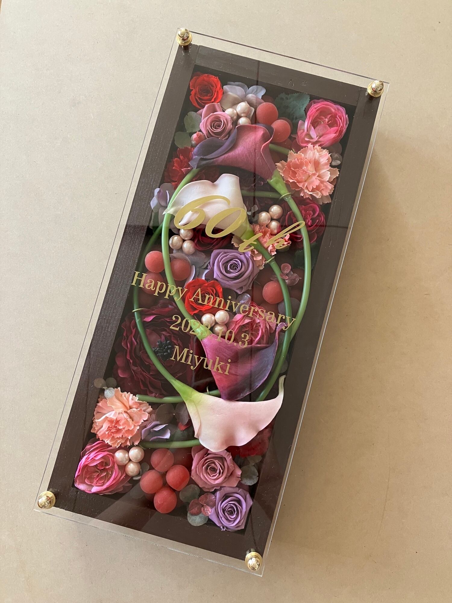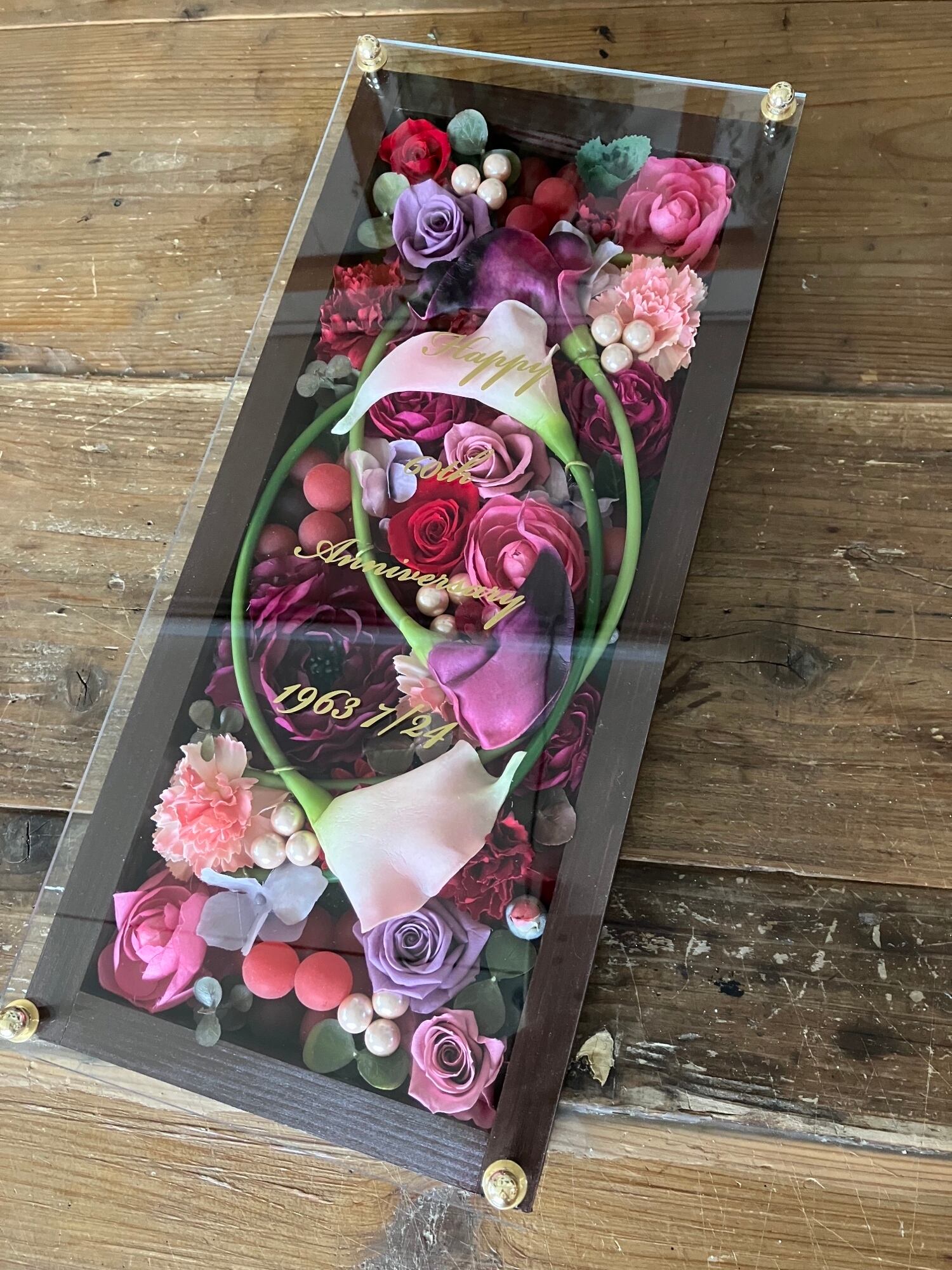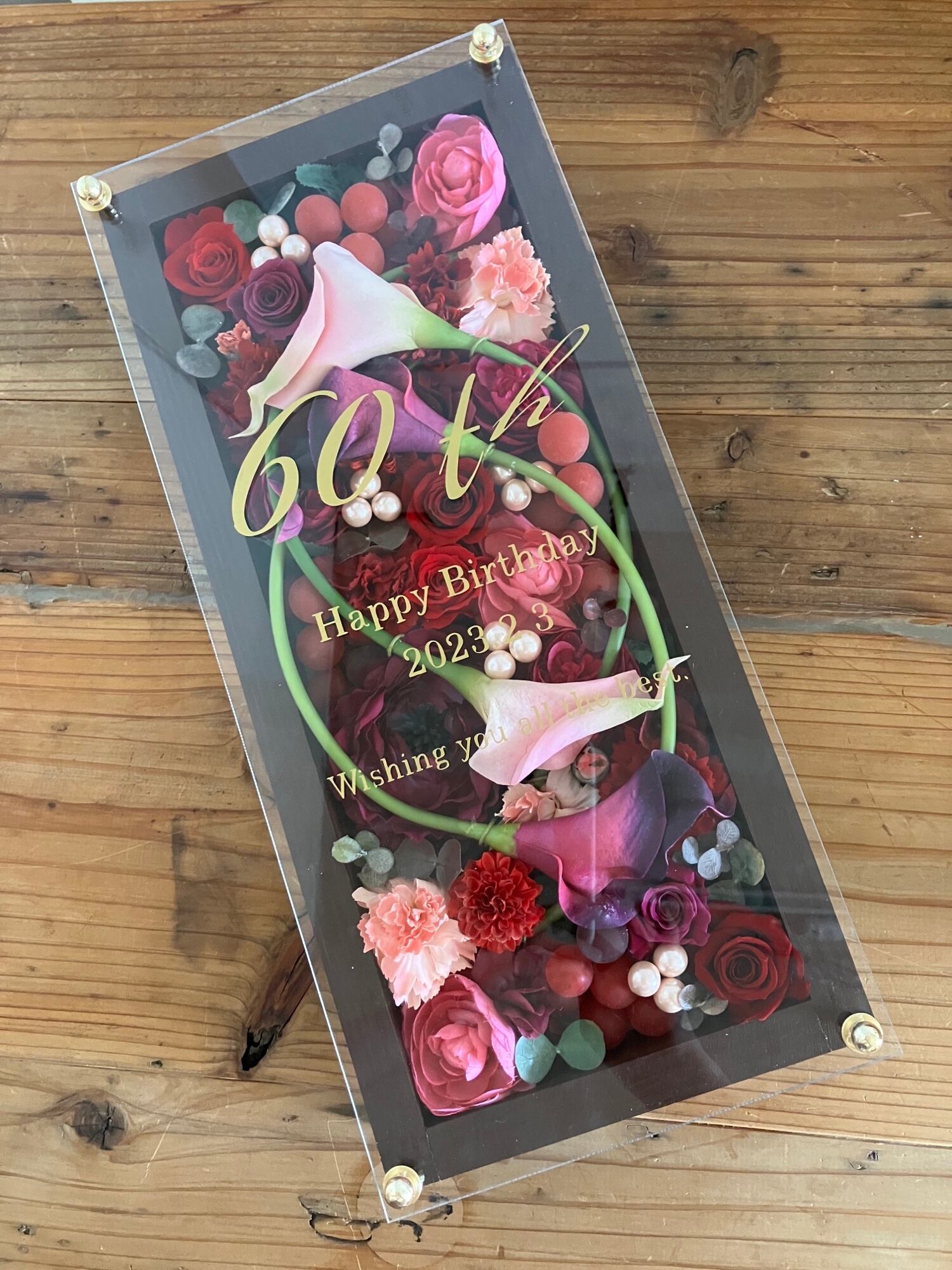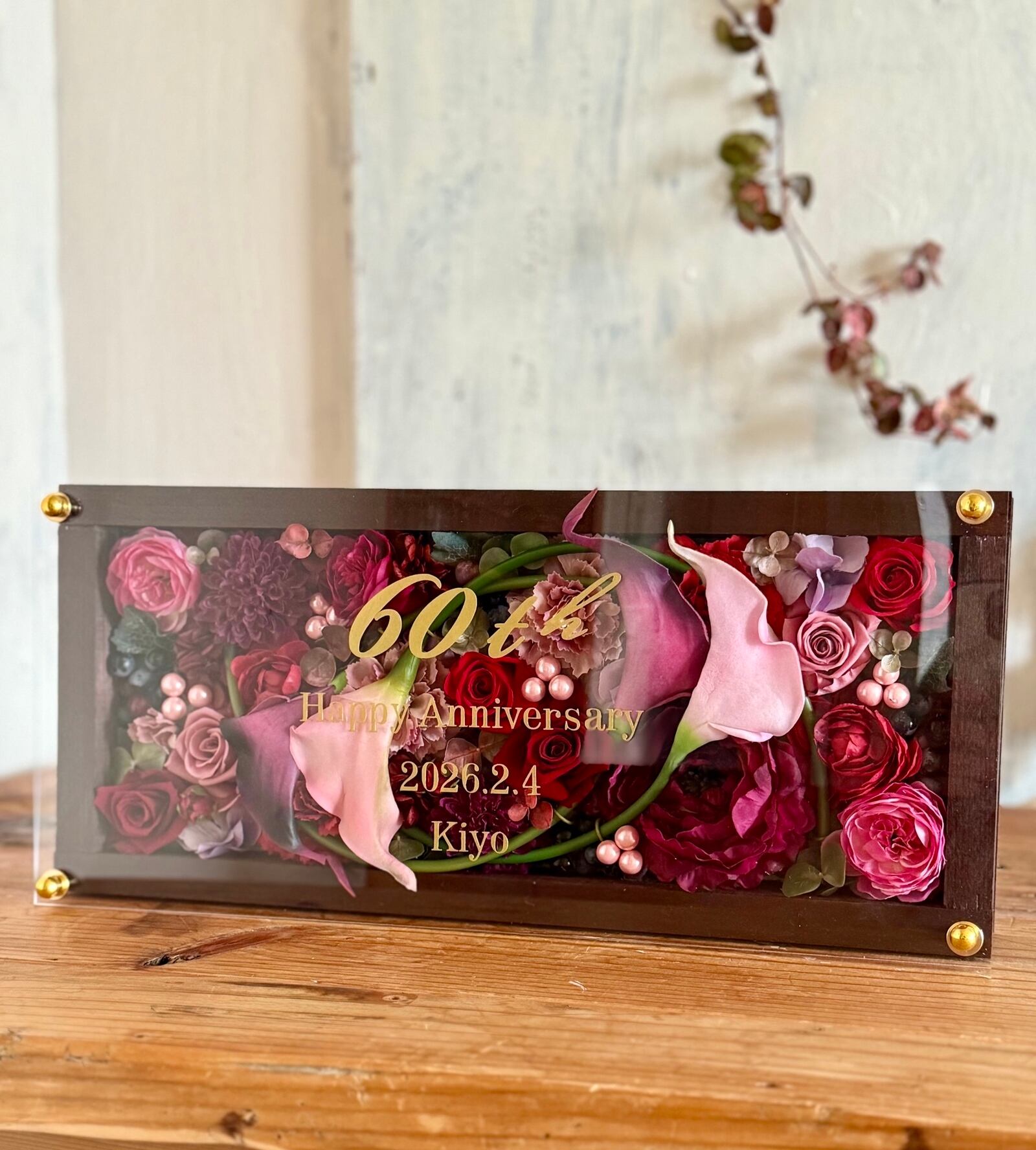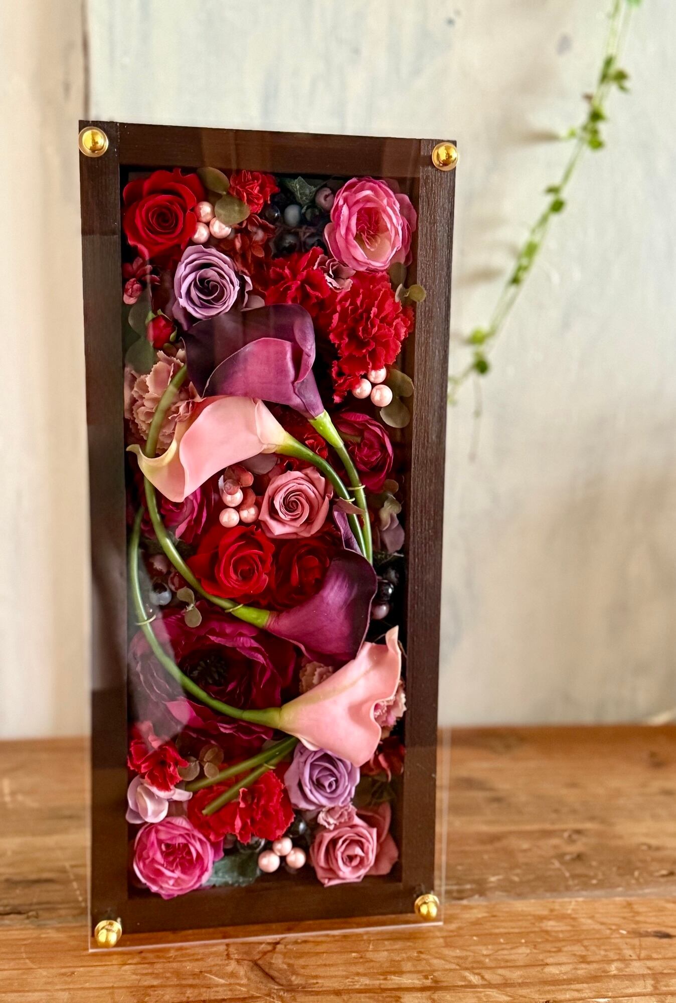 ロングサイズのウッドフレームにプリザーブドフラワーと造花をぎっしり詰め込み、アクリル板にはカッティングシートでメッセージをお入れします(木枠にも文字入れ可能)