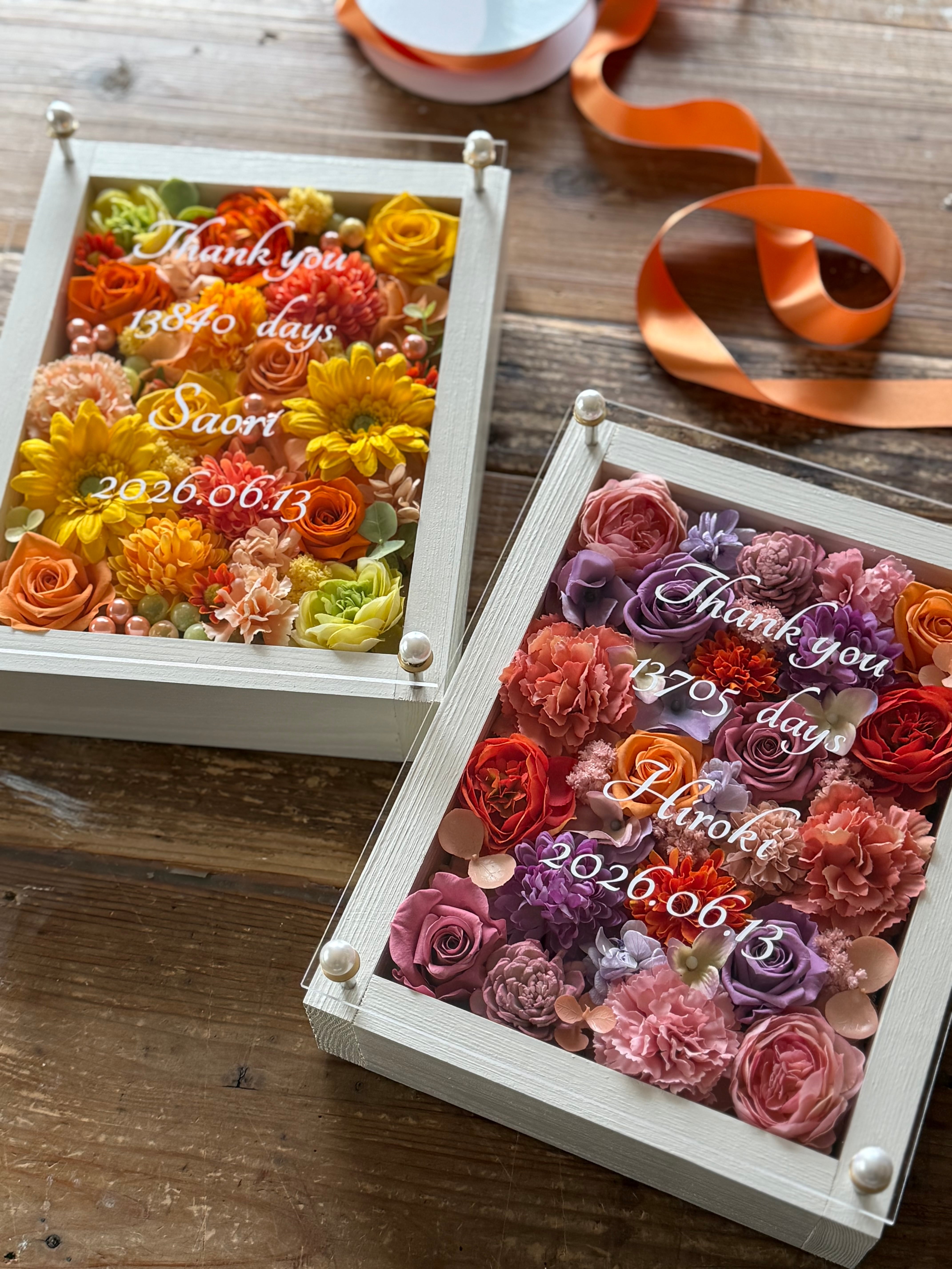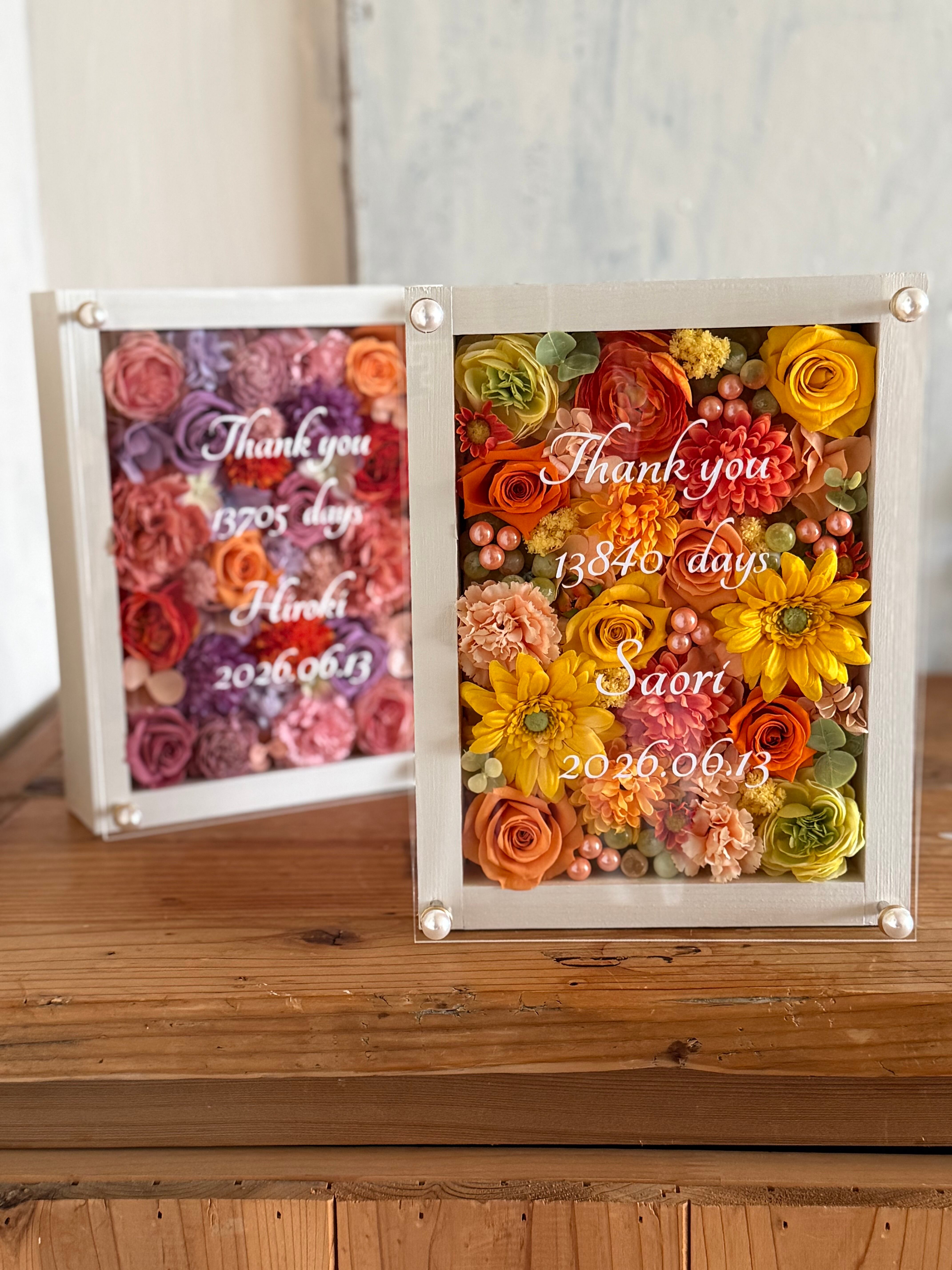 ウッドフレームにプリザーブドフラワーと造花をぎっしり詰め込み、アクリル板にはカッティングシートでお名前、挙式日、生まれてから今日までの日数などをお入れします