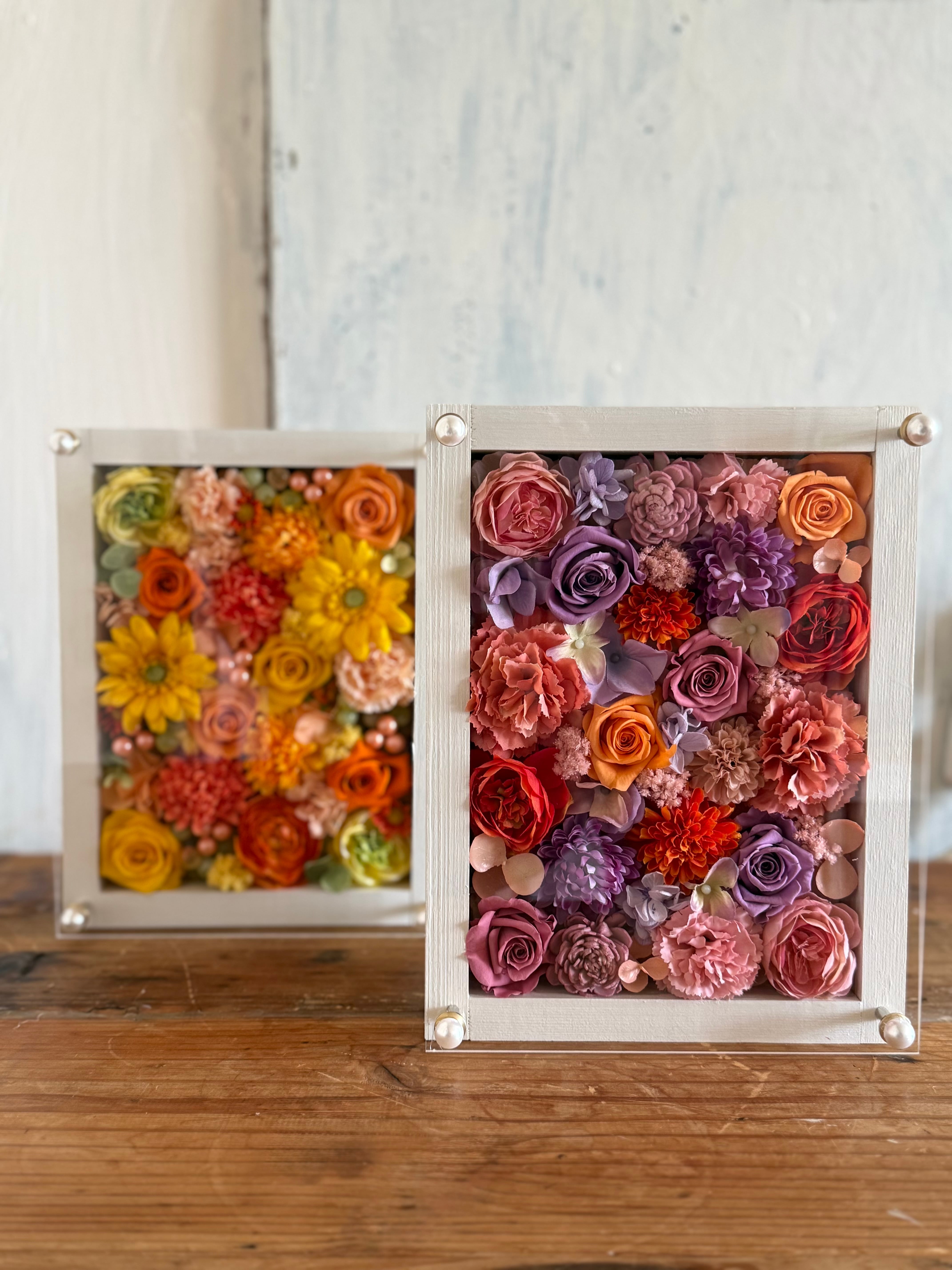 子育て感謝状・両親贈呈品 2個セット【名入れ】 プリザーブドフラワーアレンジ ウッドフレーム 白木枠〈イエローオレンジ&ピンクパープルオレンジ〉結婚式 ギフト
