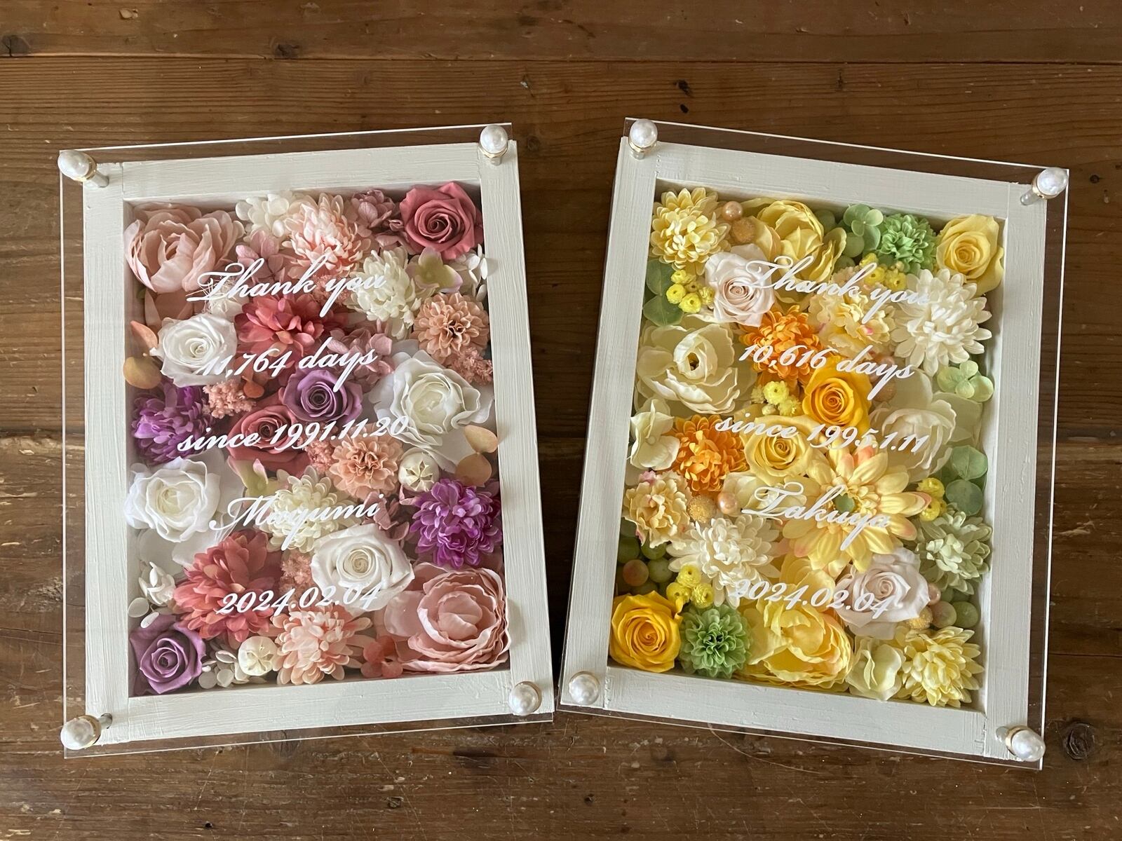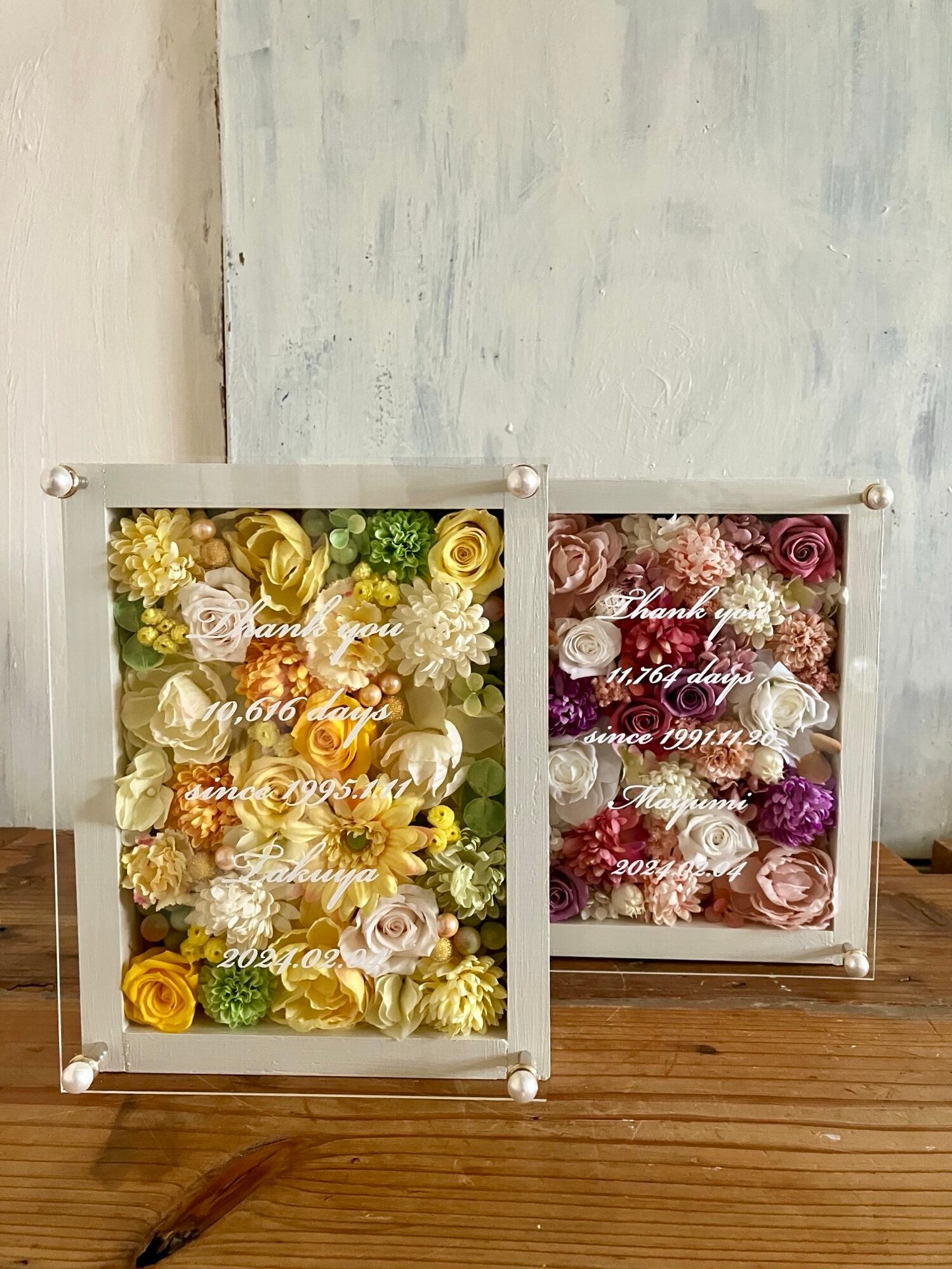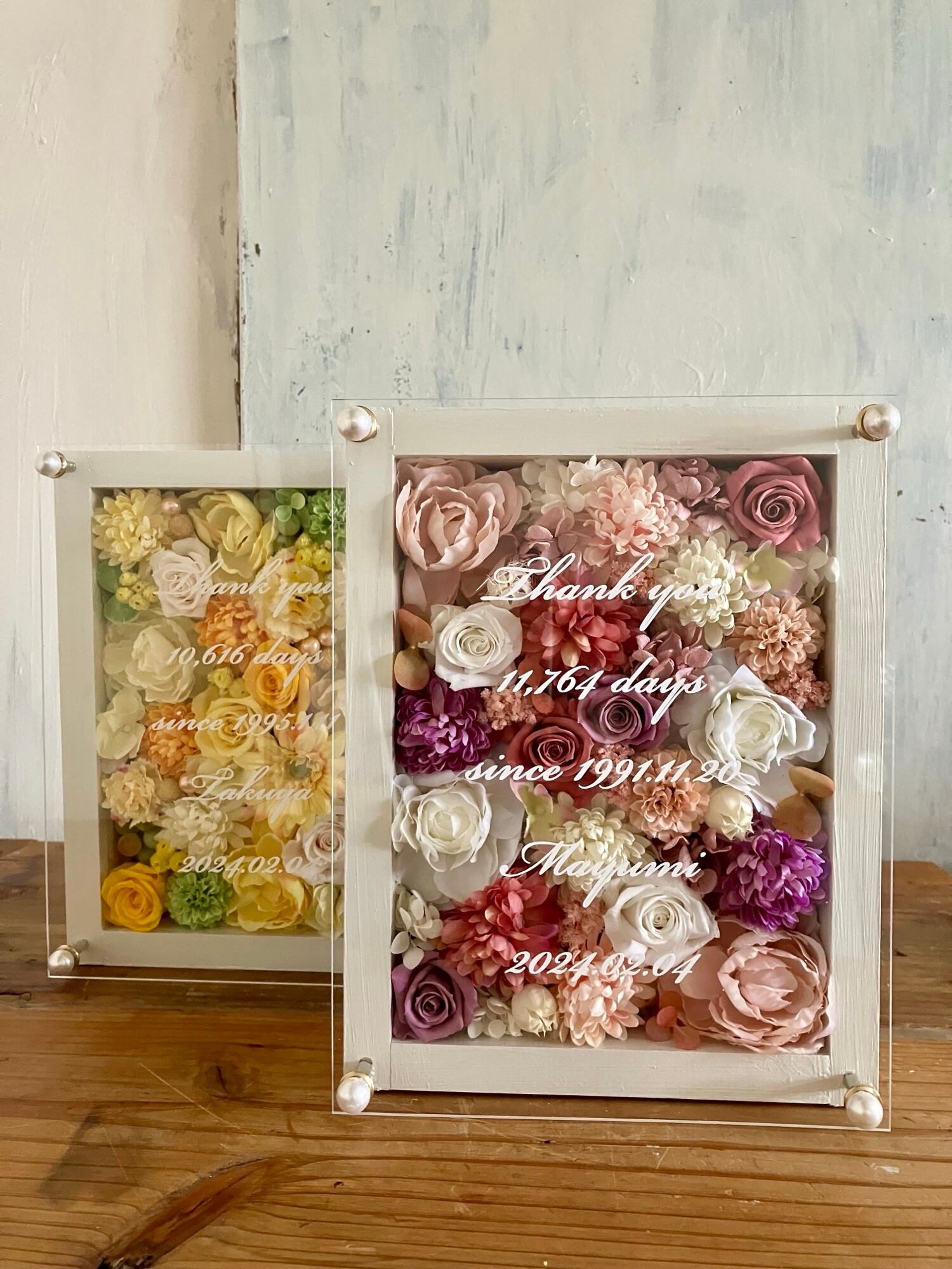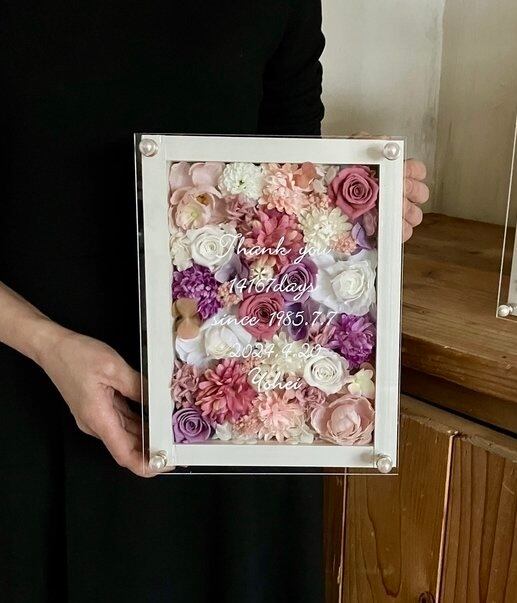 ウッドフレームにプリザーブドフラワーと造花をぎっしり詰め込み、アクリル板にはカッティングシートでお名前、挙式日、生まれてから今日までの日数などをお入れします