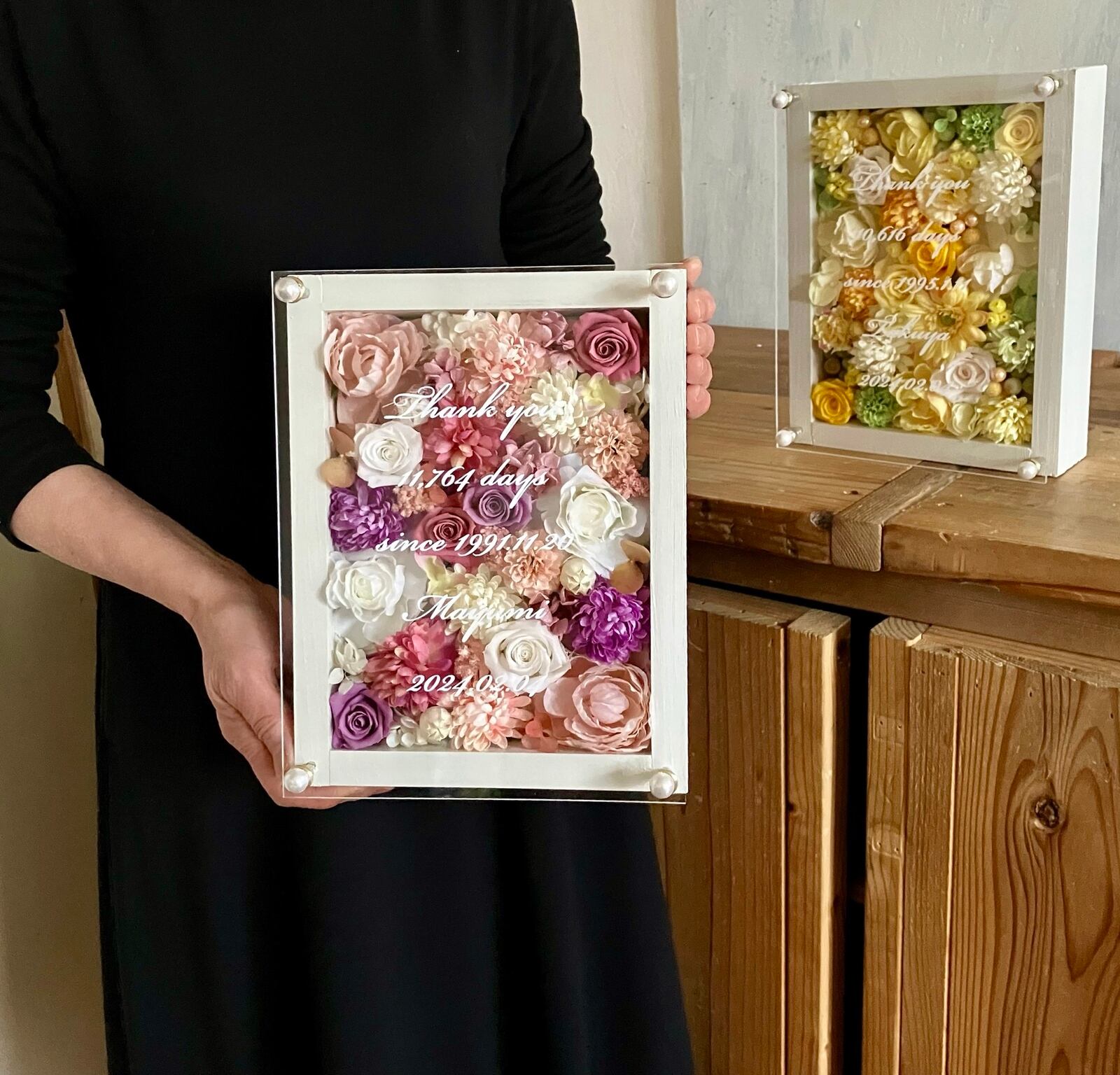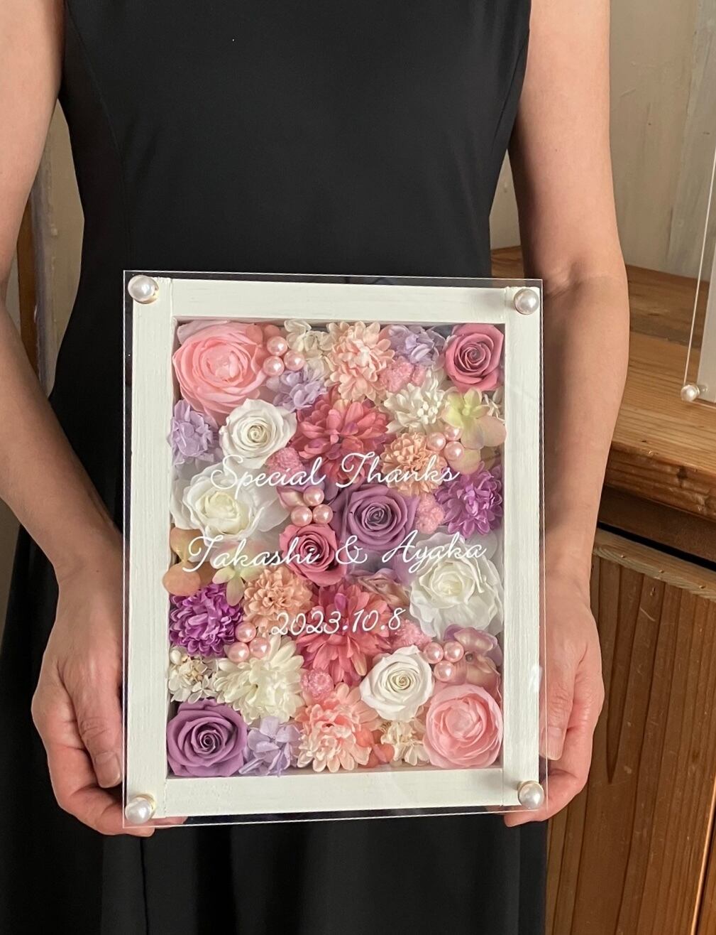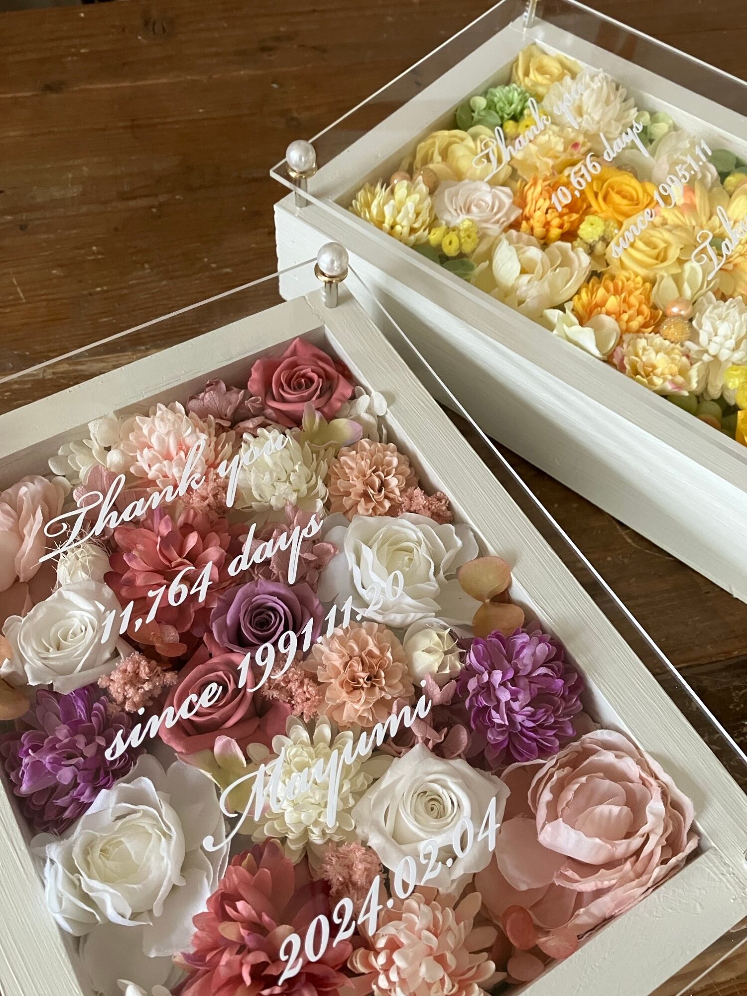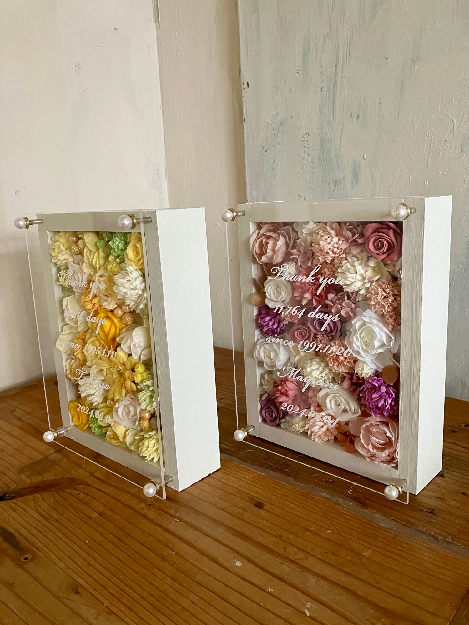 ウッドフレームにプリザーブドフラワーと造花をぎっしり詰め込み、アクリル板にはカッティングシートでお名前、挙式日、生まれてから今日までの日数などをお入れします