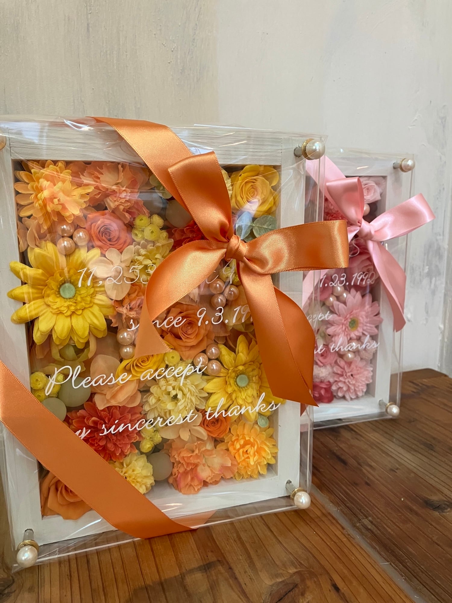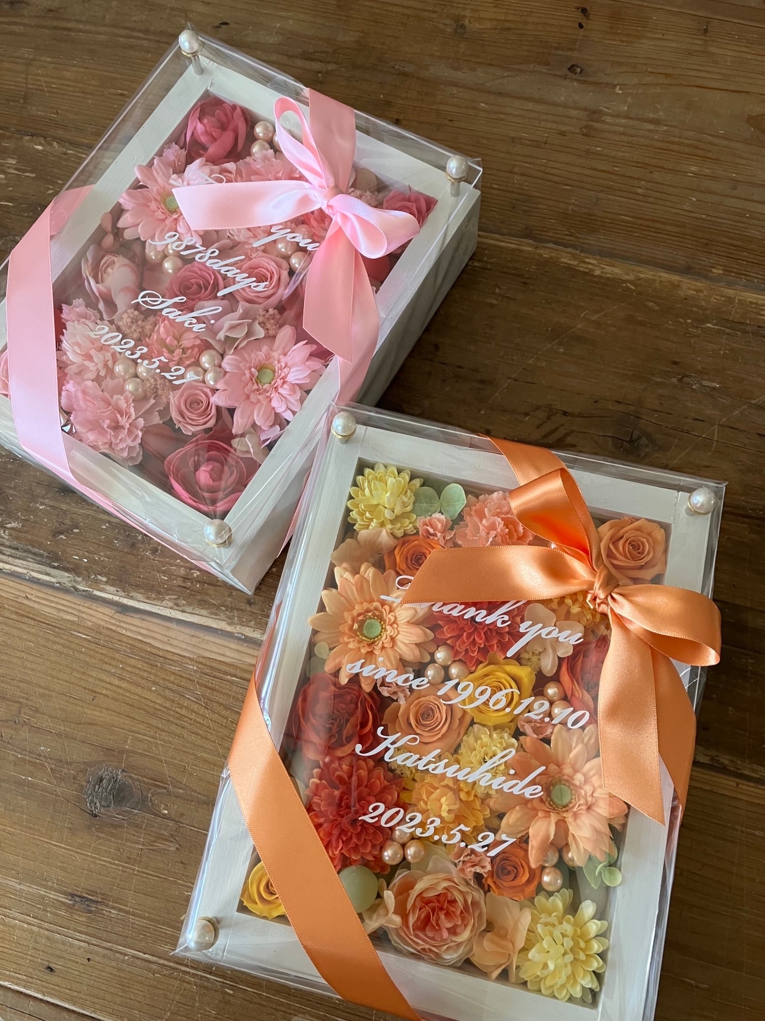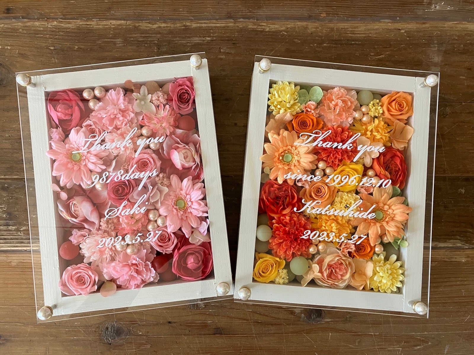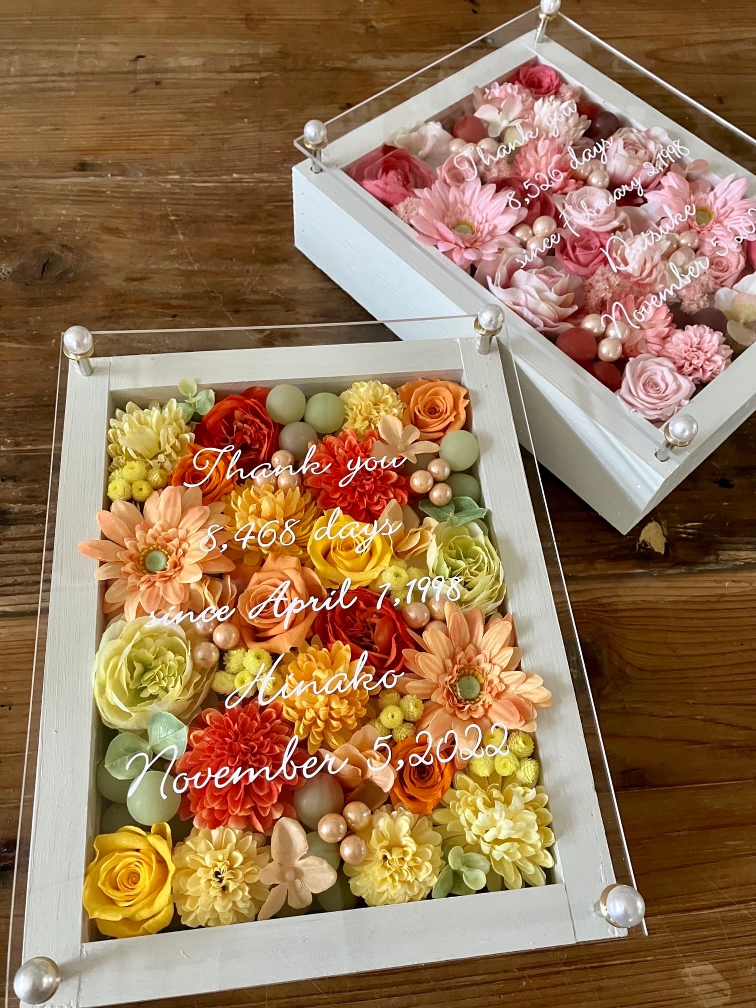 感謝のギフト|結婚式 両親贈呈品 プリザーブドフラワーアレンジ ウッドフレーム 白枠〈ピンク&イエローオレンジ〉文字入れ 2個セット