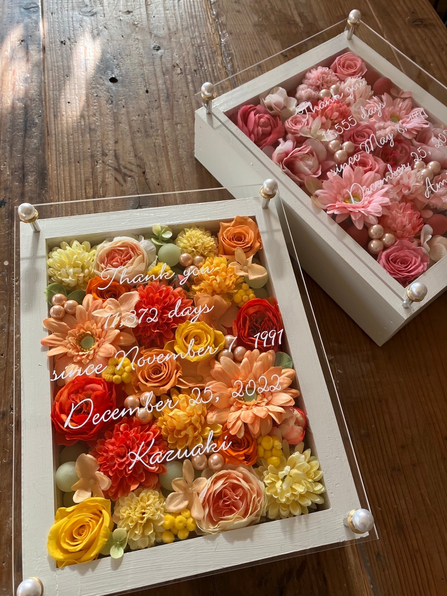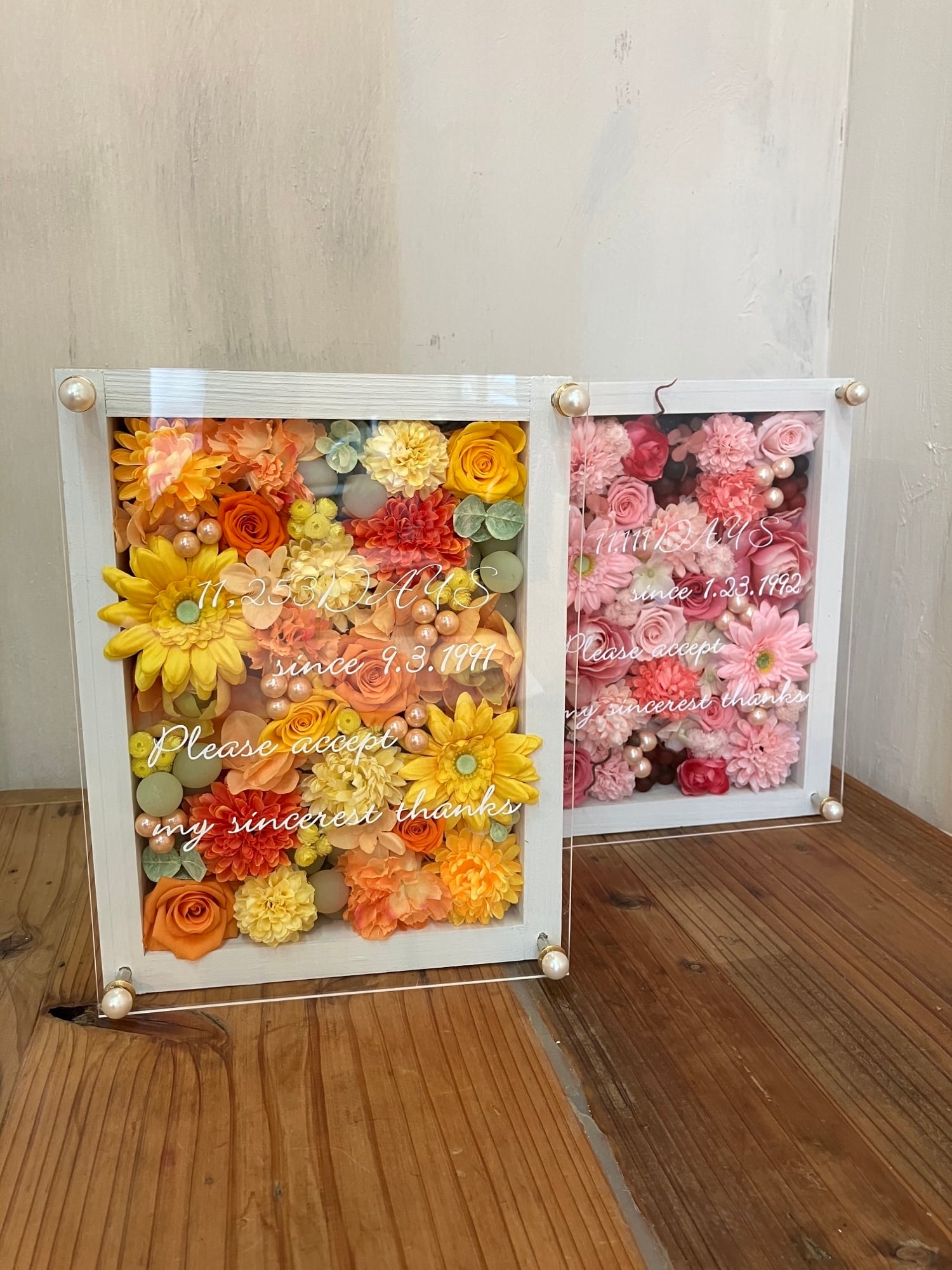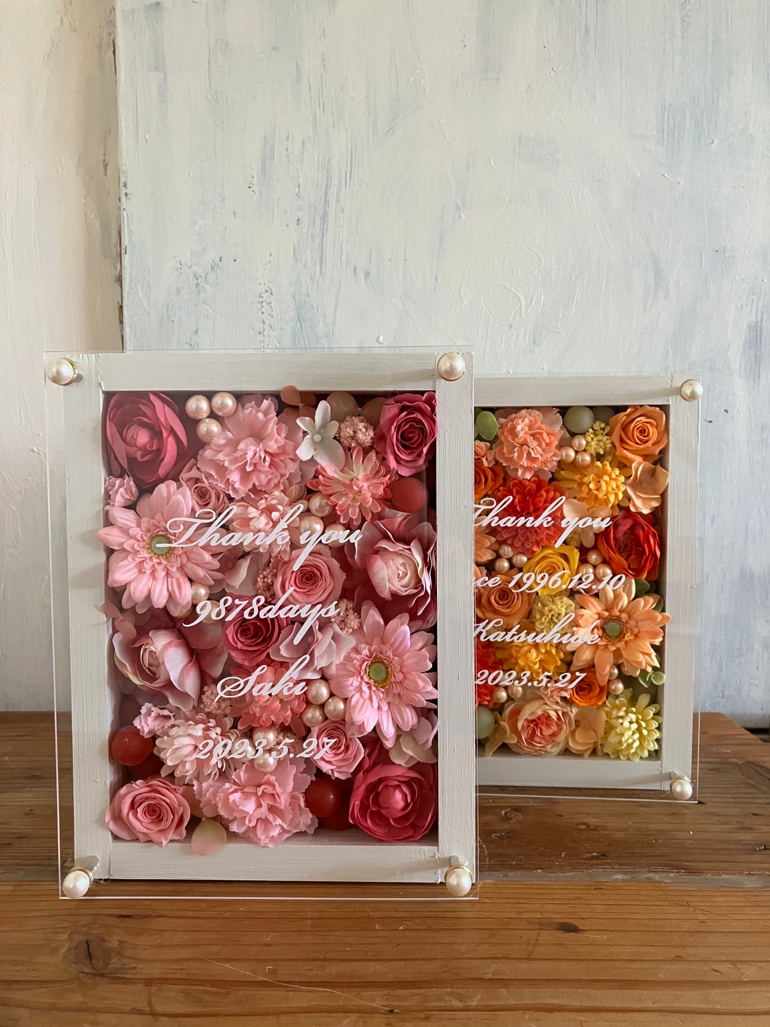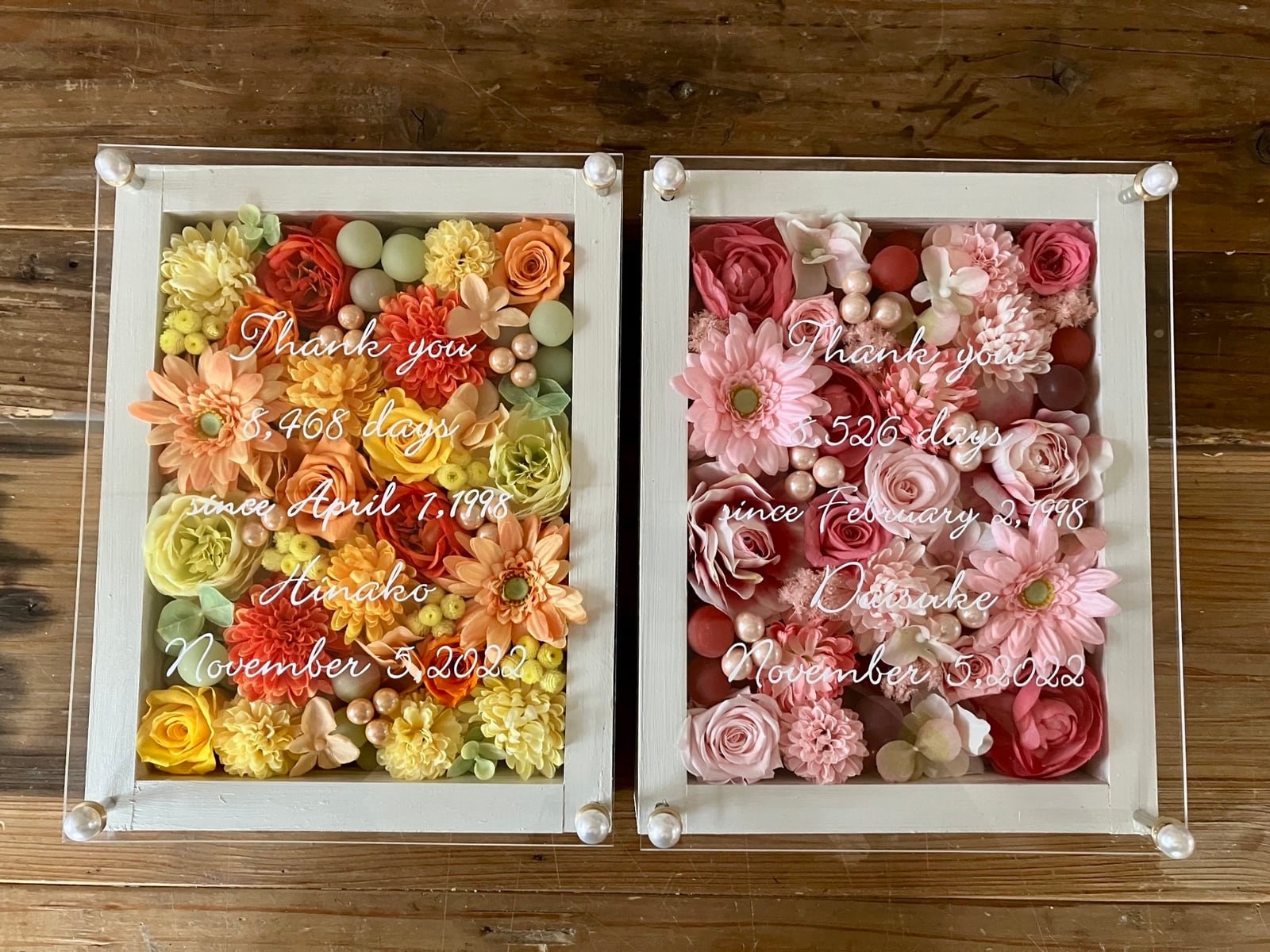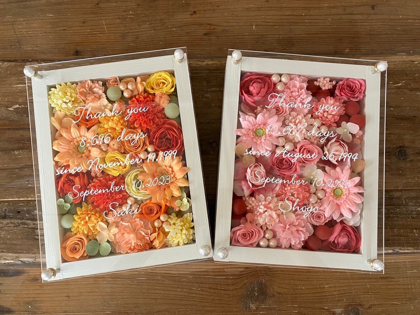 感謝のギフト|結婚式 両親贈呈品 プリザーブドフラワーアレンジ ウッドフレーム 白枠〈ピンク&イエローオレンジ〉文字入れ 2個セット