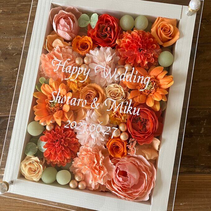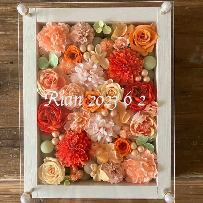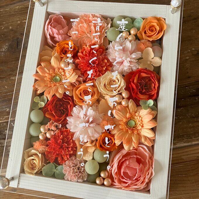 白枠〈オレンジ〉白文字入りのプリザーブドフラワーアレンジです。