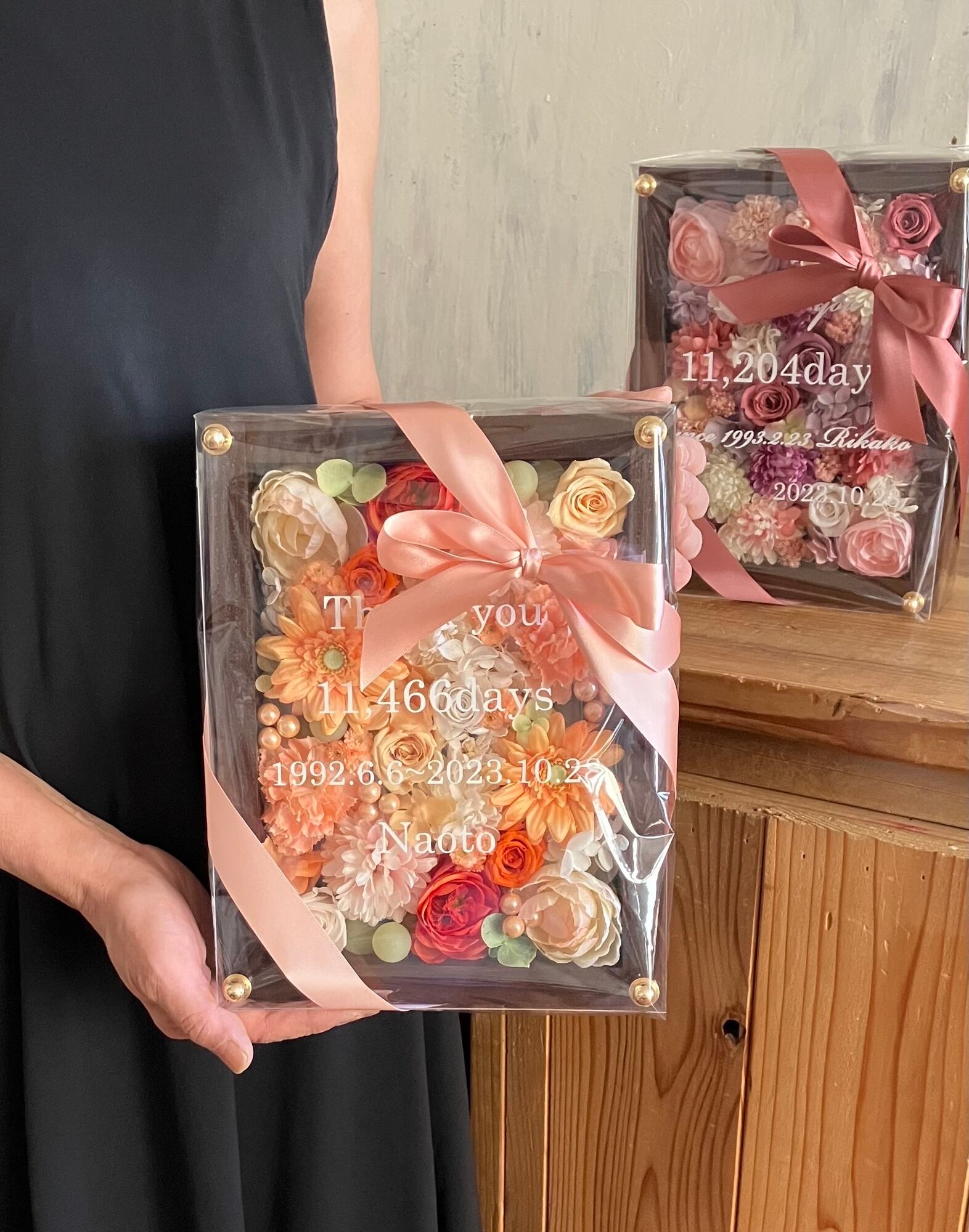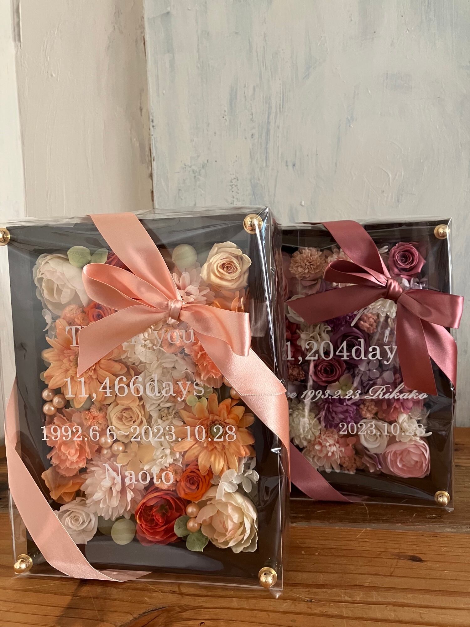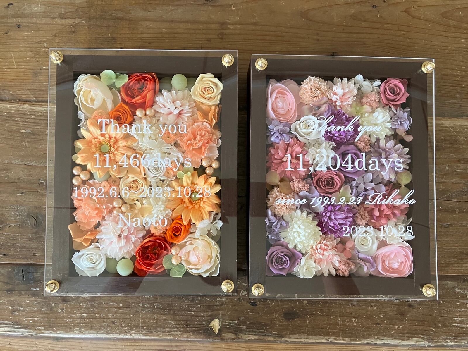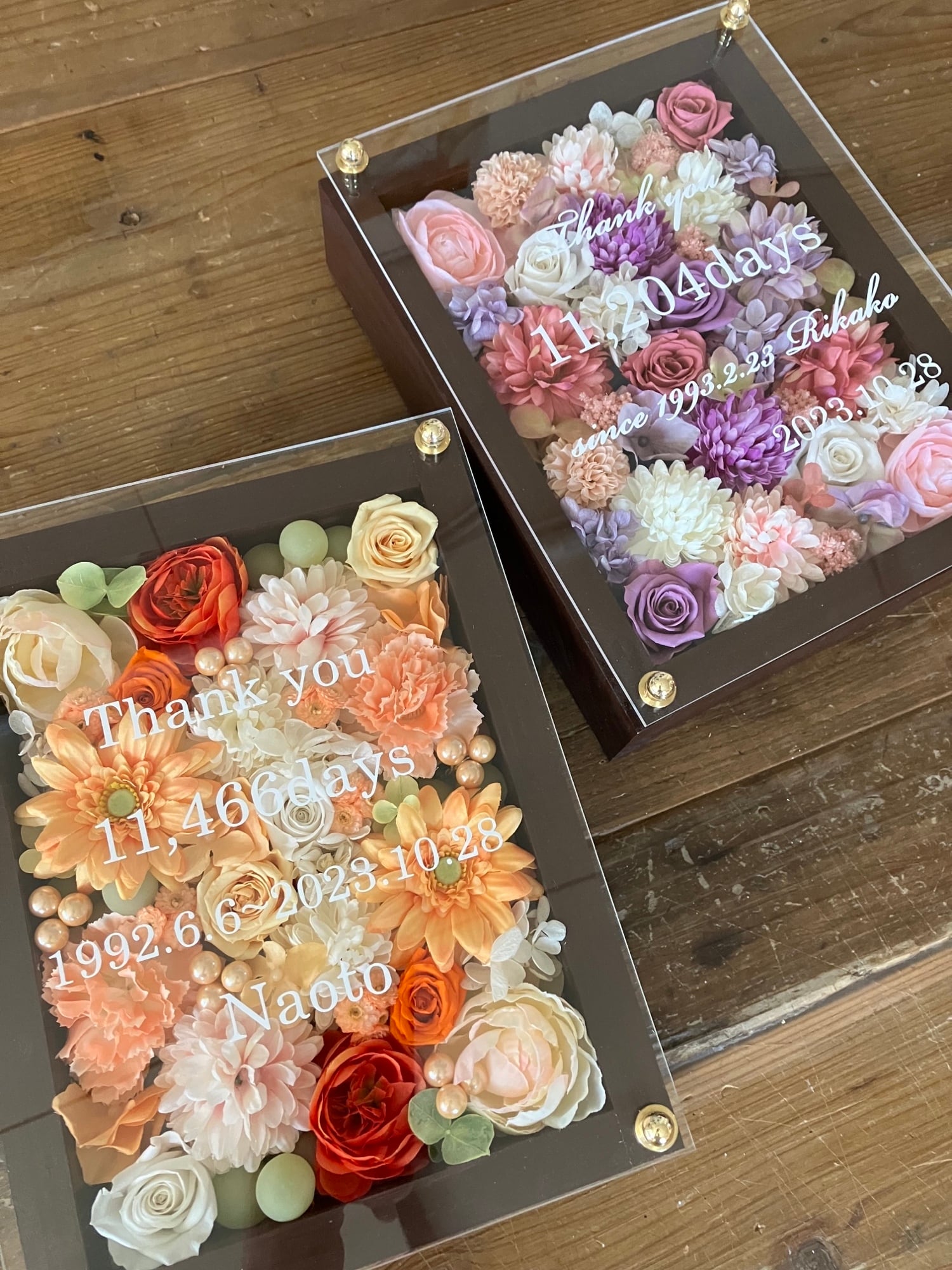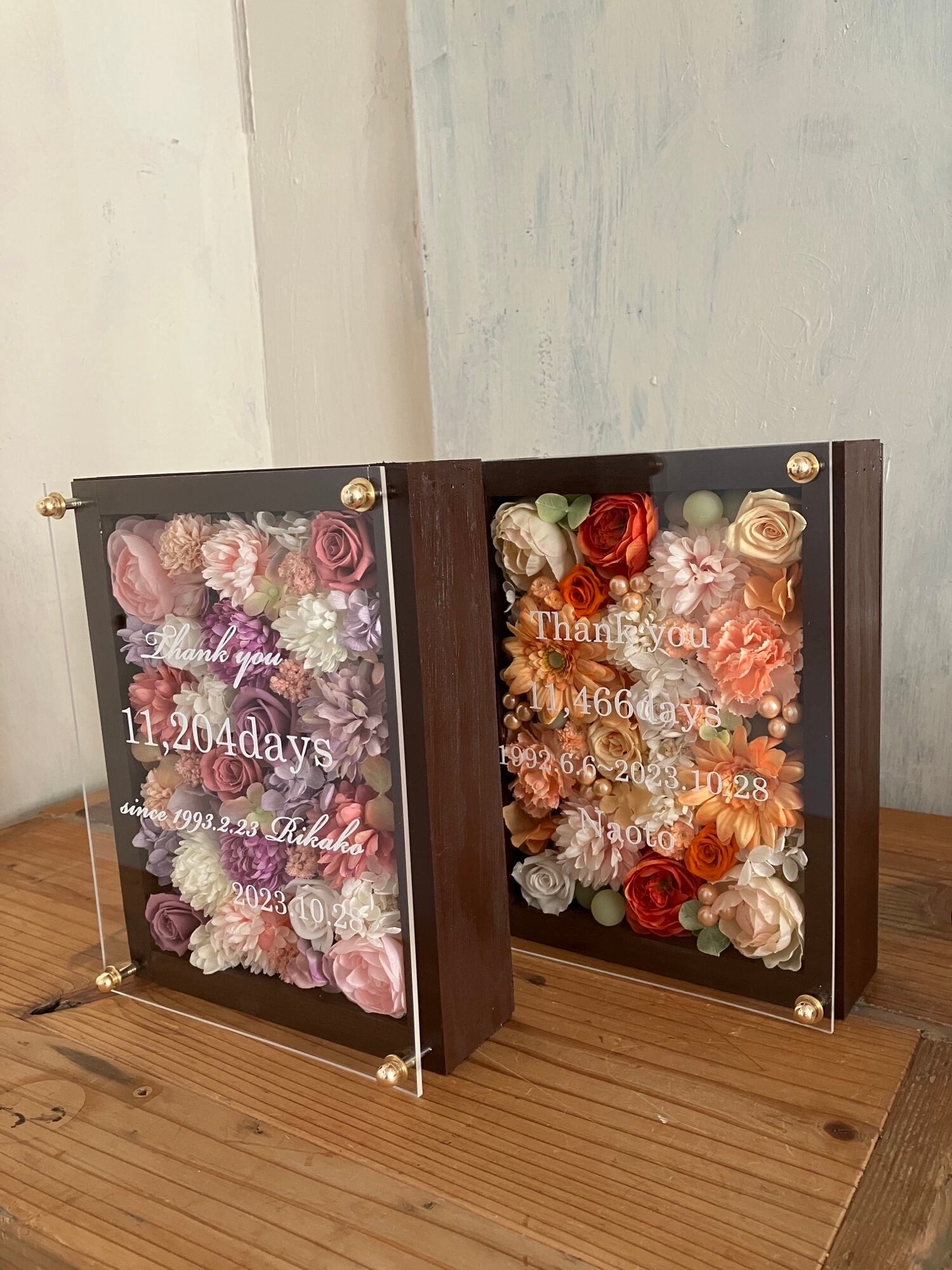 感謝のギフト|結婚式 両親贈呈品 プリザーブドフラワーアレンジ ウッドフレーム 茶木枠〈オレンジベージュ白&パープルピンク白〉文字入れ 2個セット