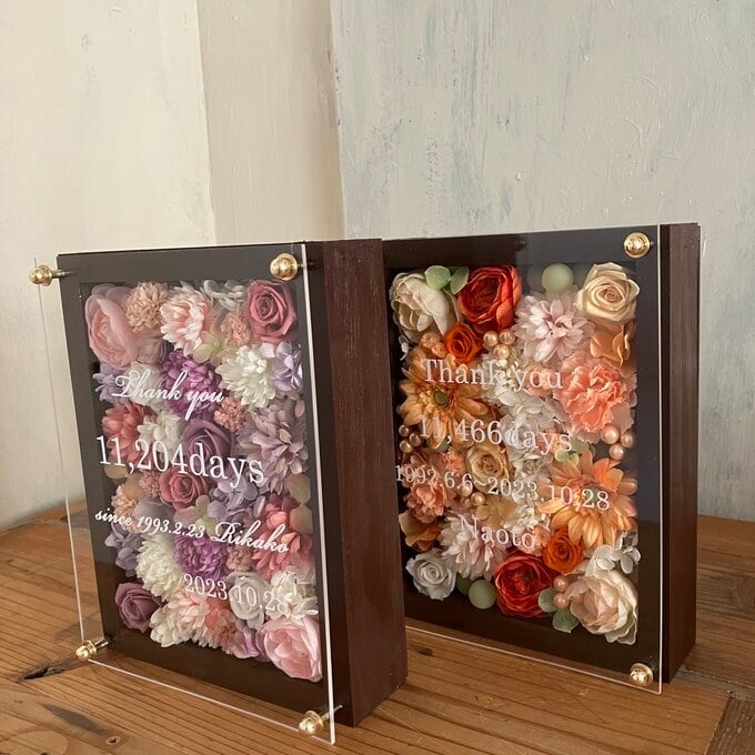 サンクスギフト|両親贈呈品 プリザーブドフラワーアレンジ 結婚式 ウッドフレーム 茶枠〈オレンジベージュ白&パープルピンク白〉白文字入れ 2個セット