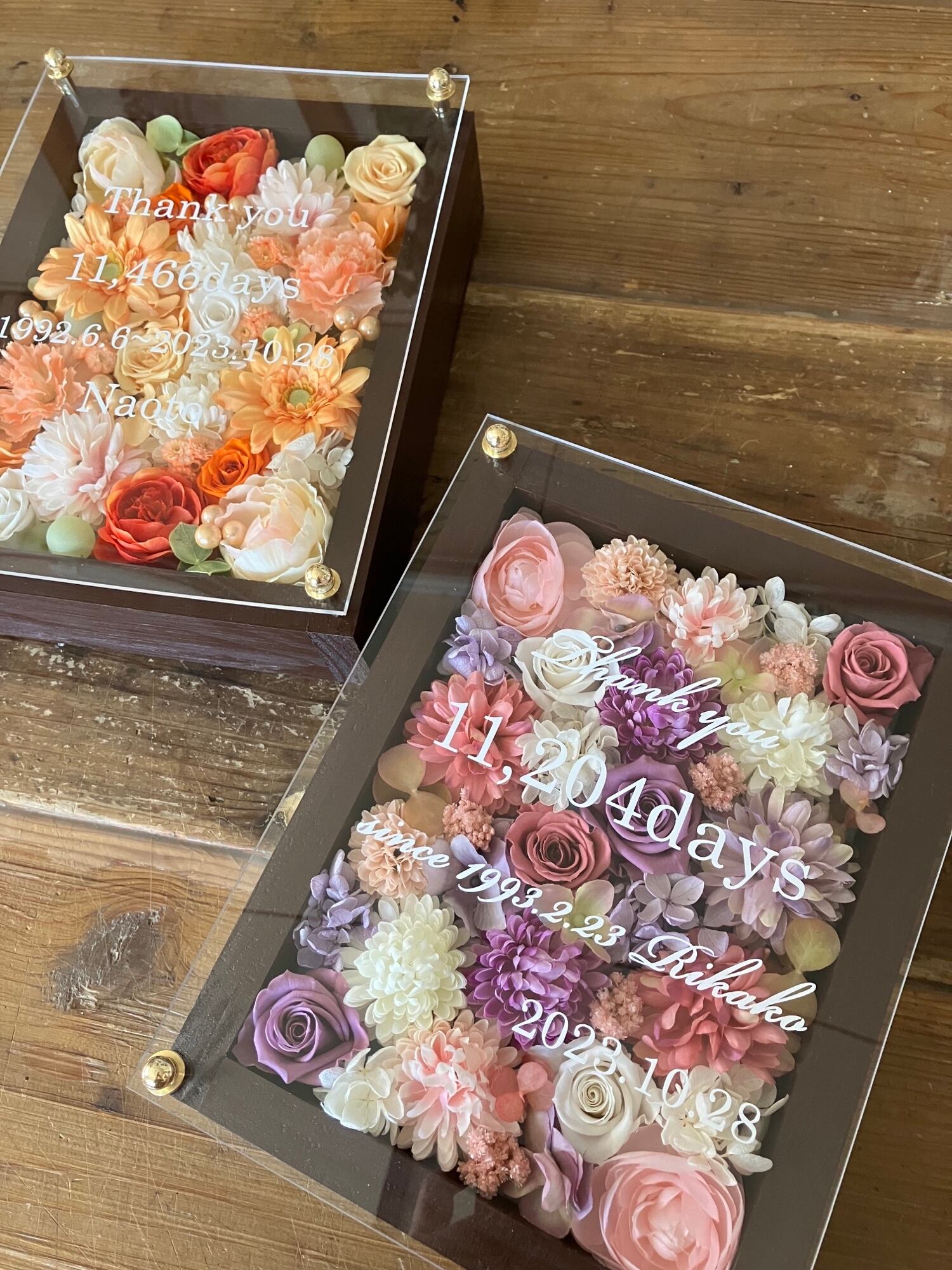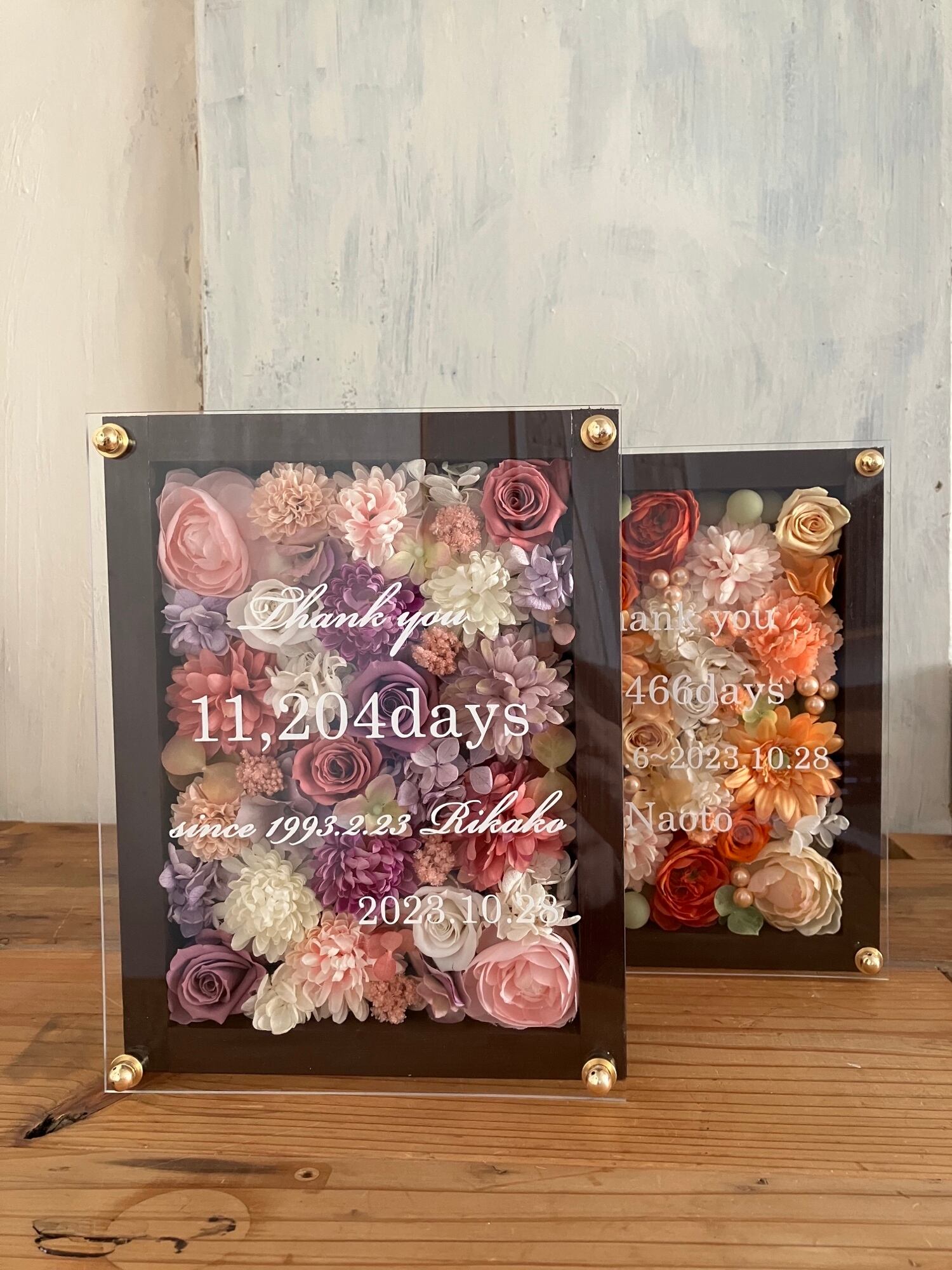 茶色のウッドフレームにプリザーブドフラワーと造花をぎっしり詰め込み、アクリル板にはカッティングシートでメッセージをお入れします。