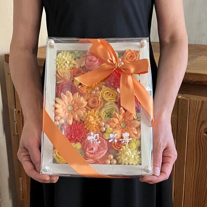 サンクスギフト|木枠〈イエローオレンジ〉名入れ可/開店・退職・米寿・周年祝いに