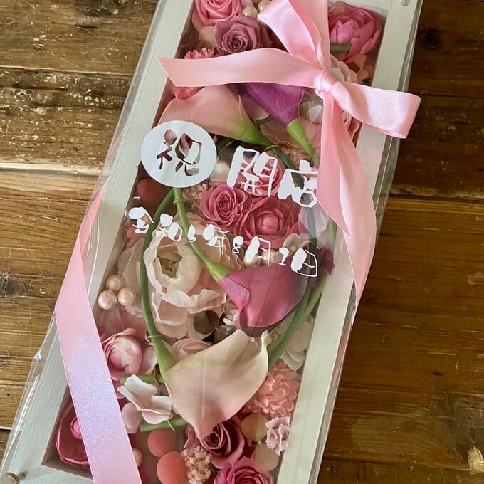 優雅なプリザーブドフラワーアレンジの白枠ロング〈ピンク〉白文字入り。