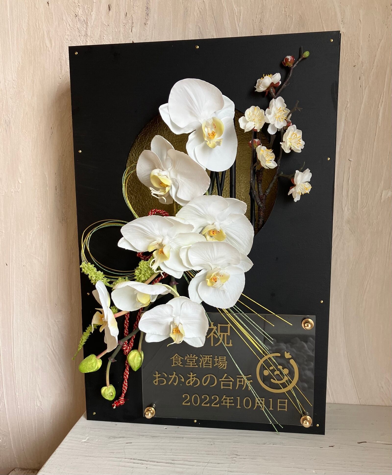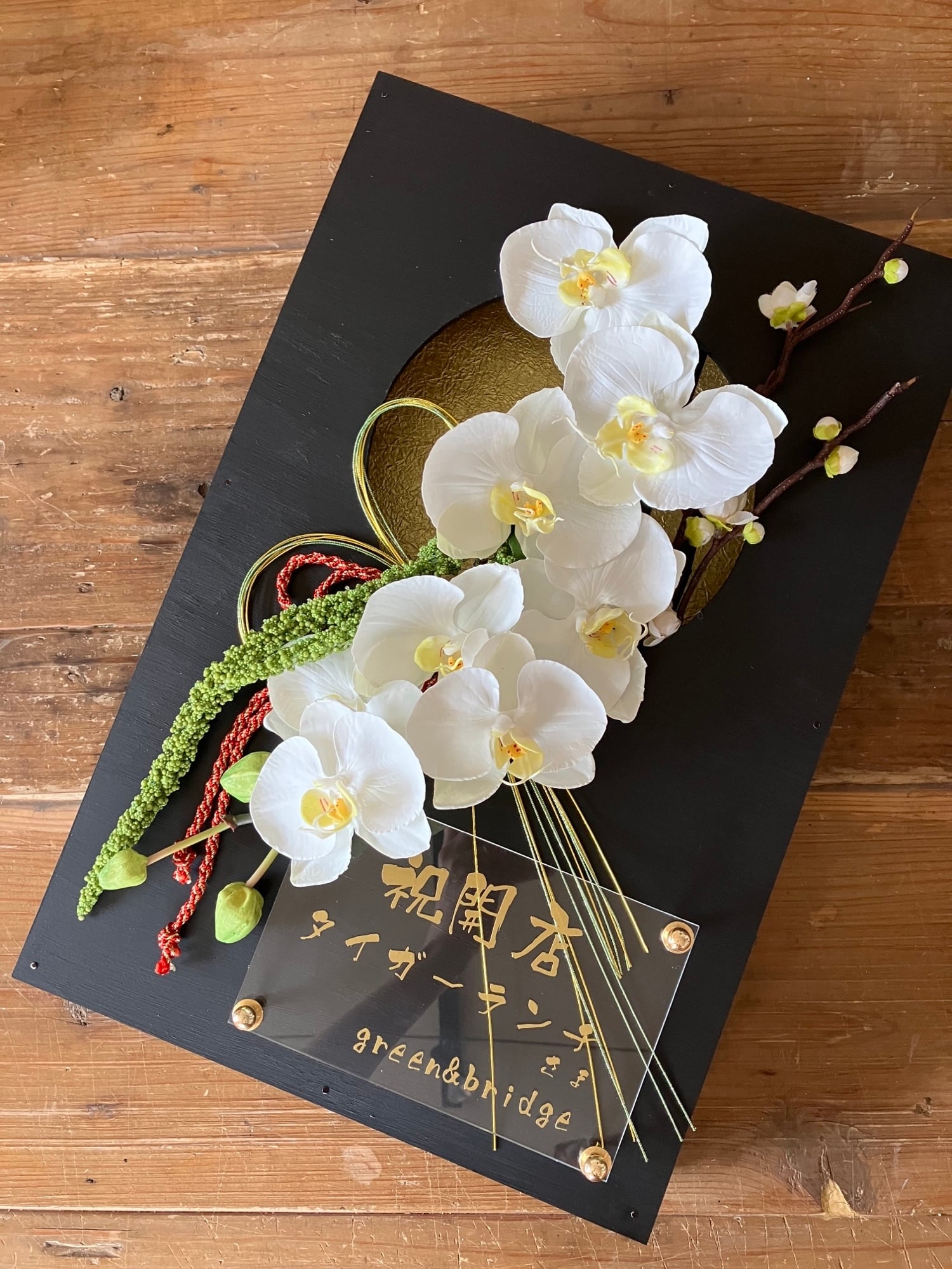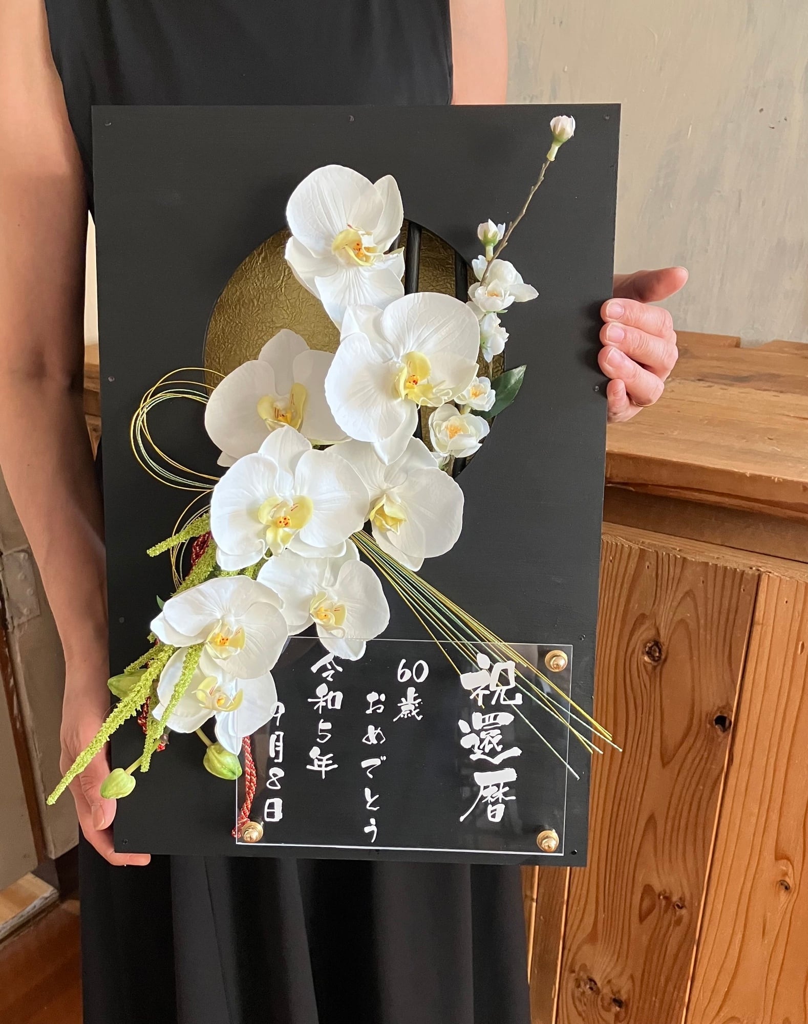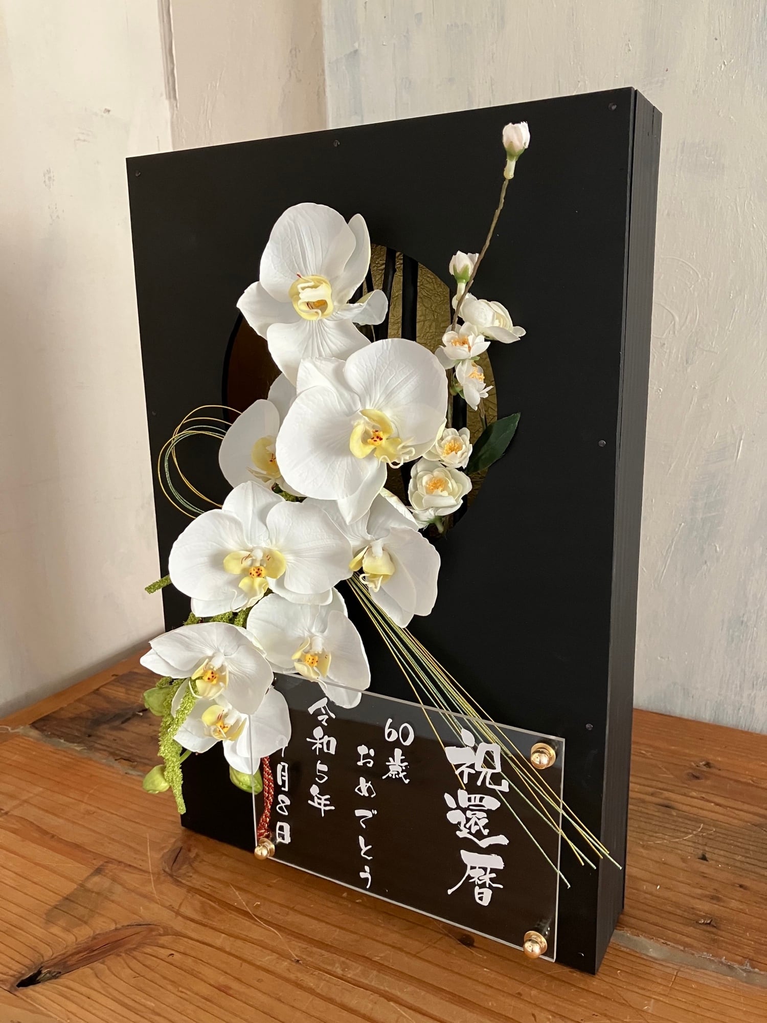 開店祝い・周年祝い・結婚祝い・和婚ウェルカムボード・還暦祝い【名入れ】 黒木枠窓〈和風 胡蝶蘭〉