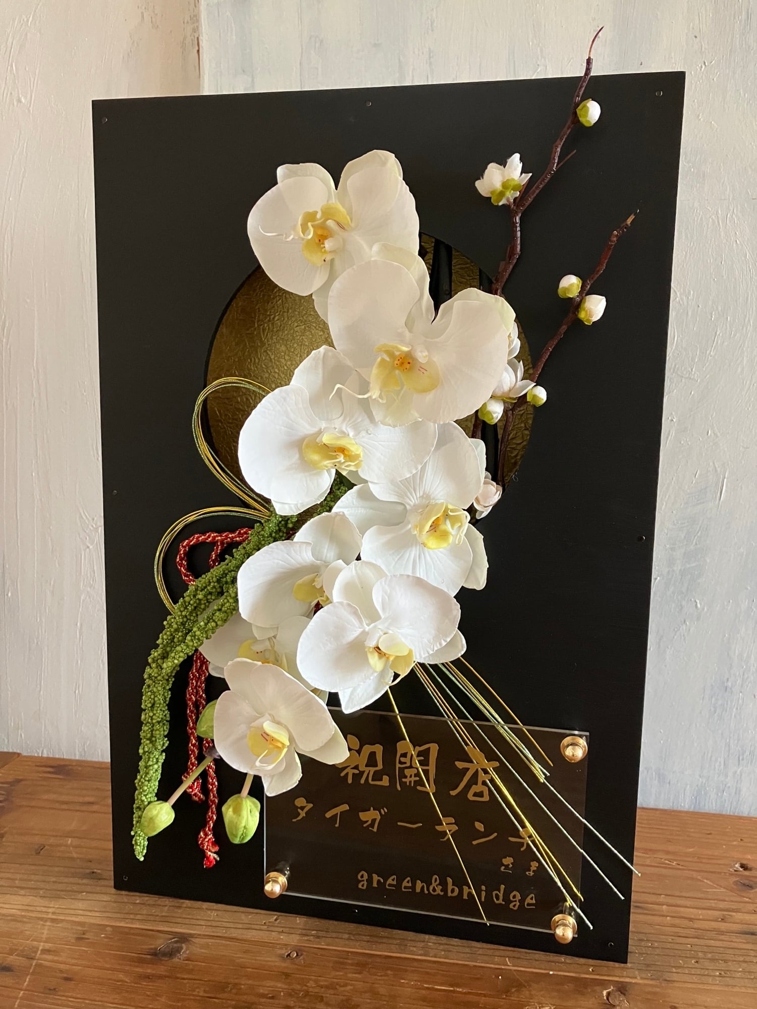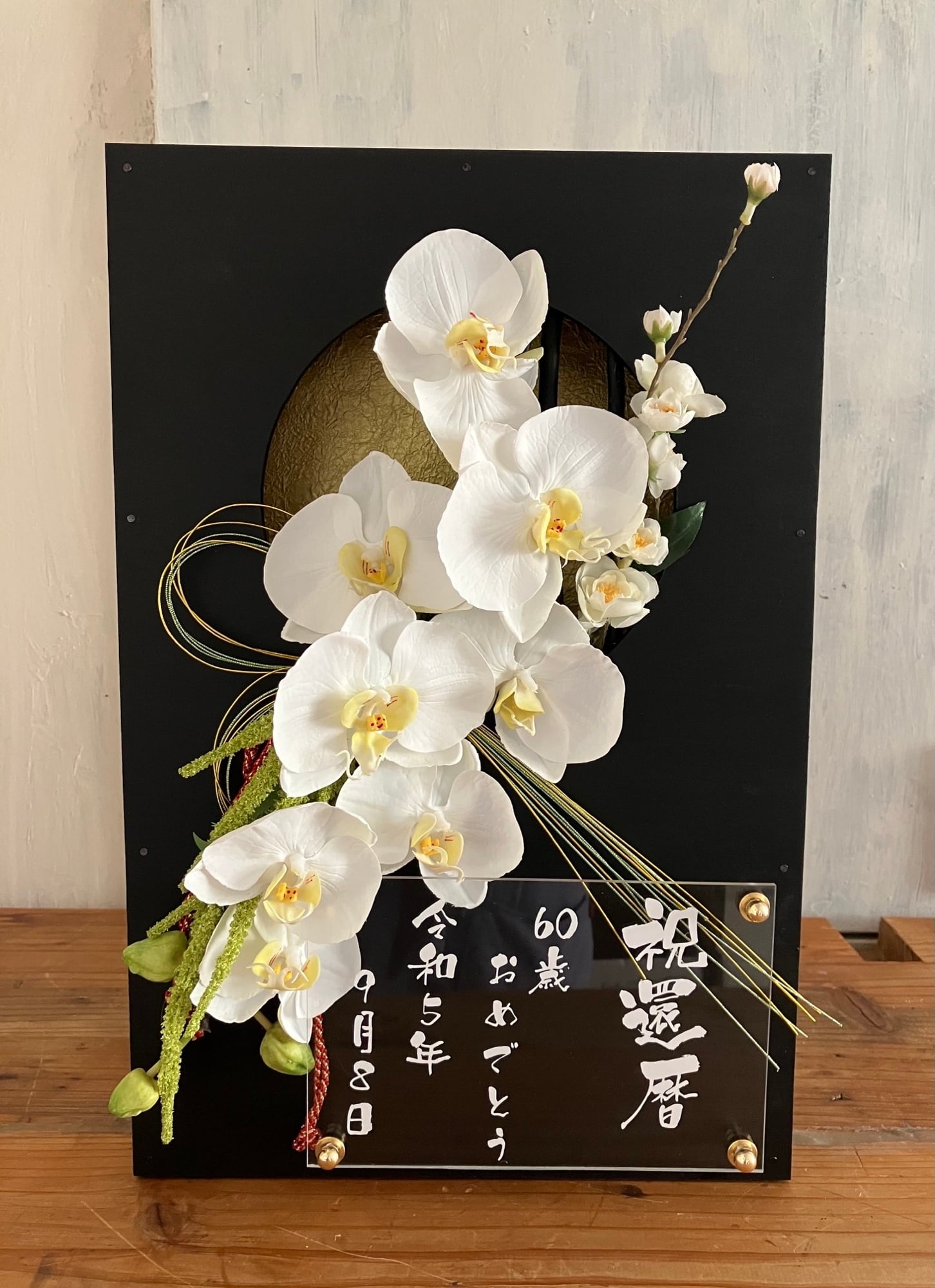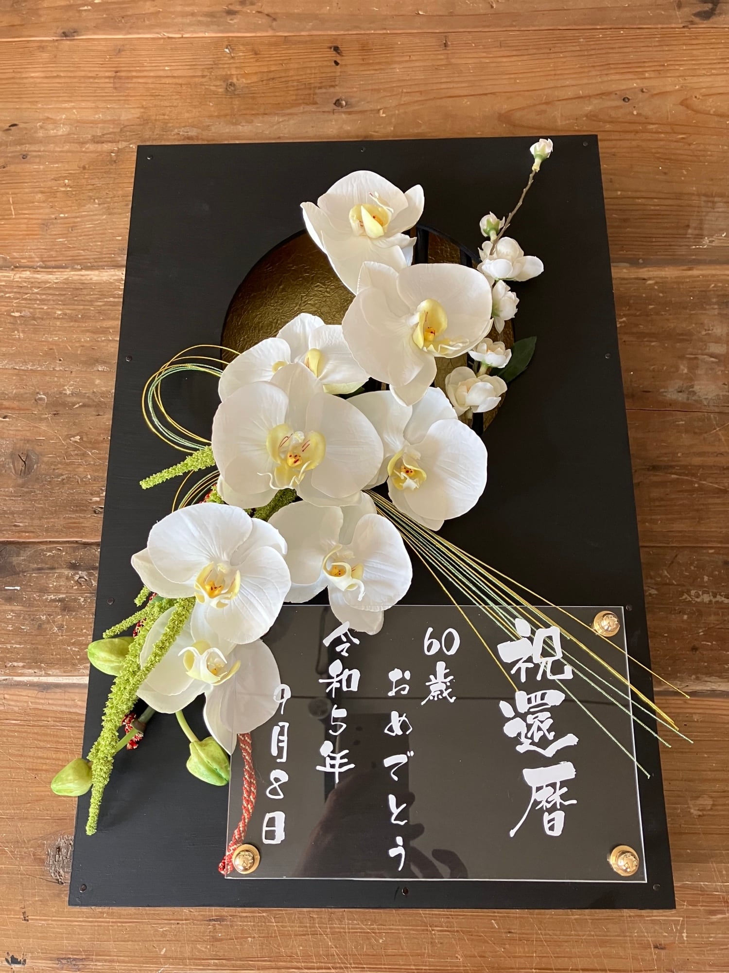 開店祝い・周年祝い・結婚祝い・和婚ウェルカムボード・還暦祝い【名入れ】 黒木枠窓〈和風 胡蝶蘭〉