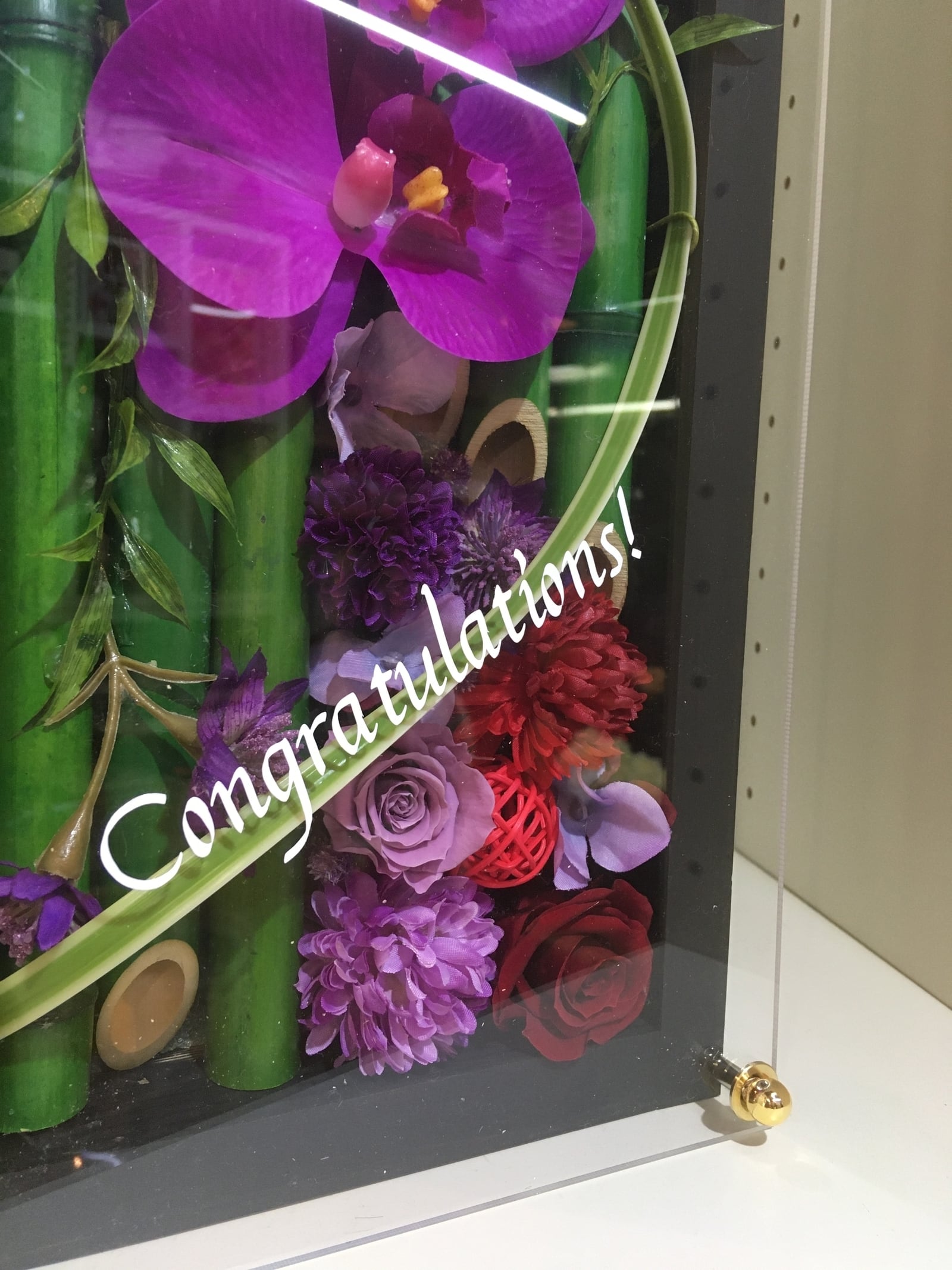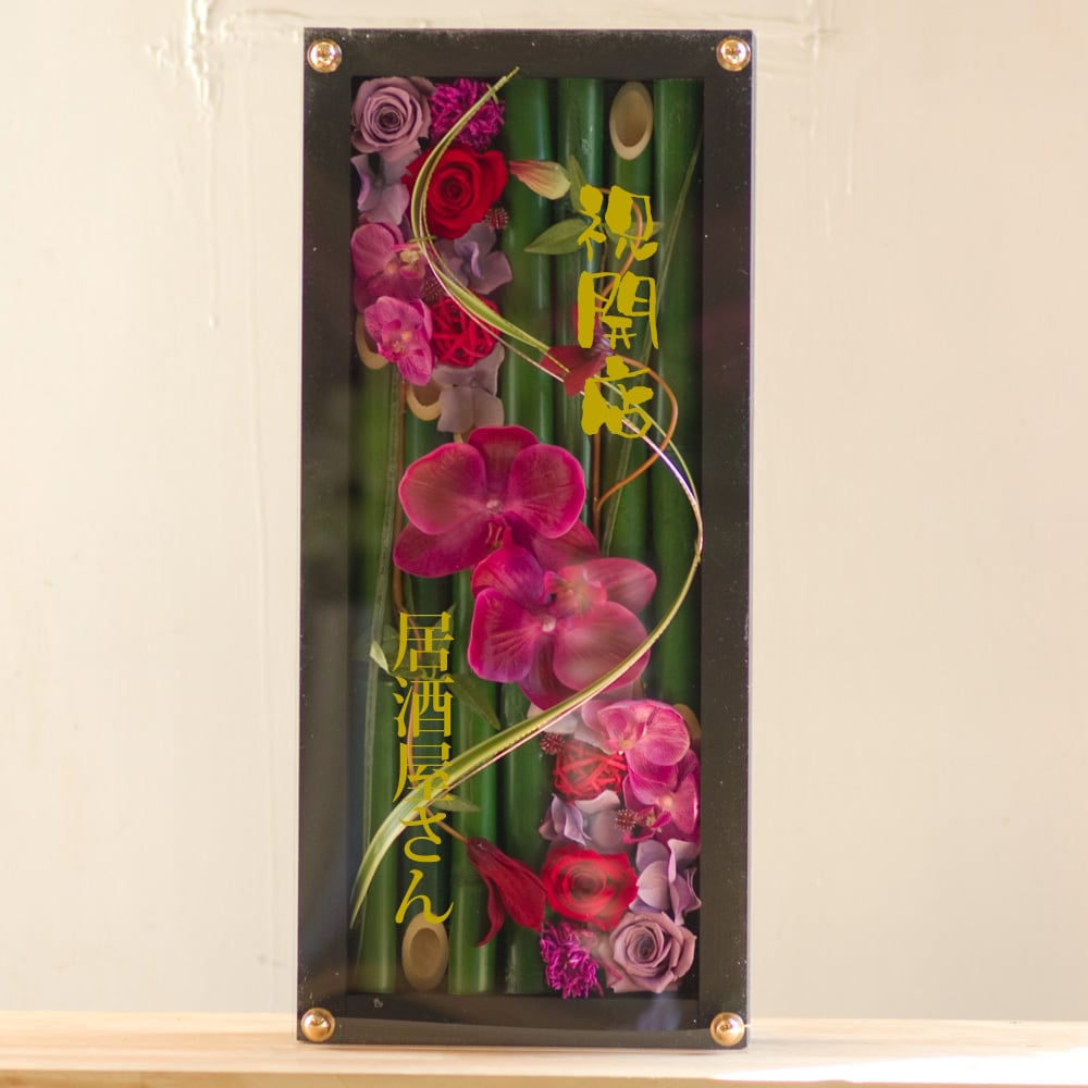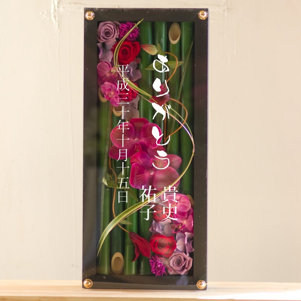 黒色のロングサイズのウッドフレームに竹とプリザーブドフラワーと造花をバランスよく詰め込み、アクリル板にはカッティングシートでメッセージをお入れします。