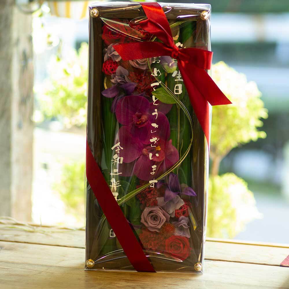 お花のギフト|プリザーブドフラワーアレンジ 和風 木枠ロング〈竹 赤紫〉名入れ可/喜寿・古希・還暦・退職・開店祝いに