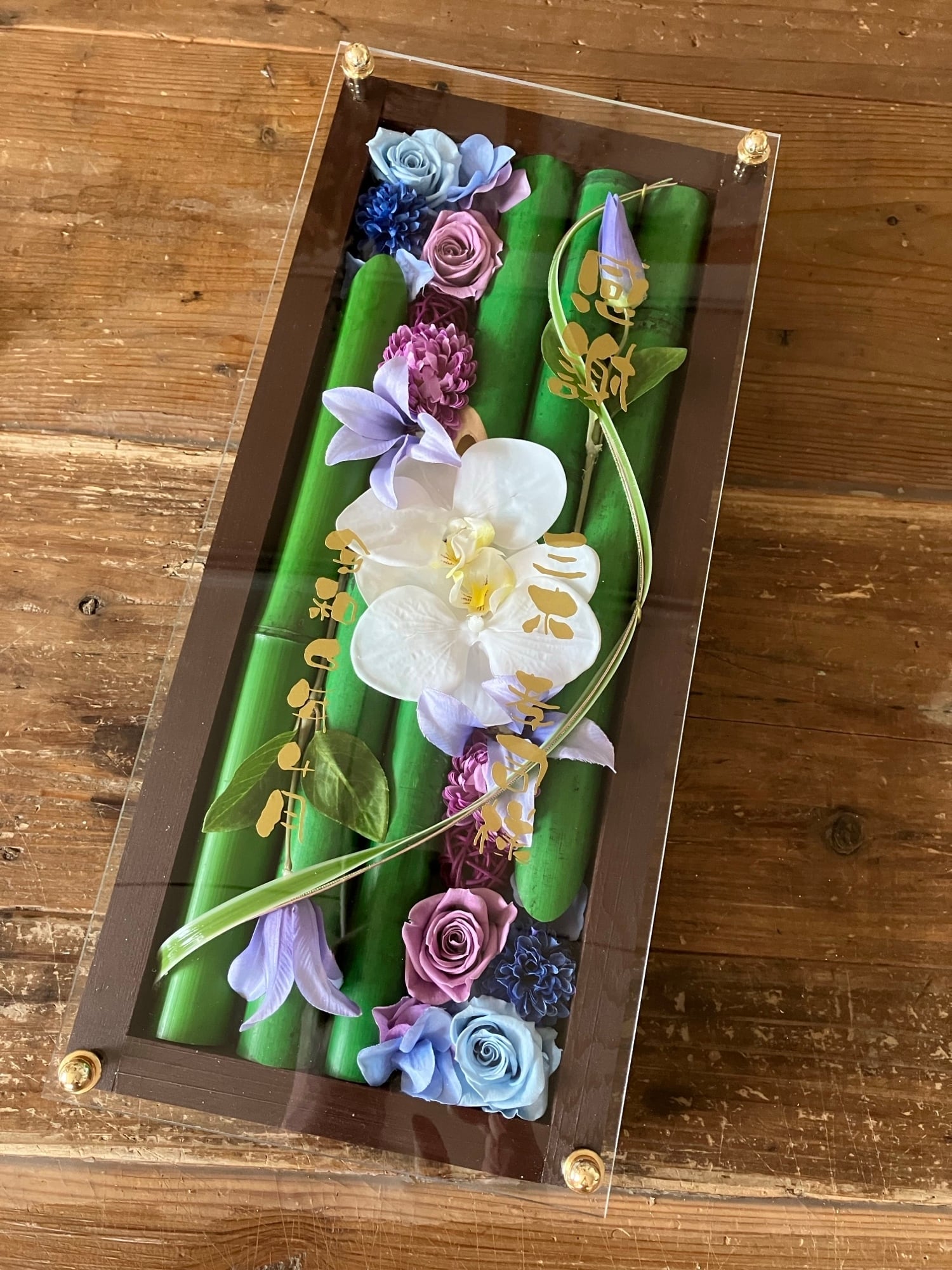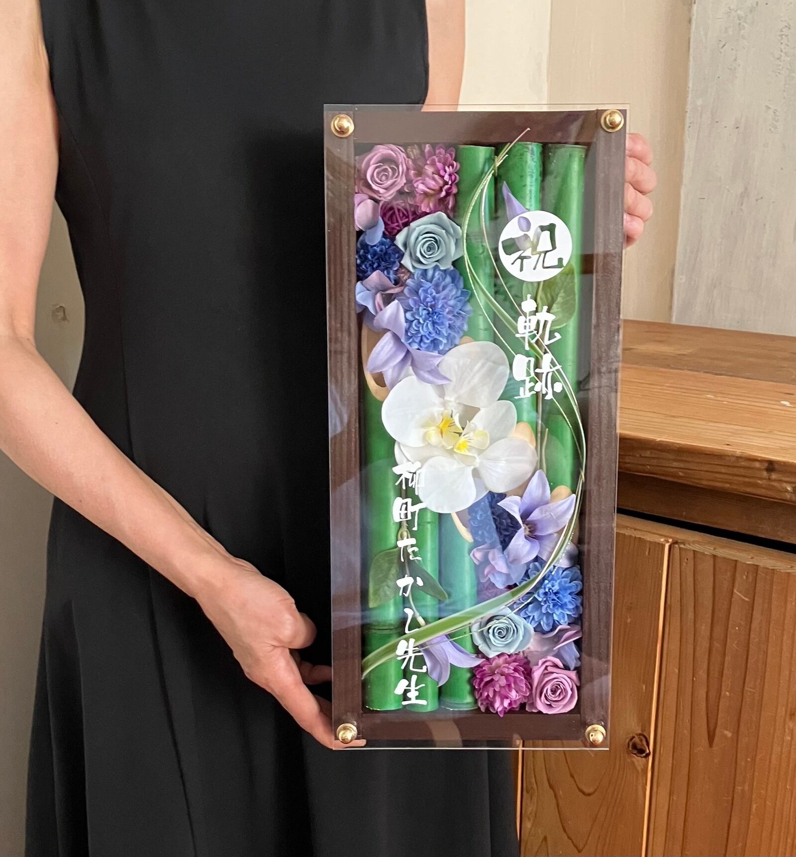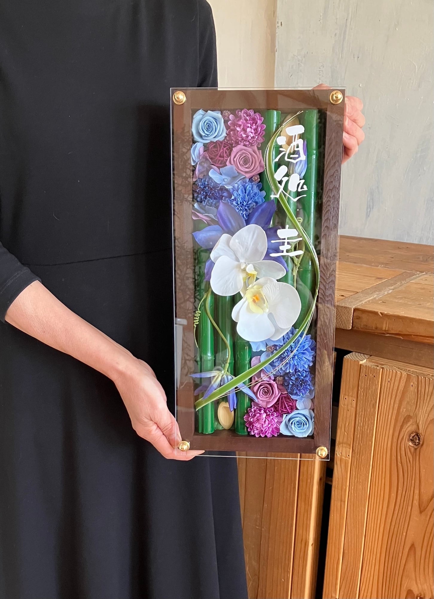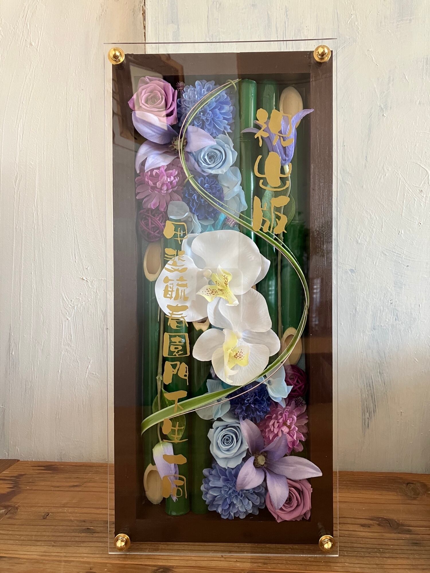 ロングサイズのウッドフレームに竹とプリザーブドフラワーと造花をバランスよく詰め込み、アクリル板にはカッティングシートでメッセージをお入れします。