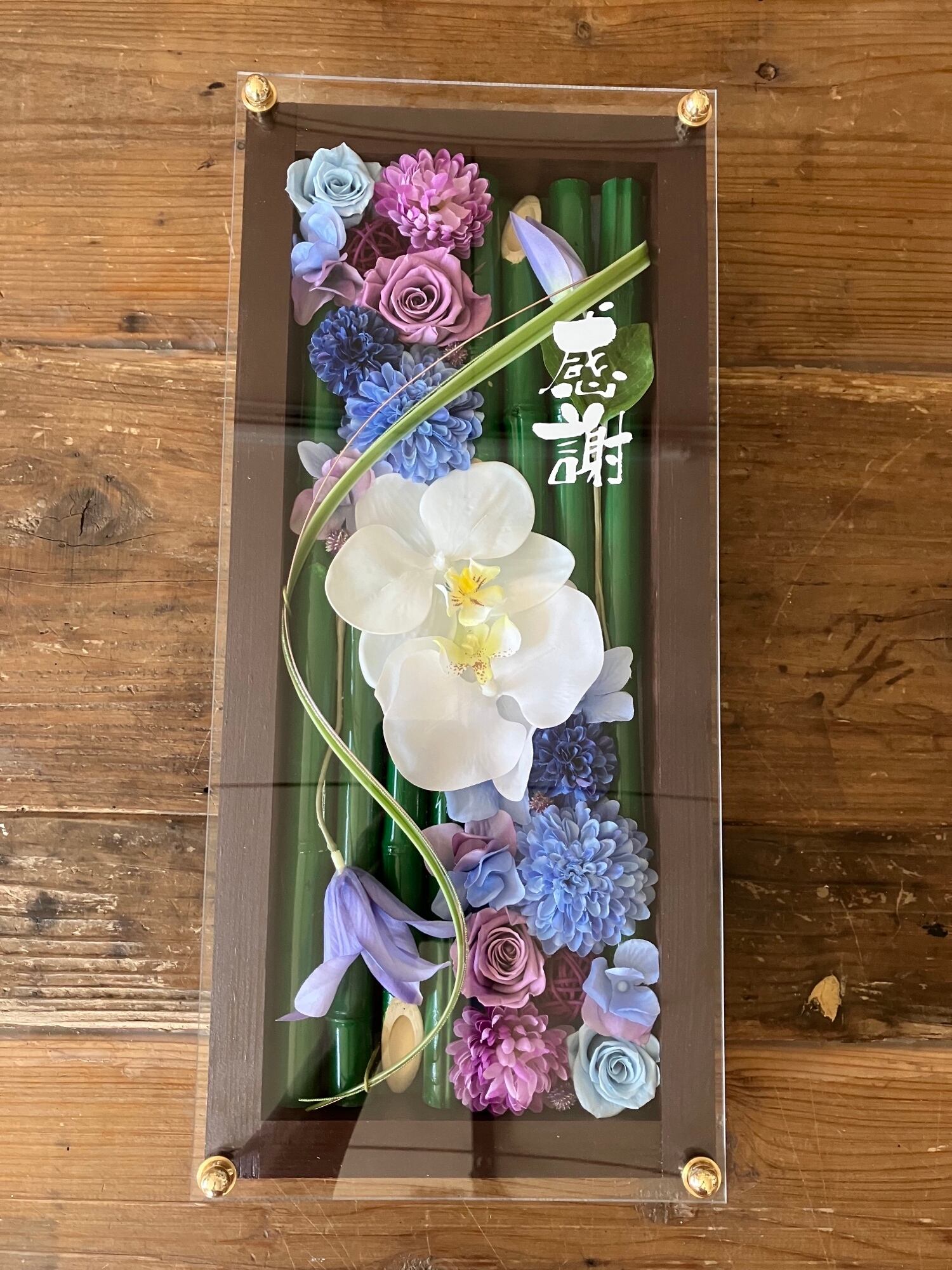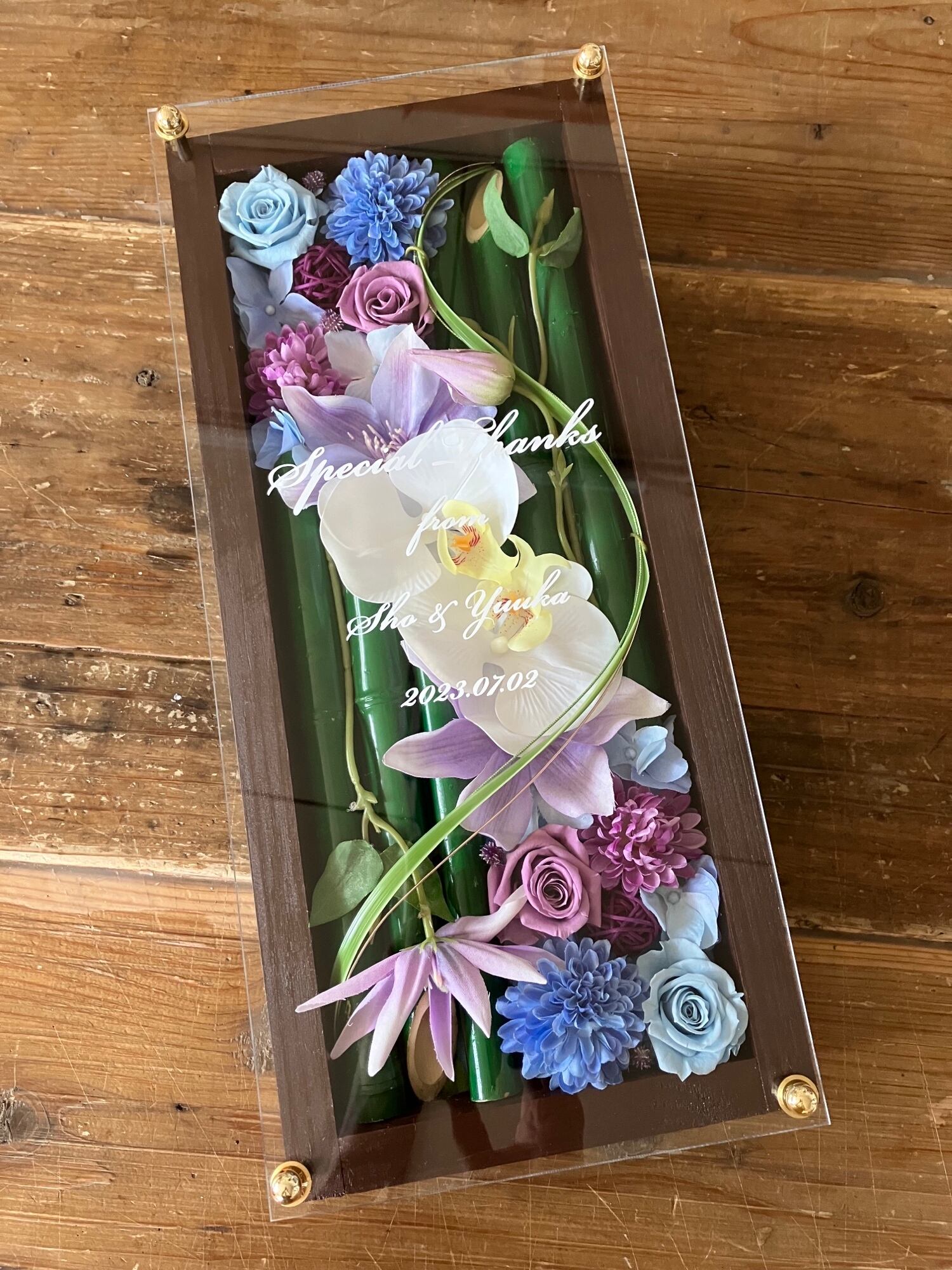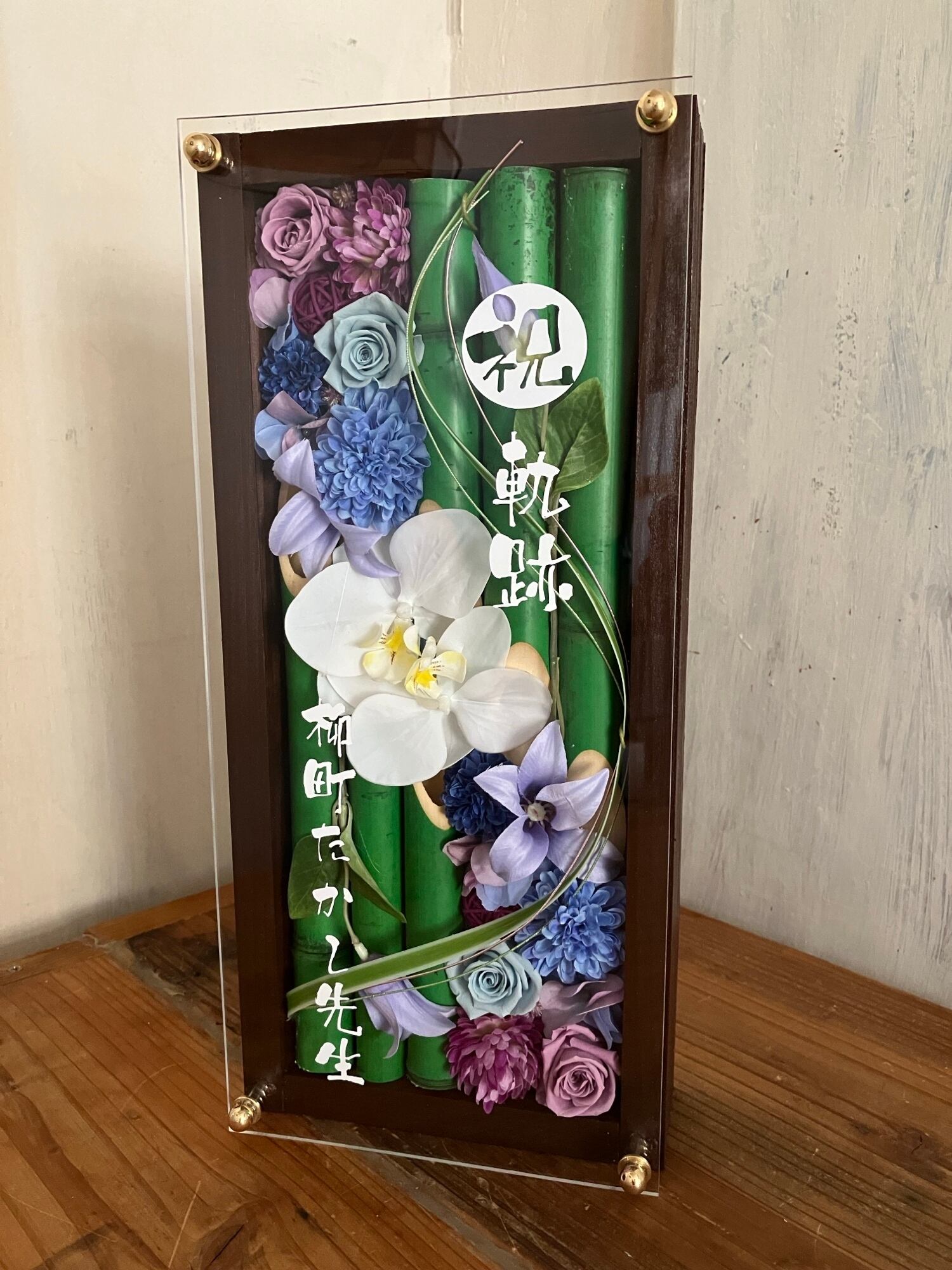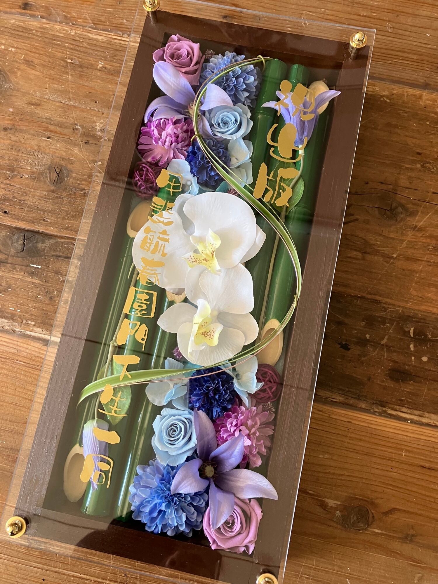 ロングサイズのウッドフレームに竹とプリザーブドフラワーと造花をバランスよく詰め込み、アクリル板にはカッティングシートでメッセージをお入れします。