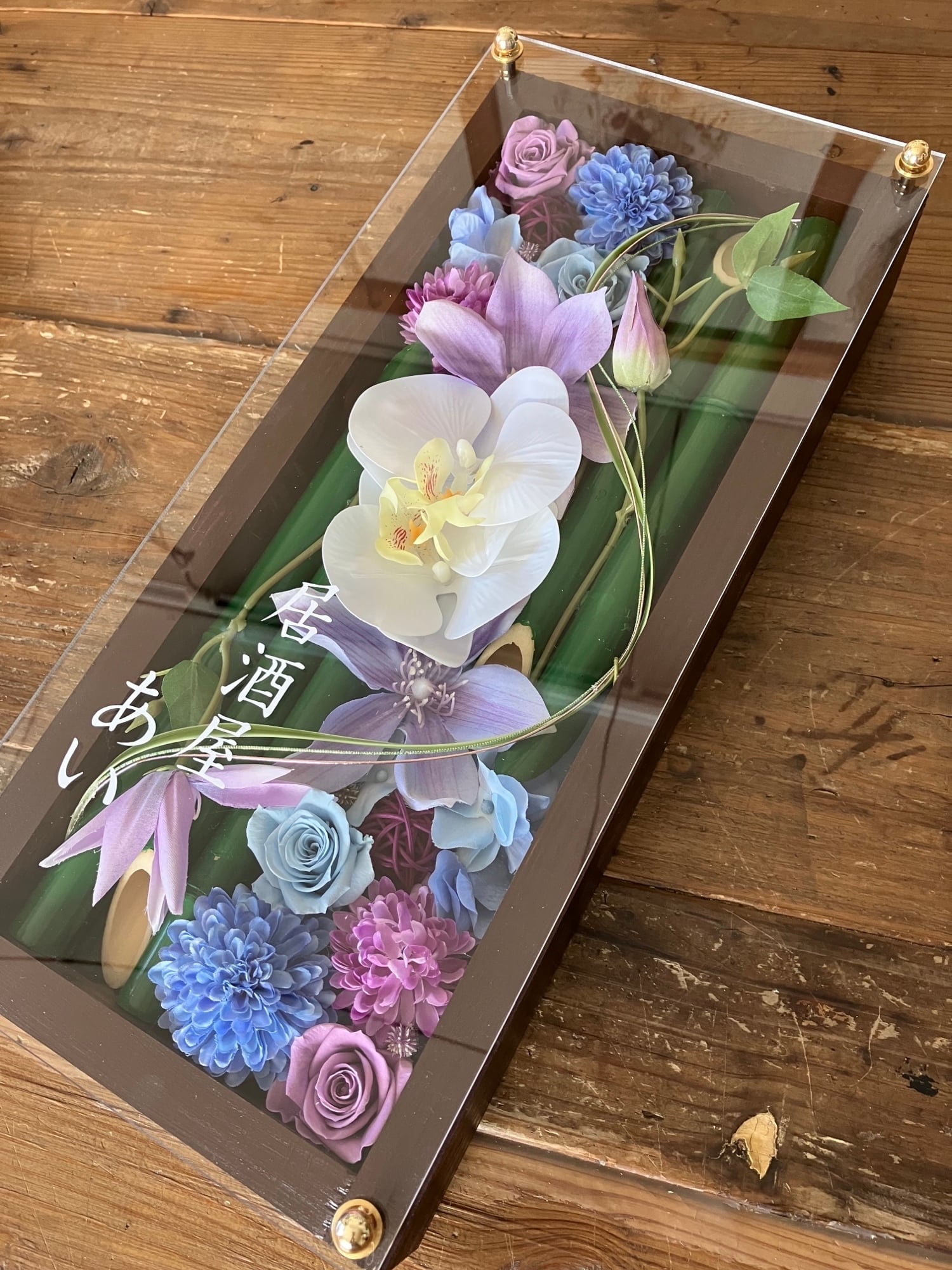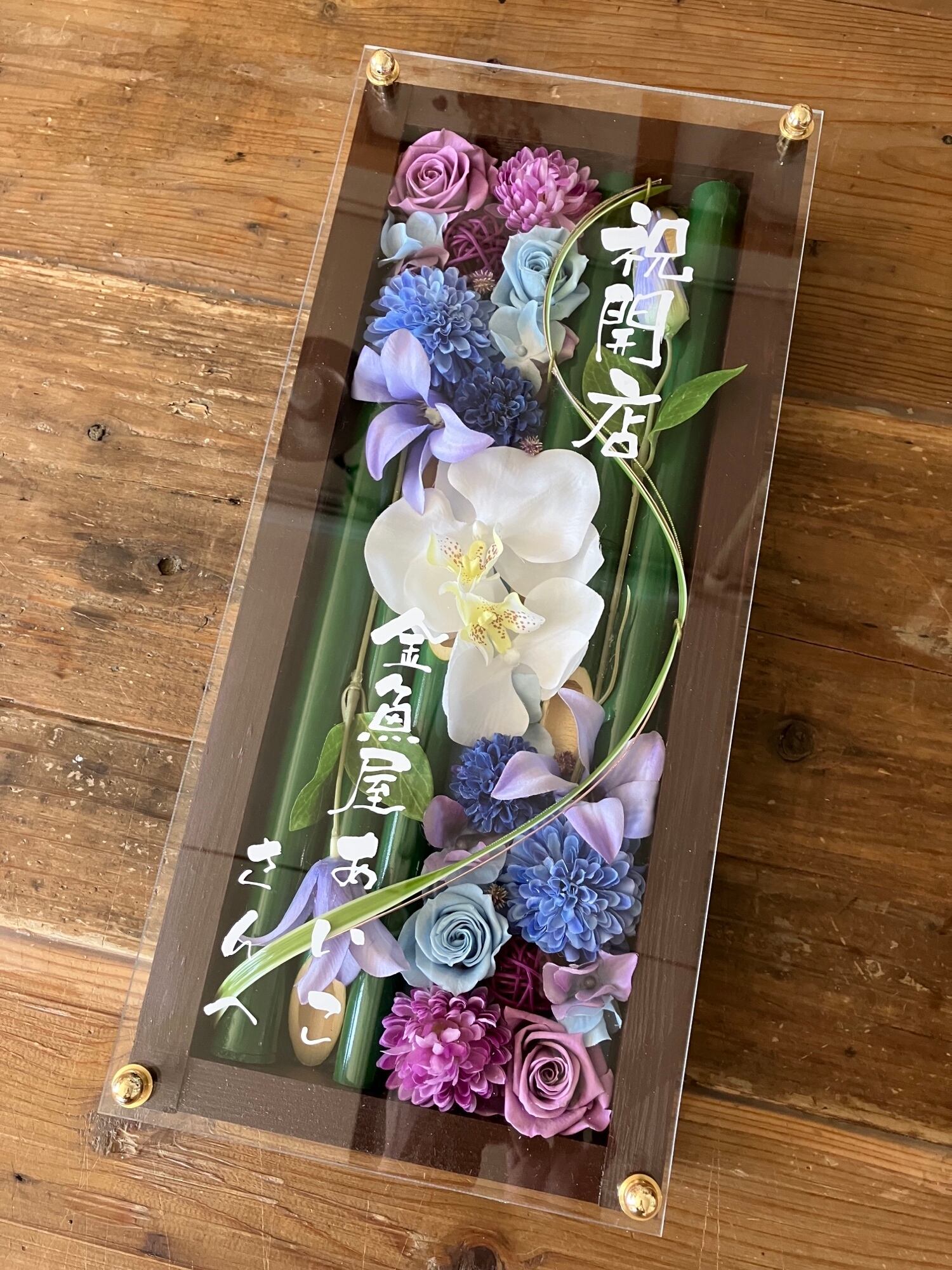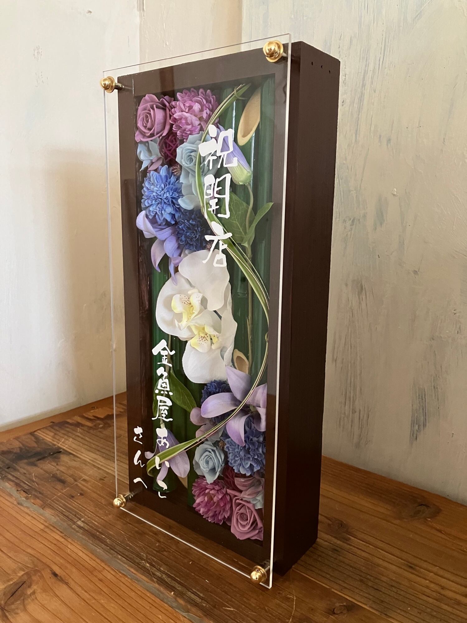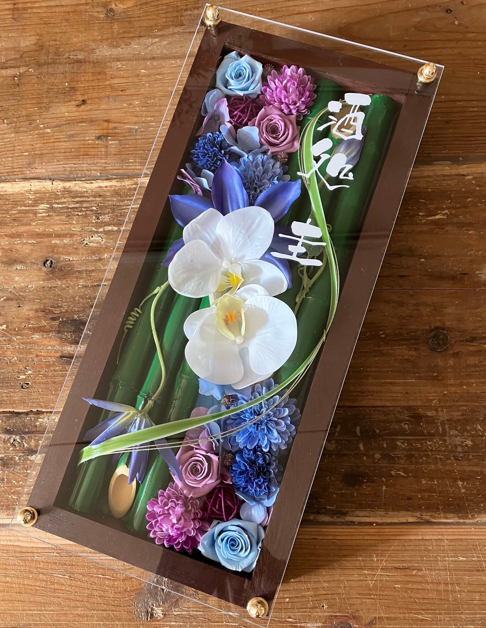 ロングサイズのウッドフレームに竹とプリザーブドフラワーと造花をバランスよく詰め込み、アクリル板にはカッティングシートでメッセージをお入れします。