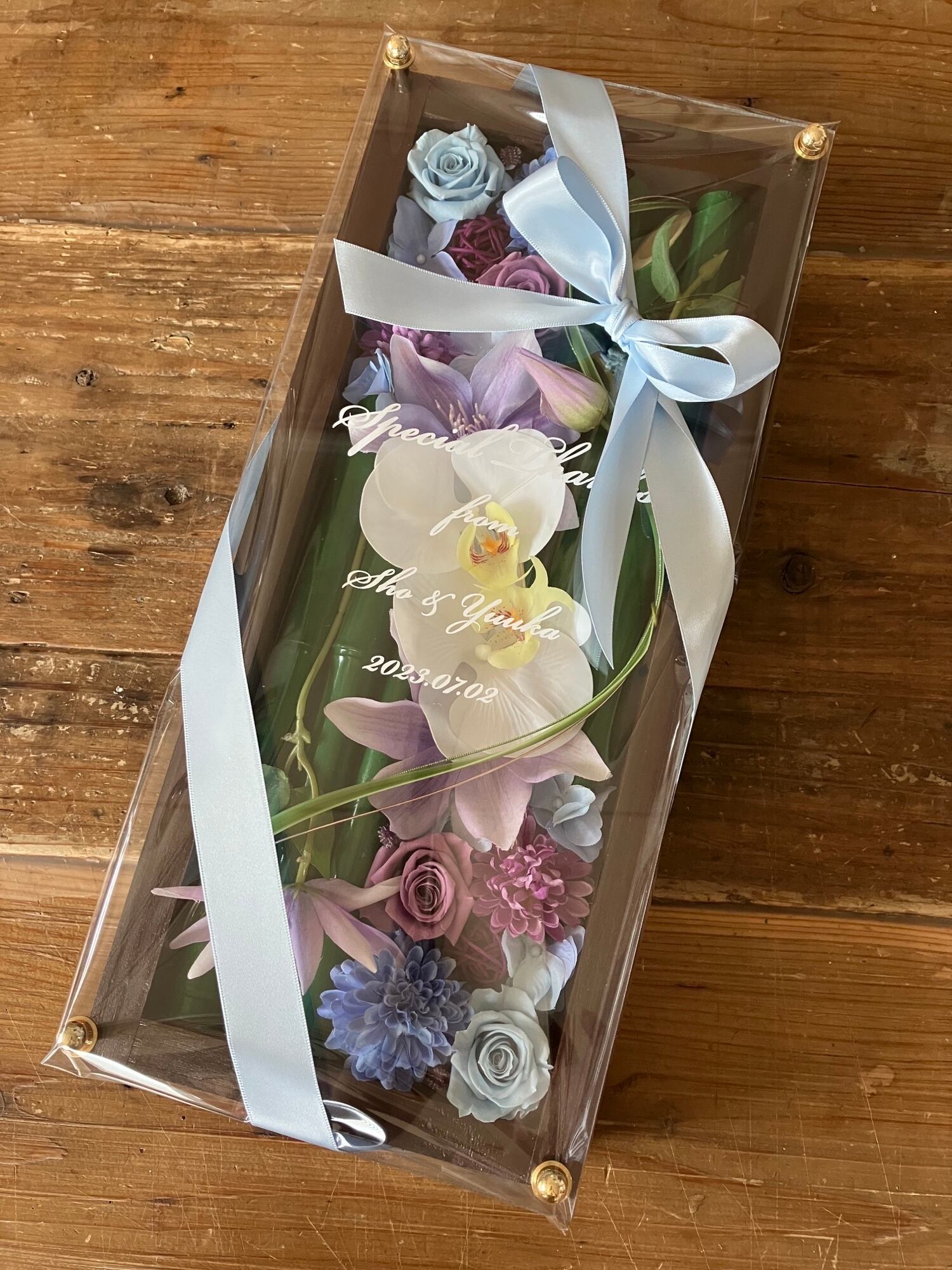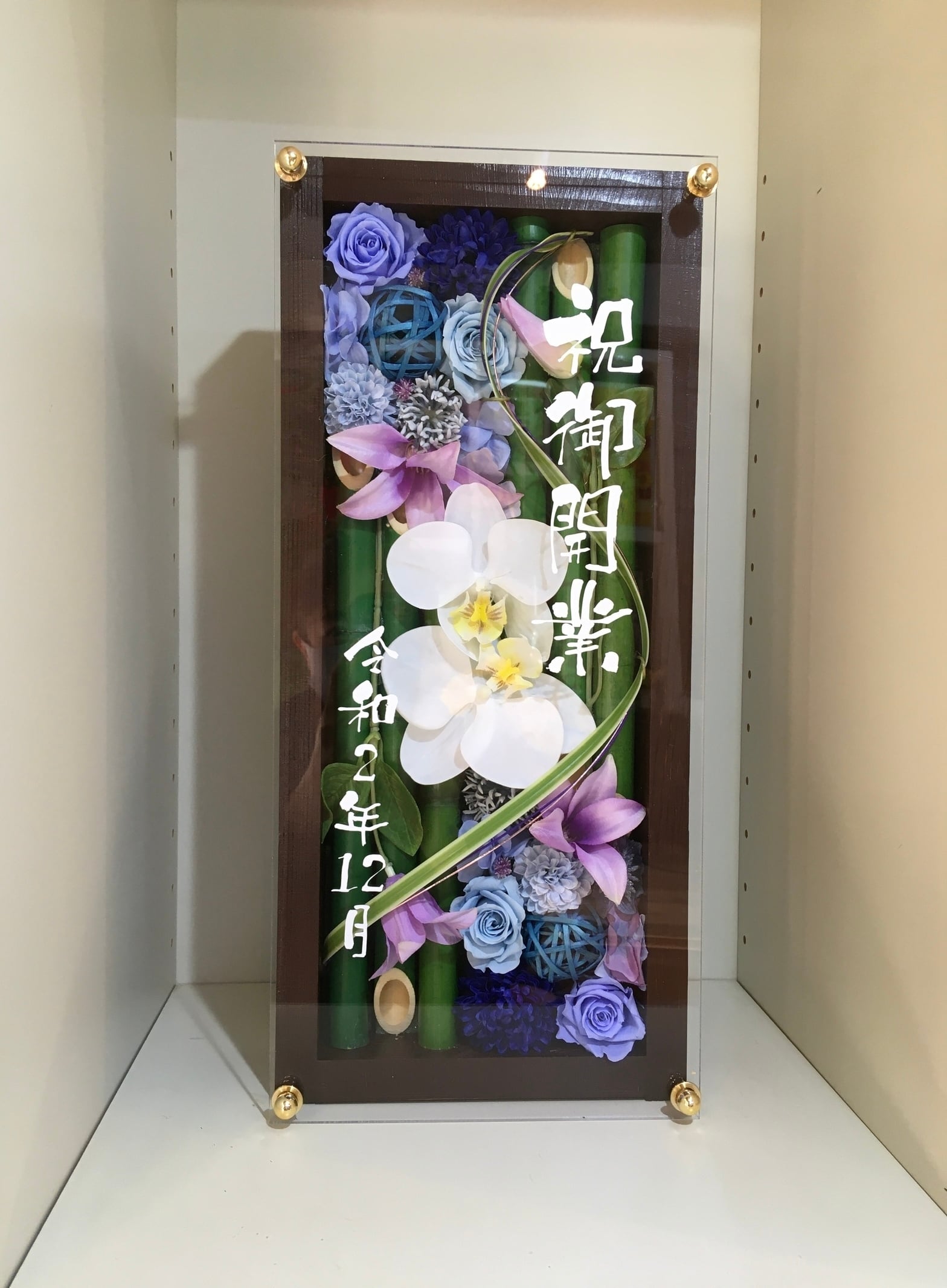 お花のギフト|プリザーブドフラワーアレンジ 和風 木枠ロング〈竹 青紫 〉名入れ可/開店・開業祝い・結婚式両親贈呈品に