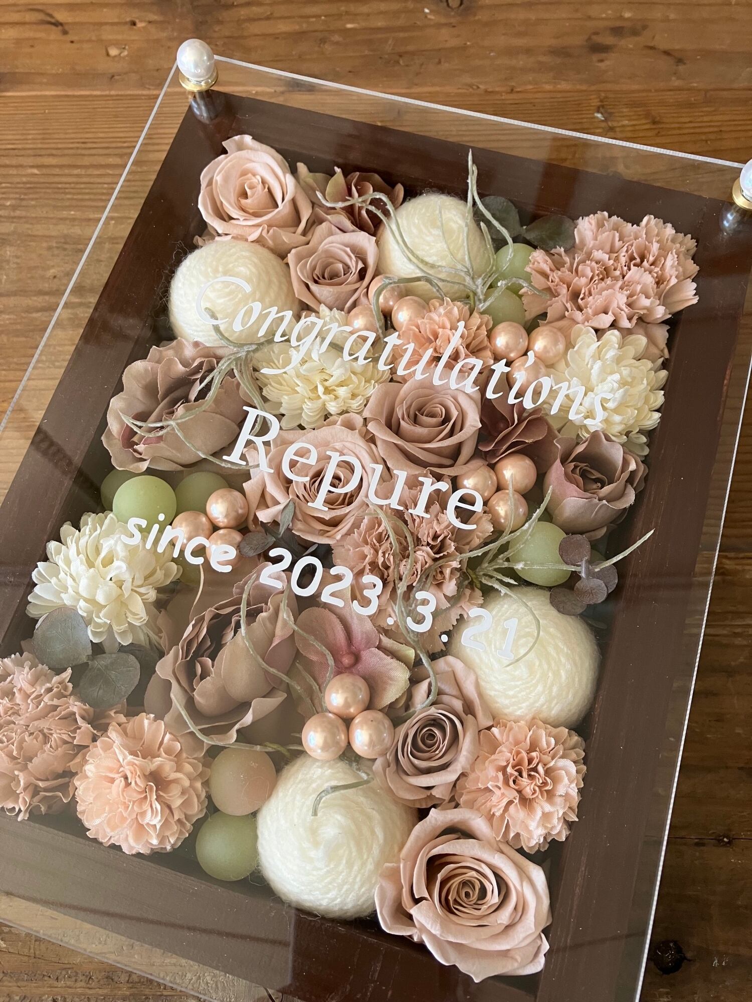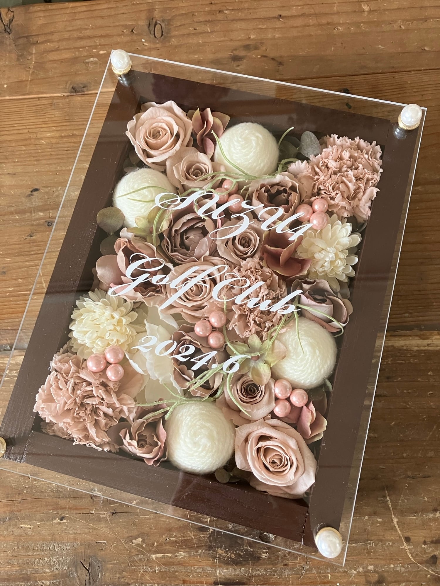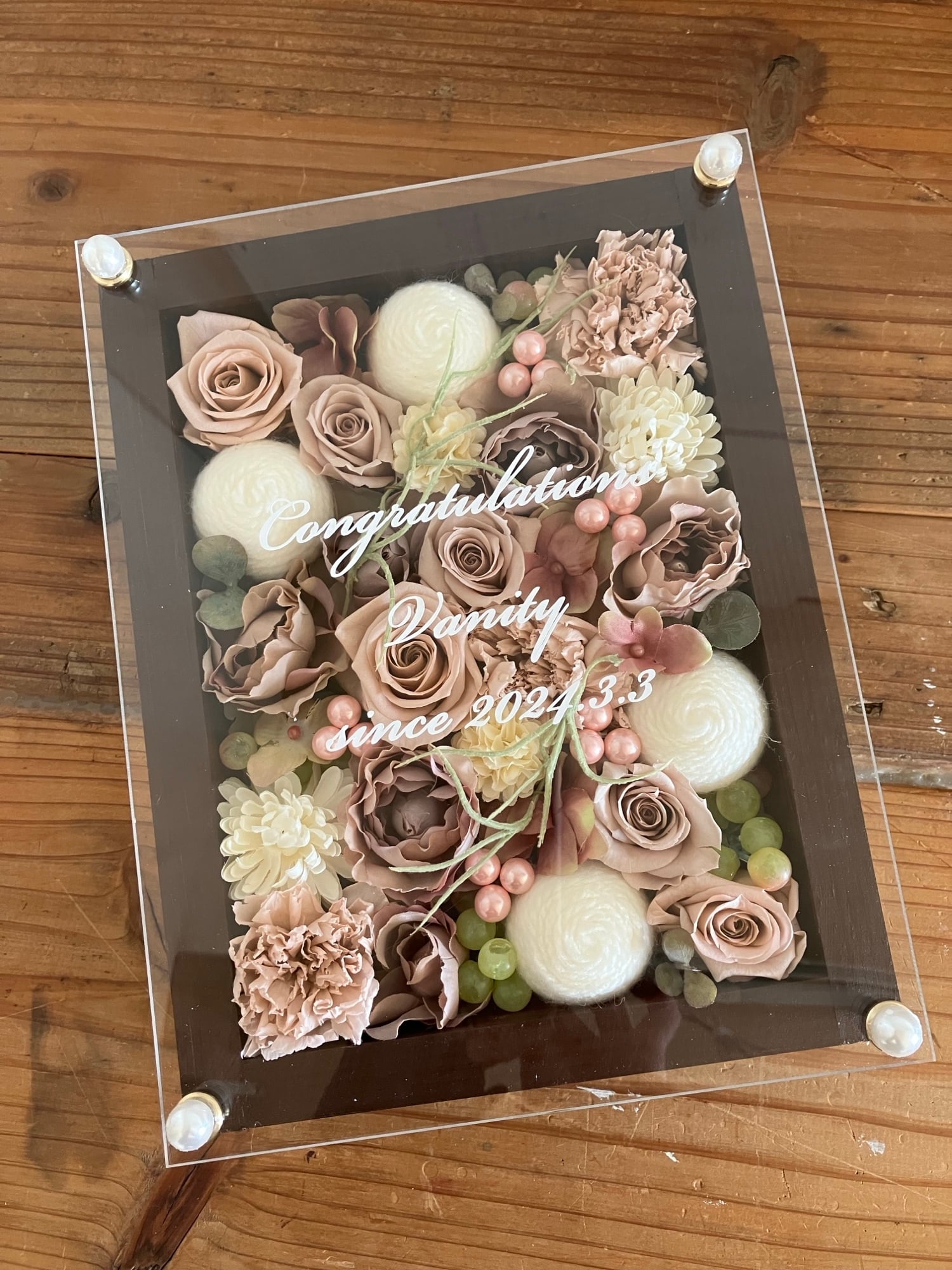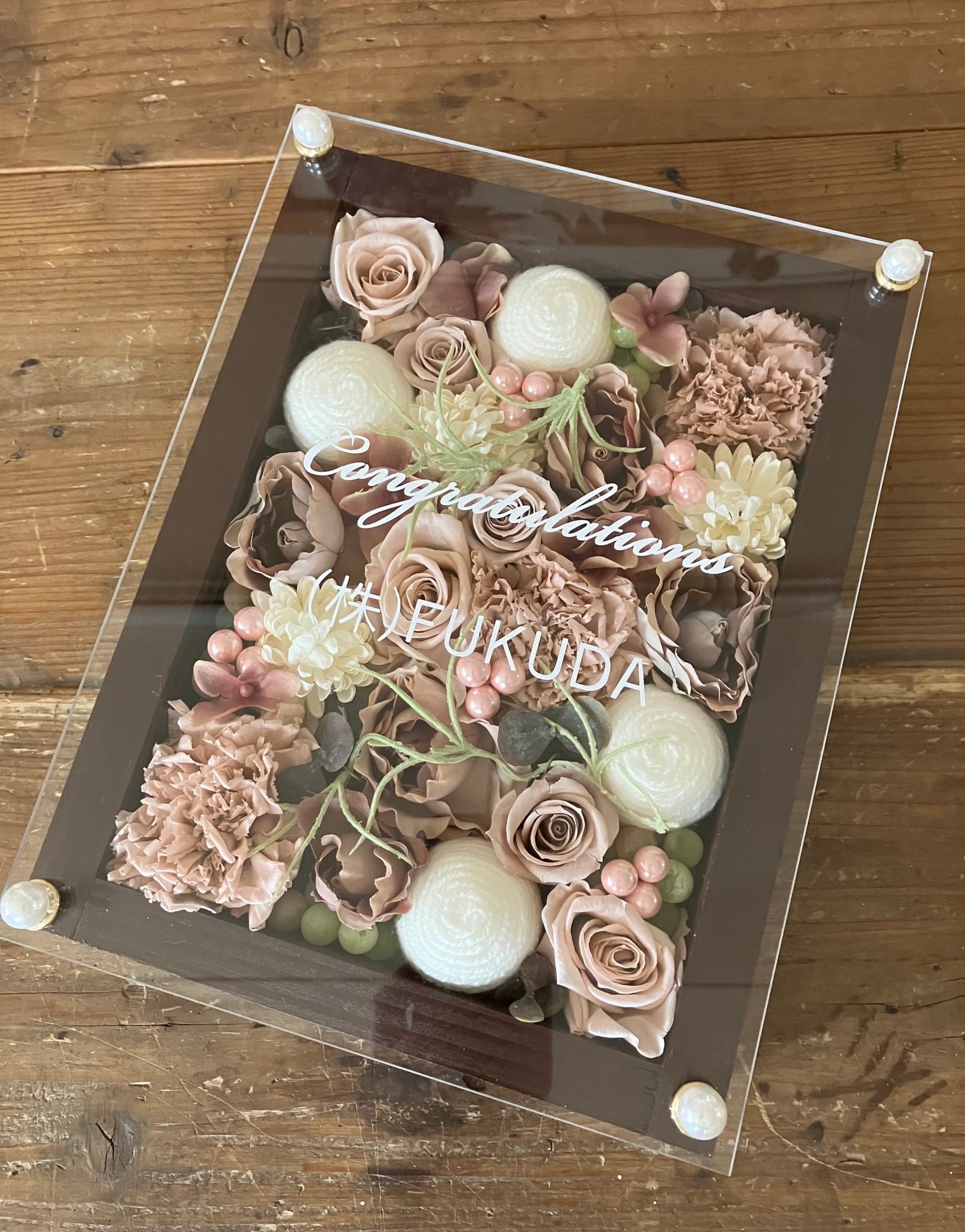 茶色のウッドフレームにプリザーブドフラワーと造花をぎっしり詰め込み、アクリル板にはカッティングシートでメッセージをお入れします。