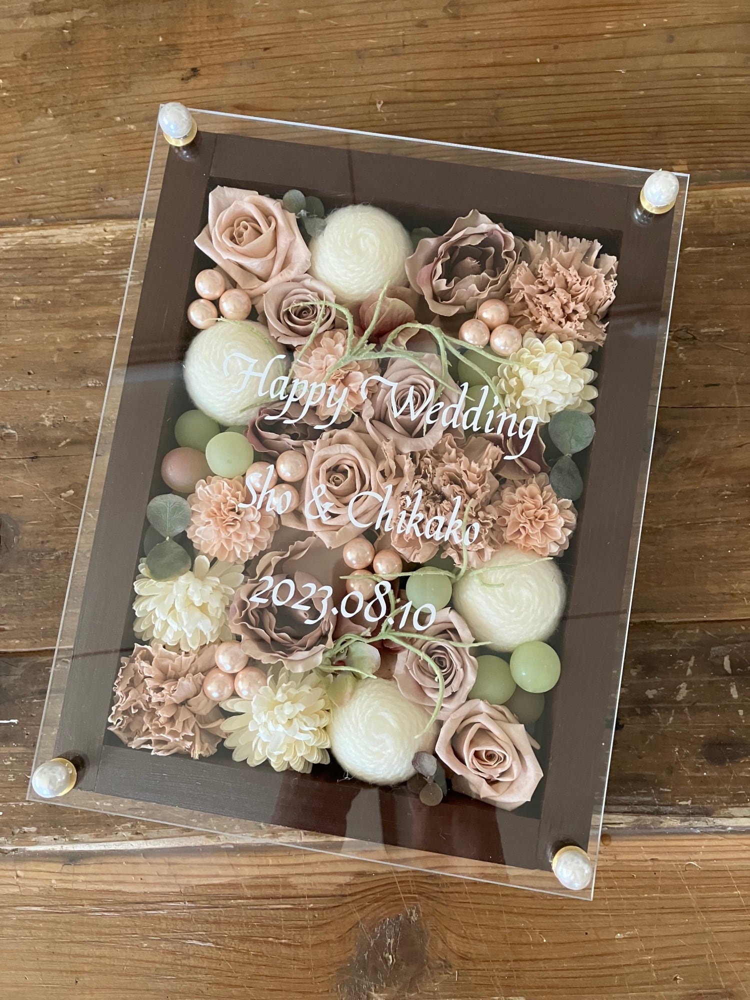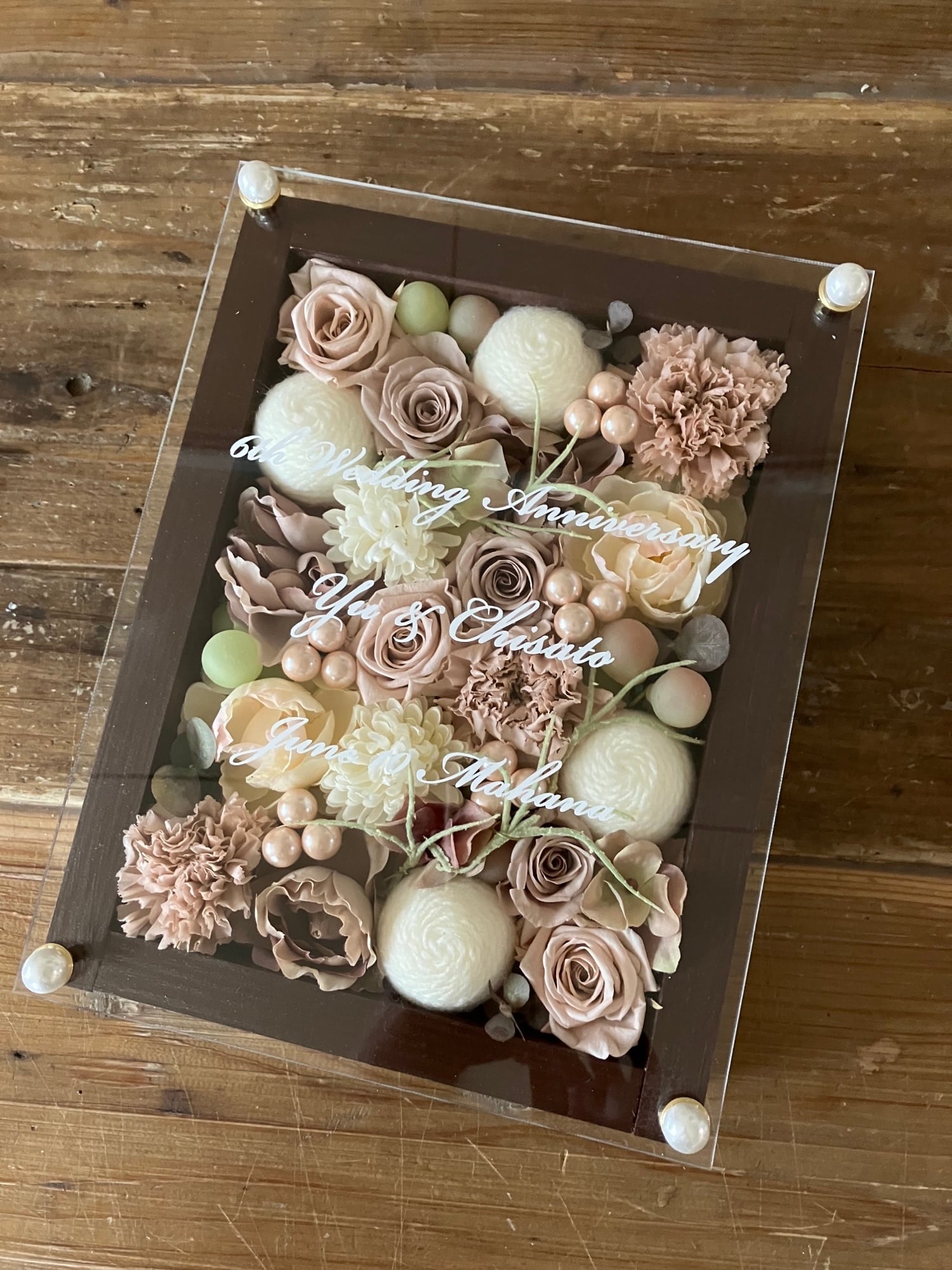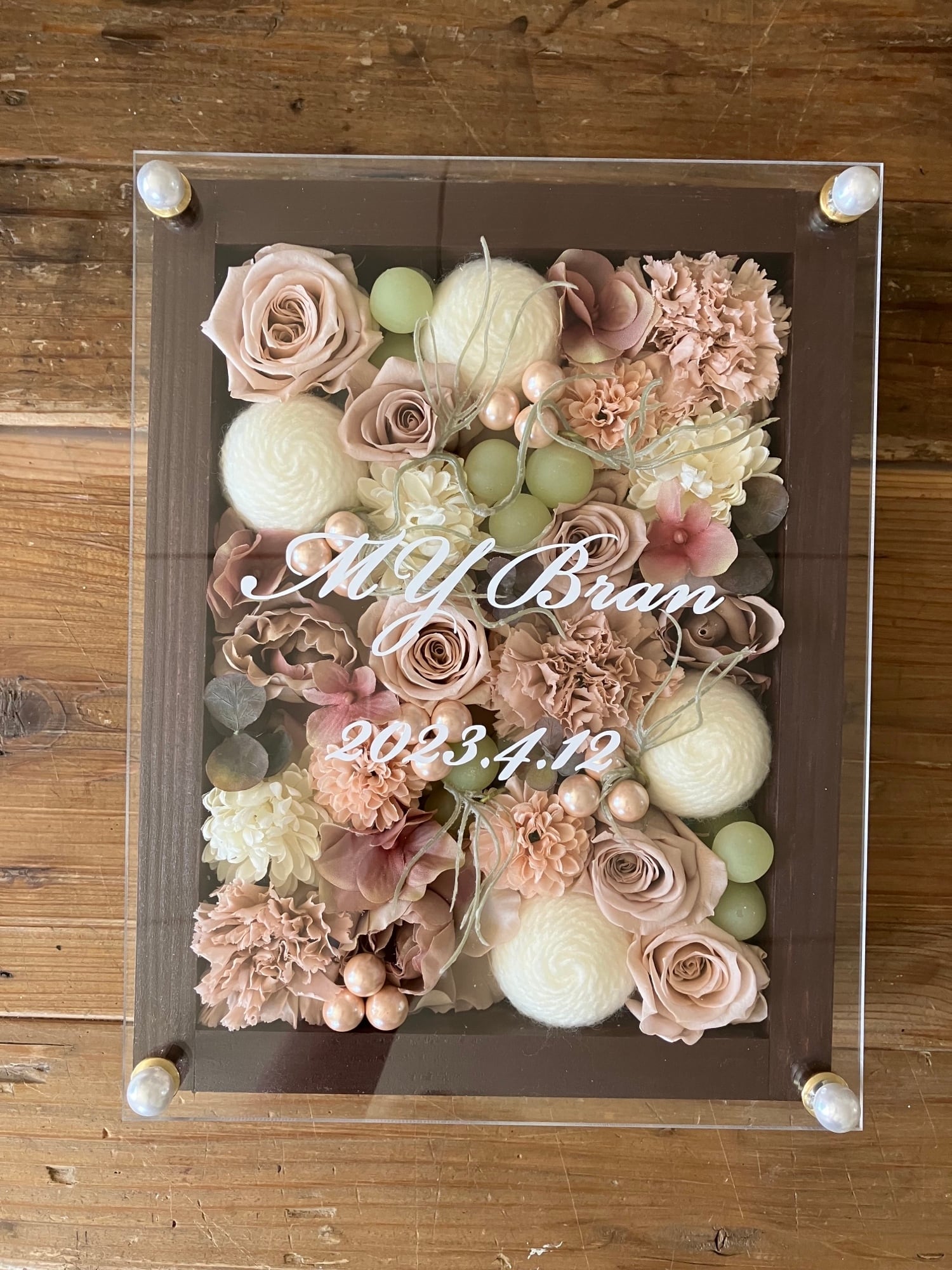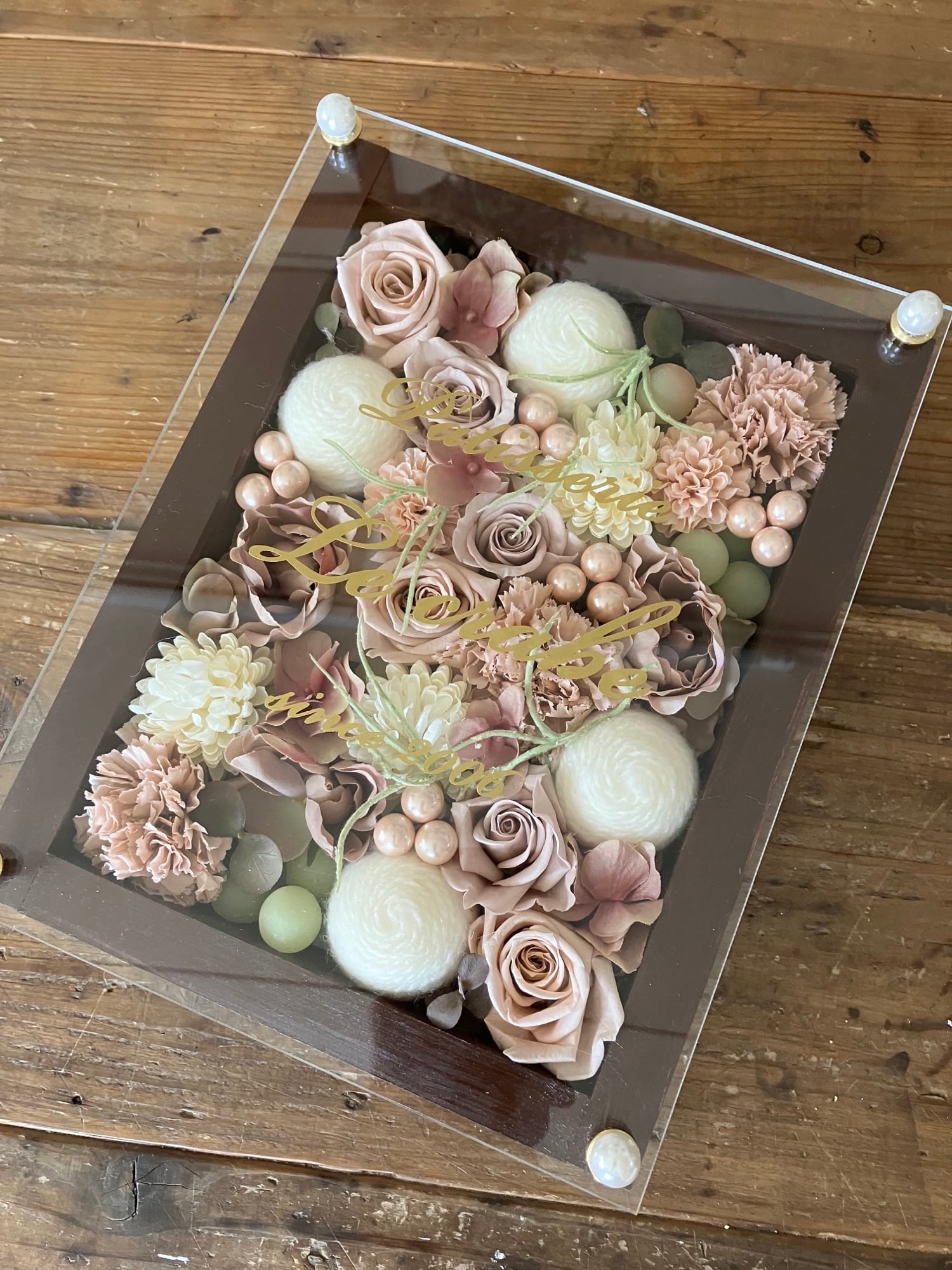 茶色のウッドフレームにプリザーブドフラワーと造花をぎっしり詰め込み、アクリル板にはカッティングシートでメッセージをお入れします。