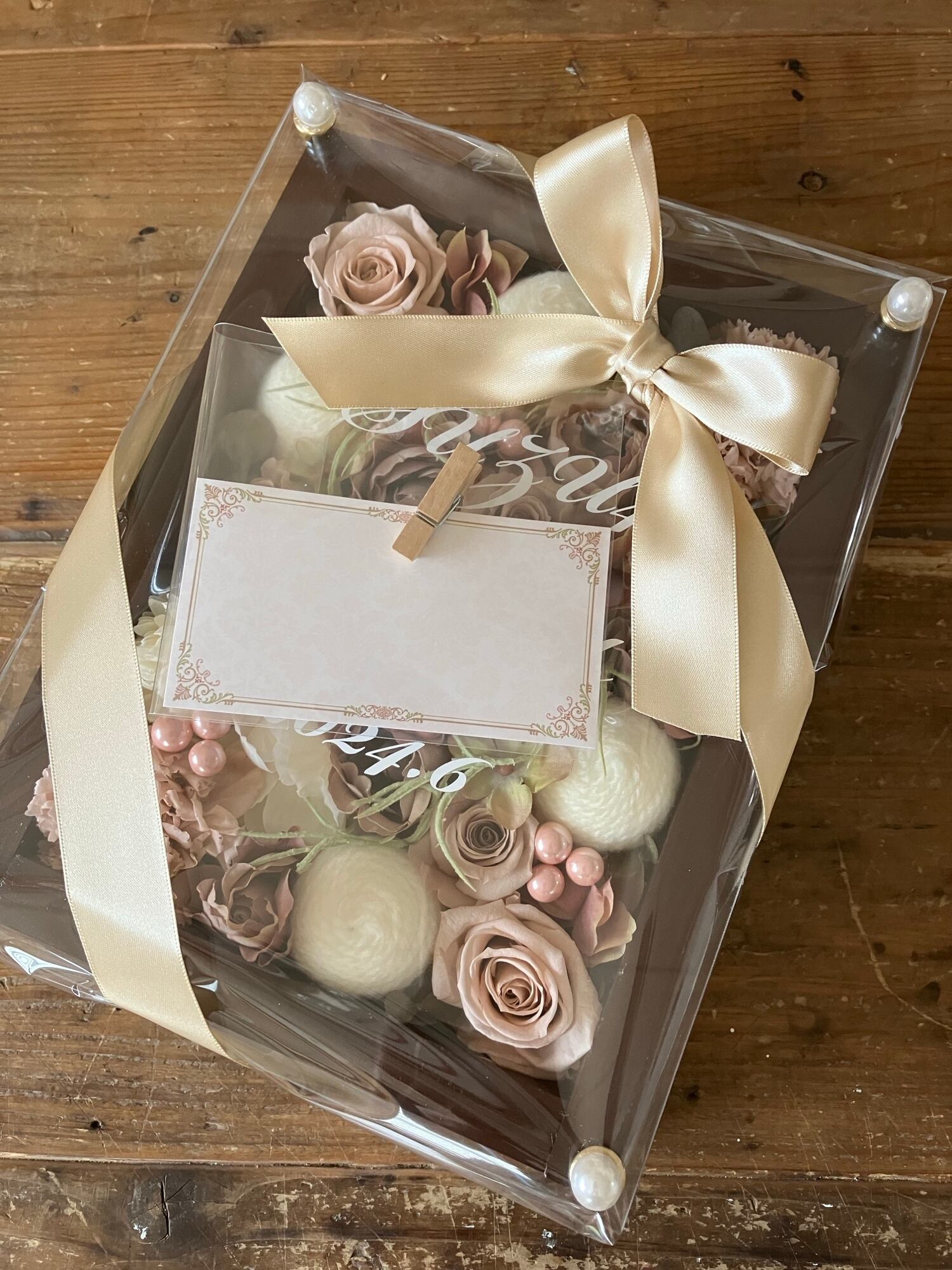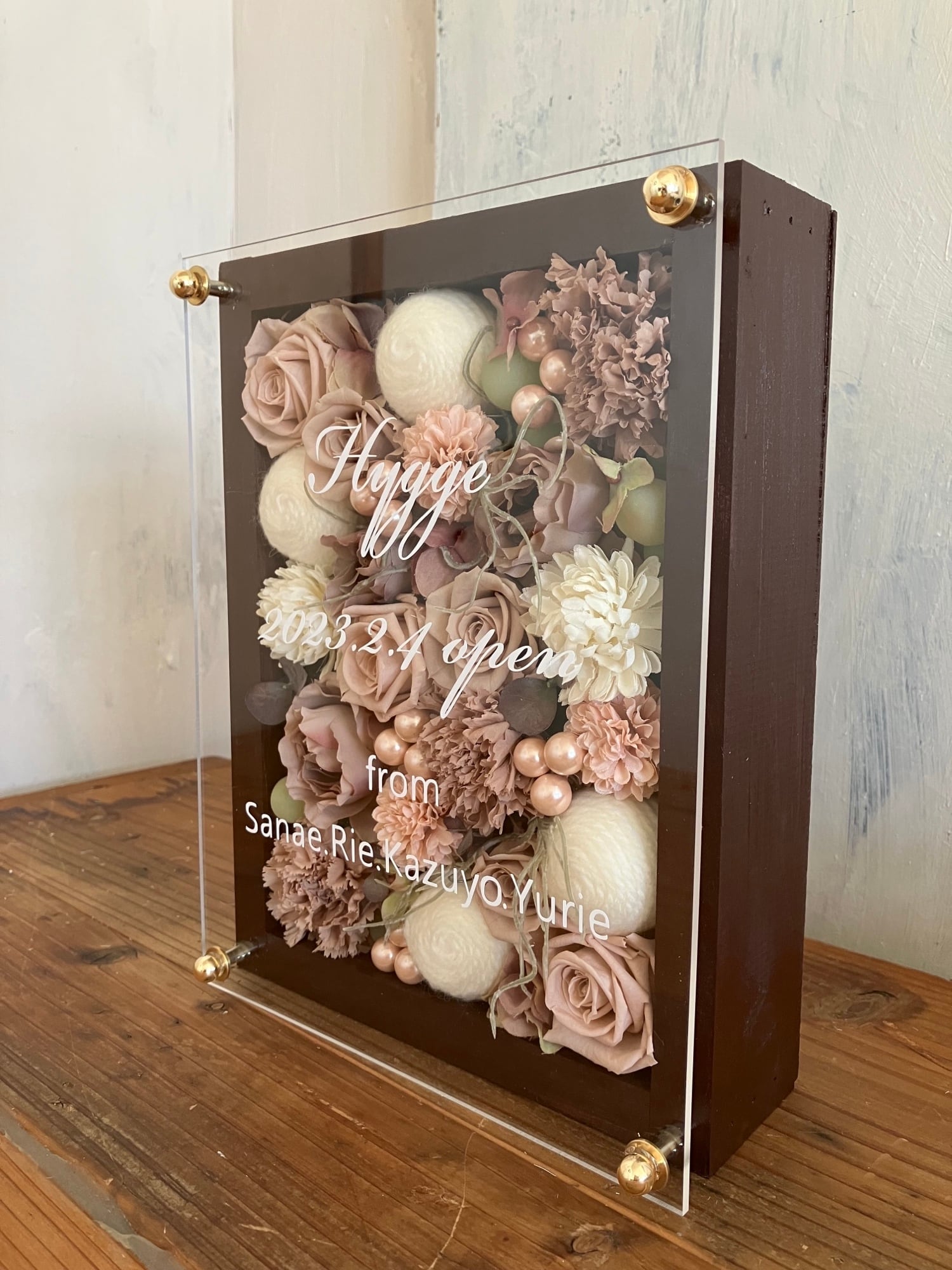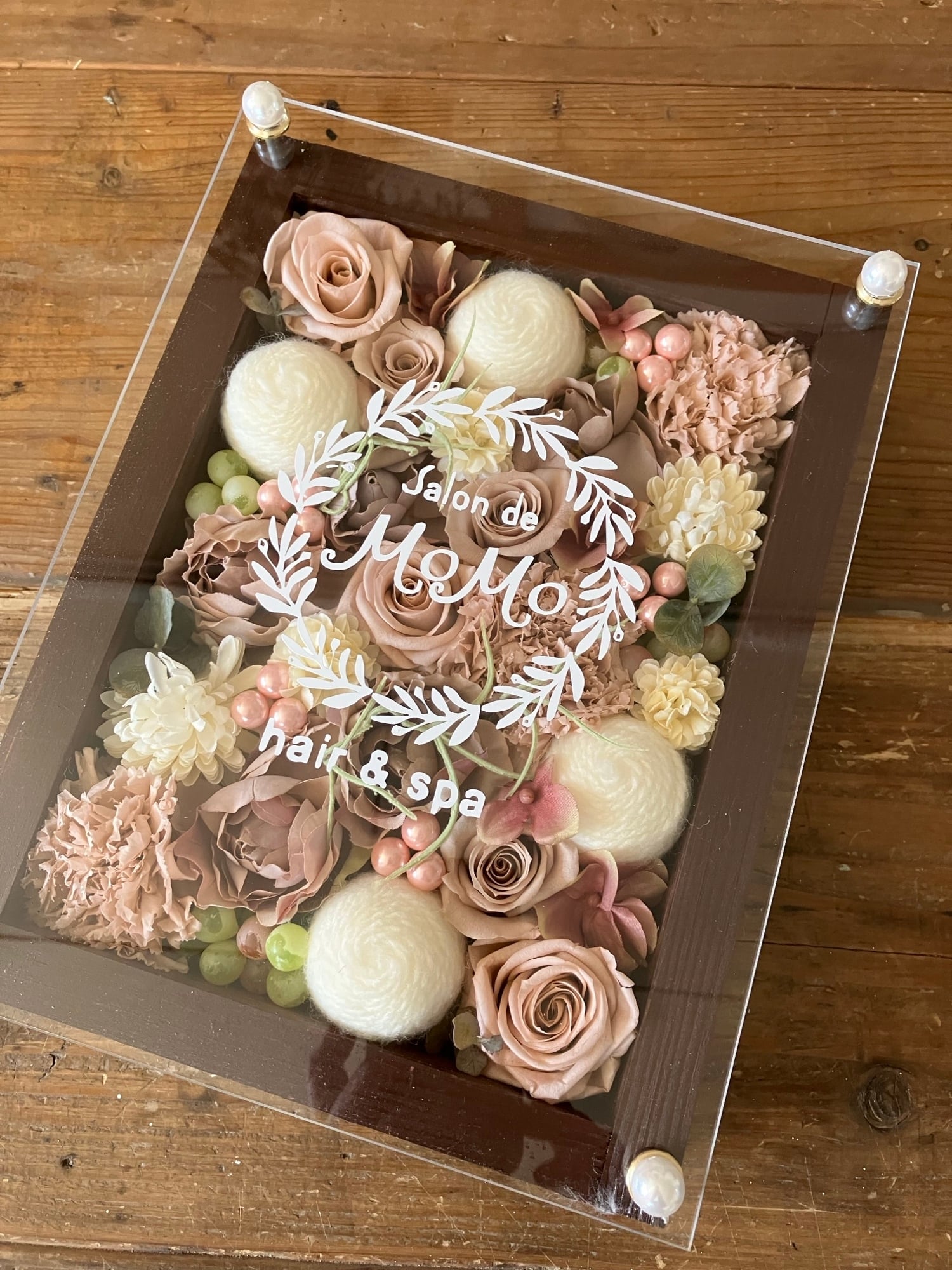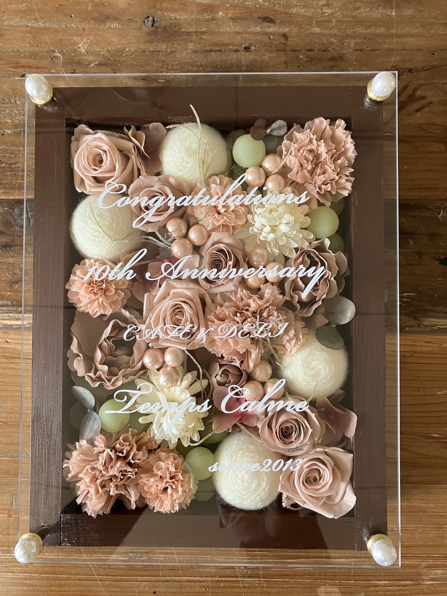 茶色のウッドフレームにプリザーブドフラワーと造花をぎっしり詰め込み、アクリル板にはカッティングシートでメッセージをお入れします。