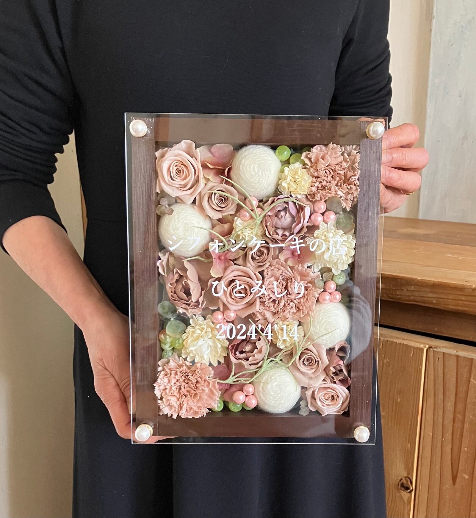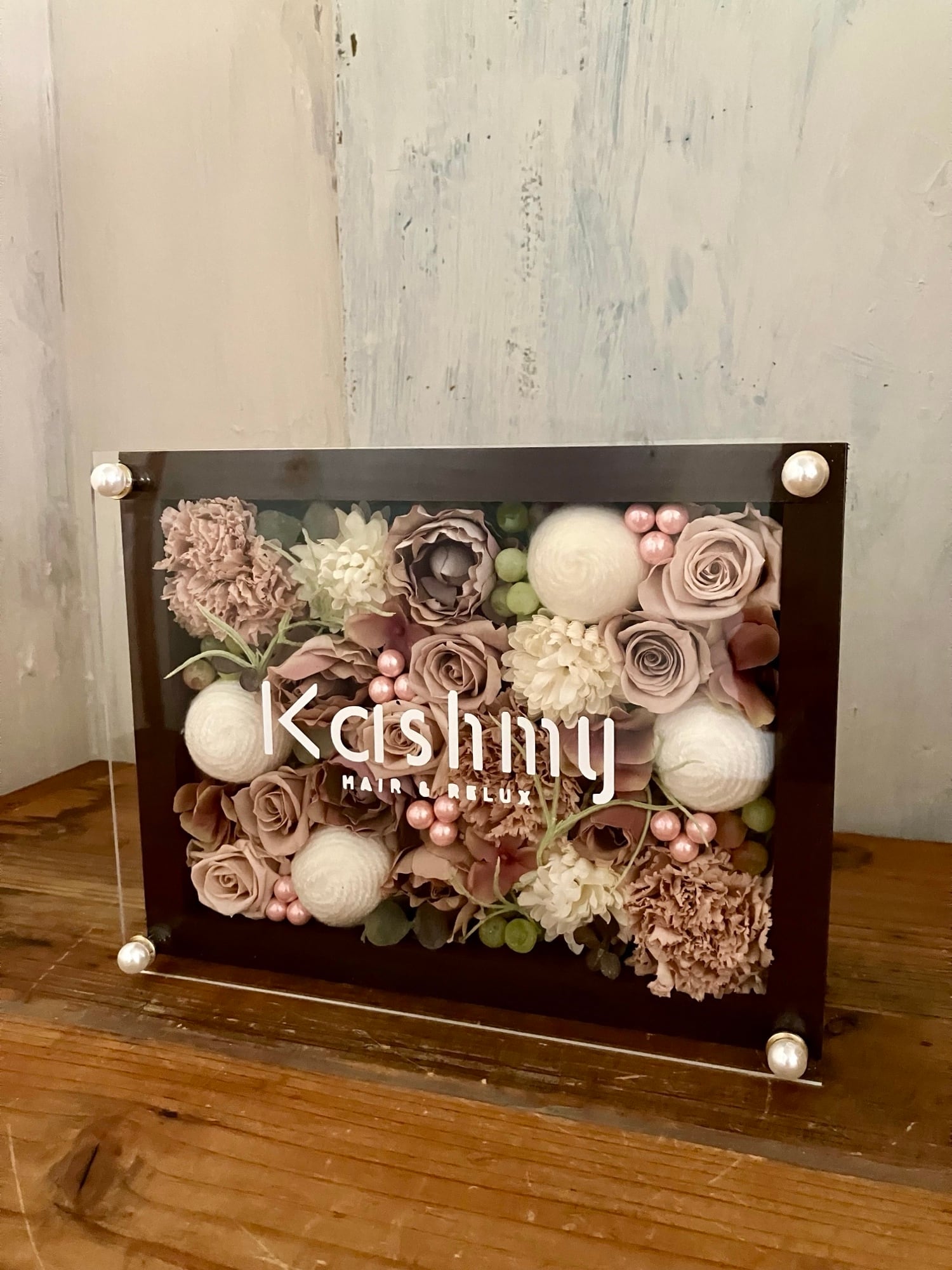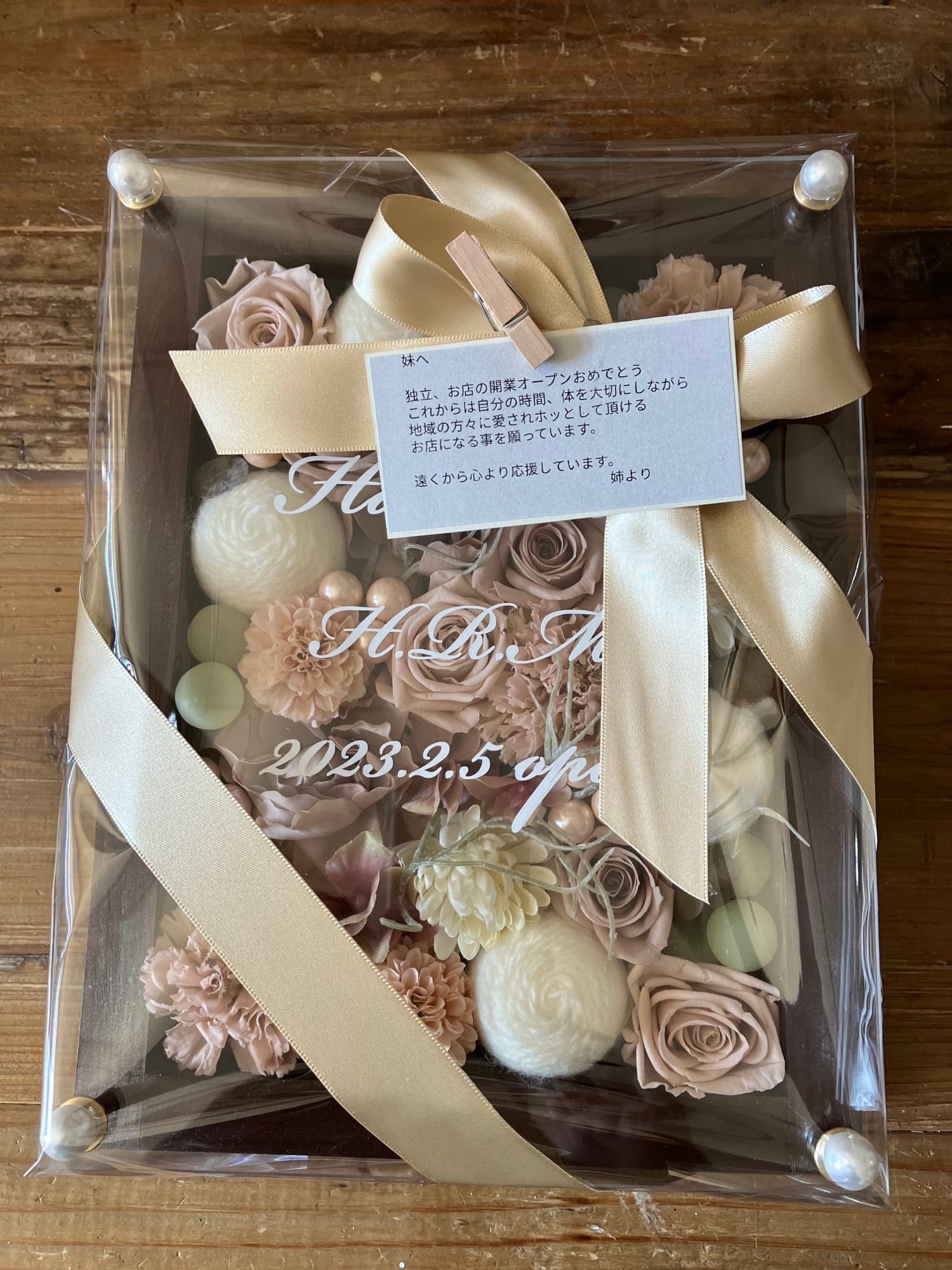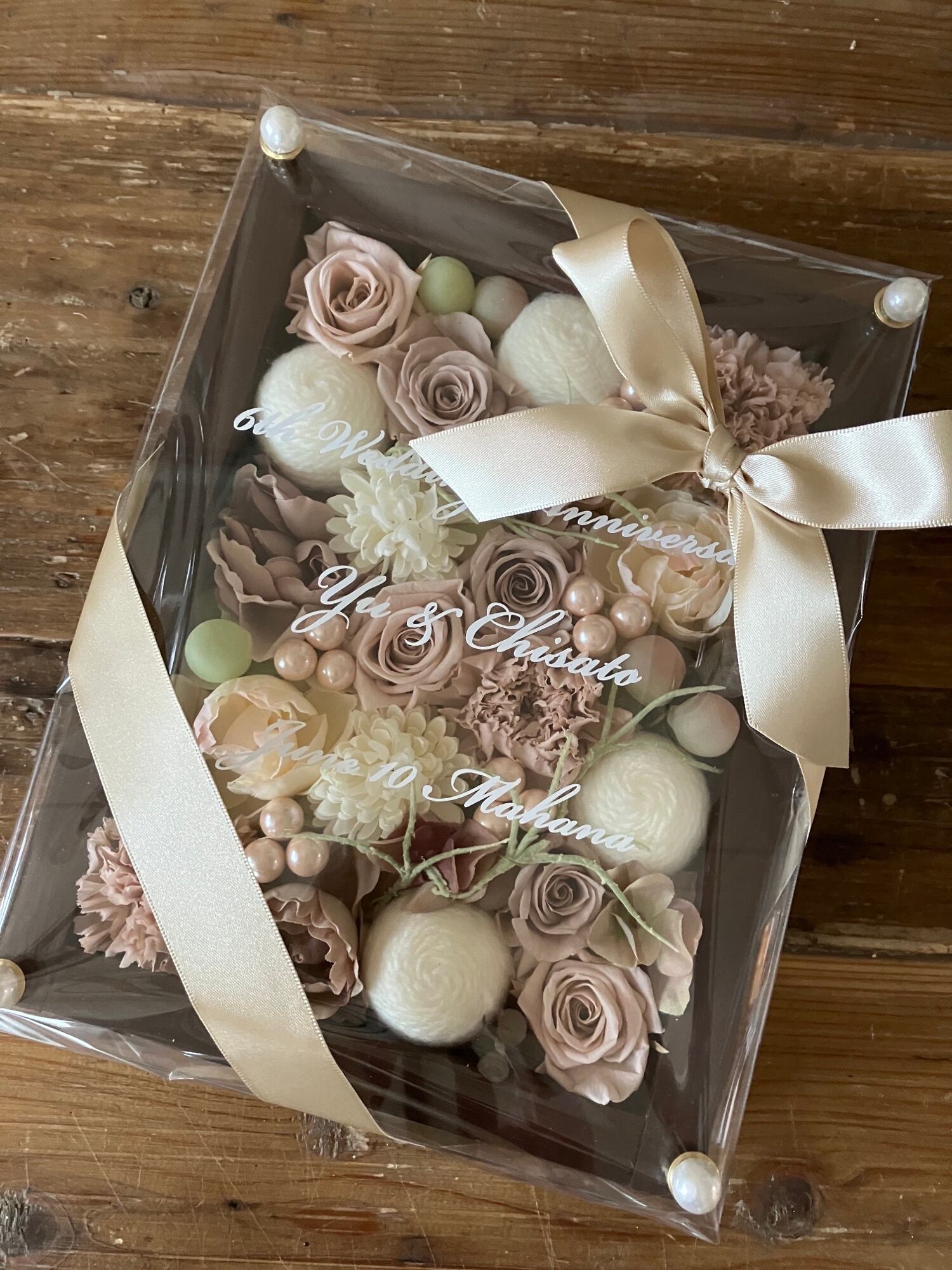茶色のウッドフレームにプリザーブドフラワーと造花をぎっしり詰め込み、アクリル板にはカッティングシートでメッセージをお入れします。