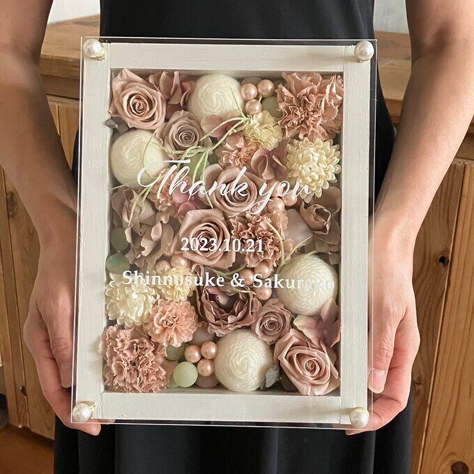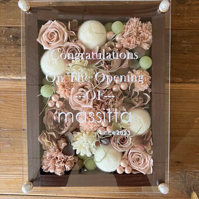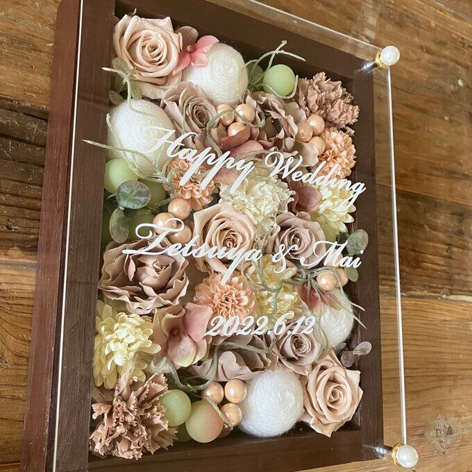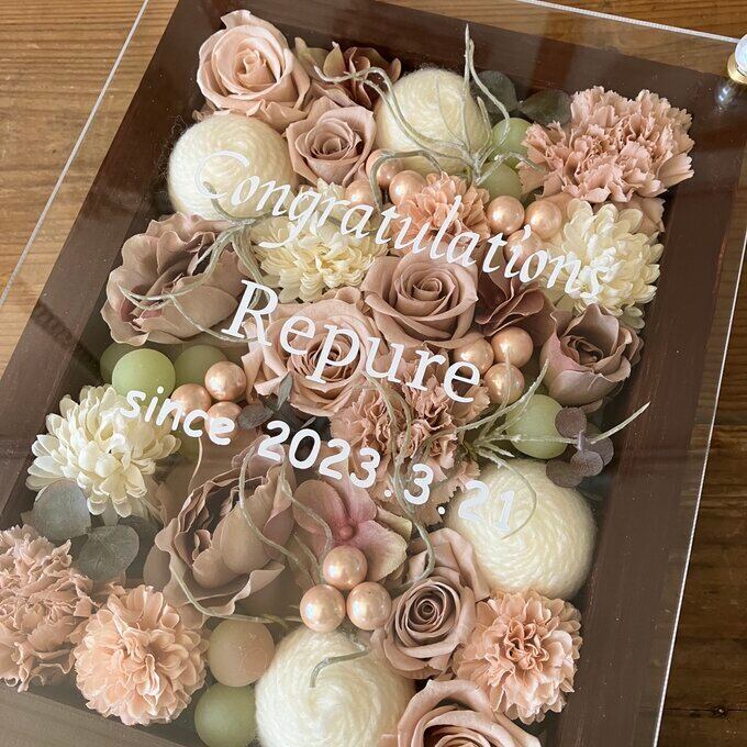 結婚祝い 記念日祝い 開店祝い サロンオープン祝い プリザーブドフラワーアレンジ 木枠〈ヘーゼルナッツ〉文字入れ