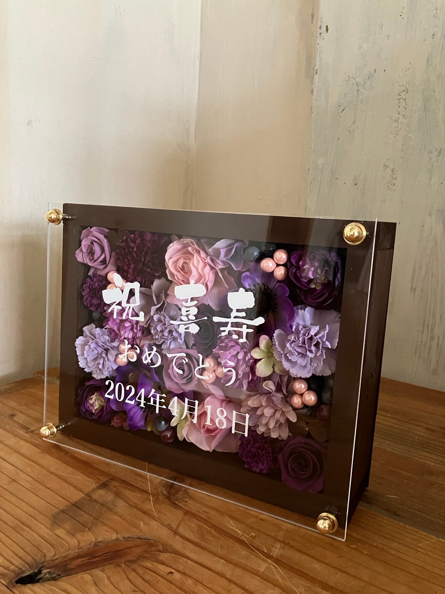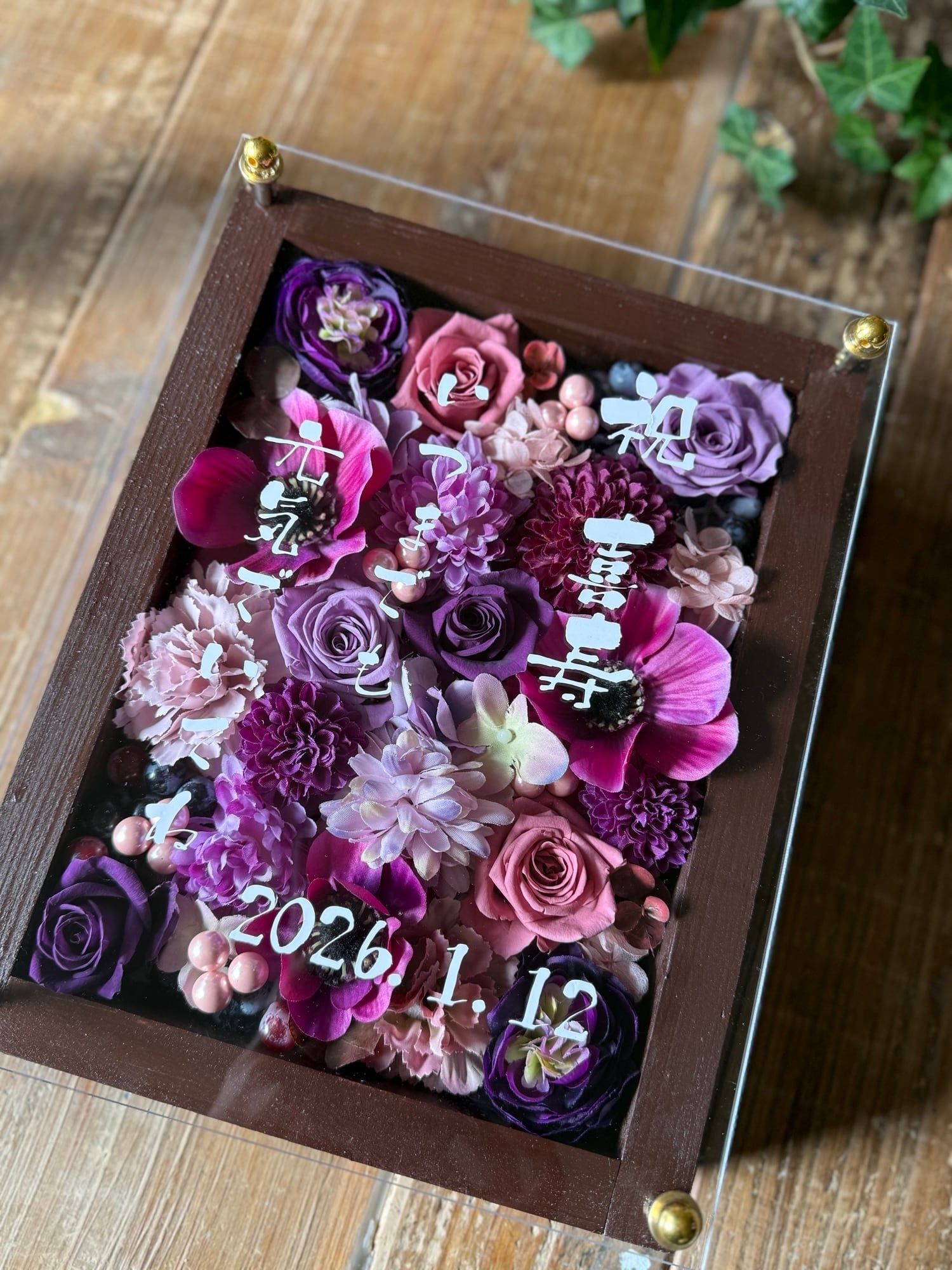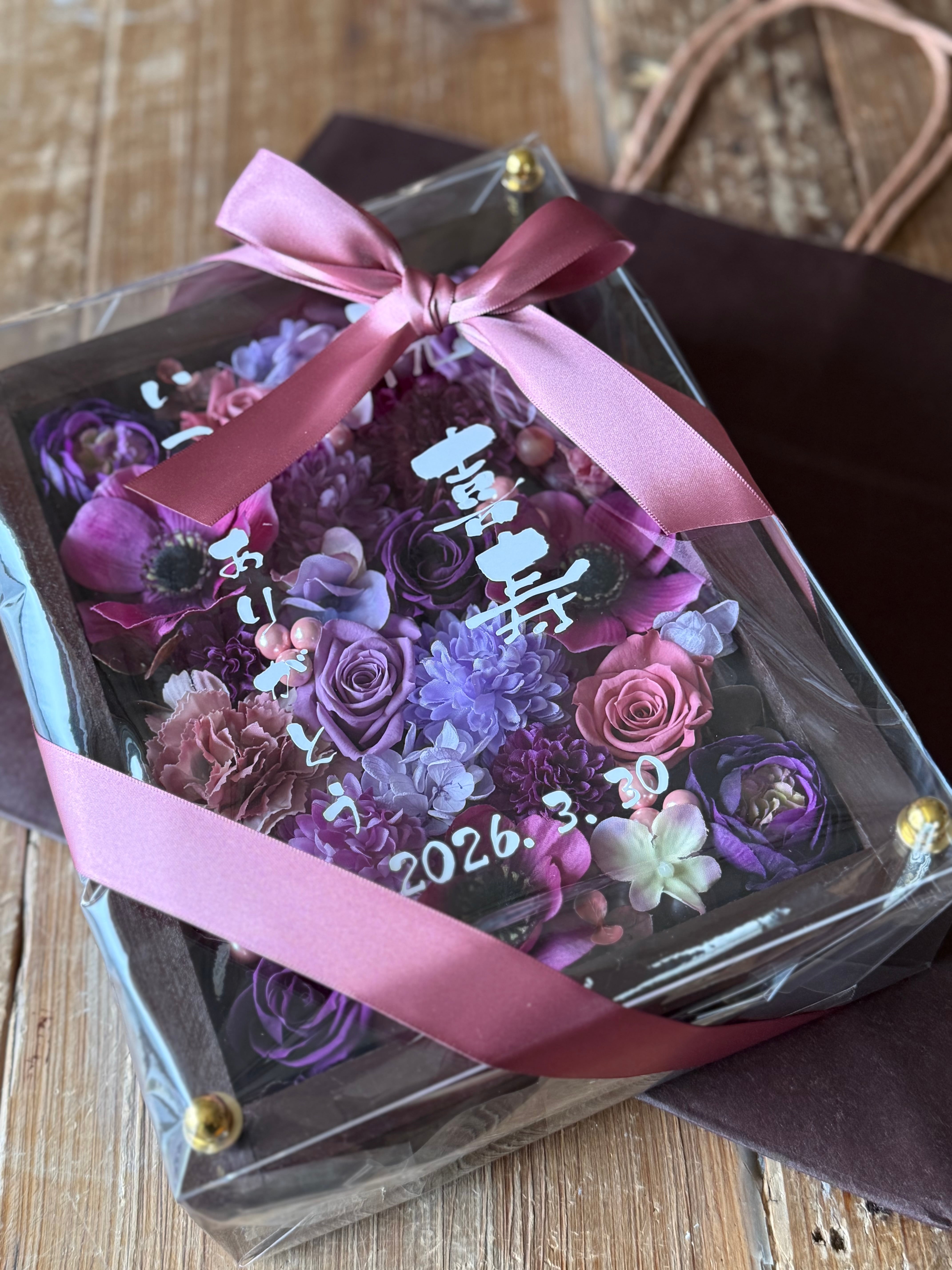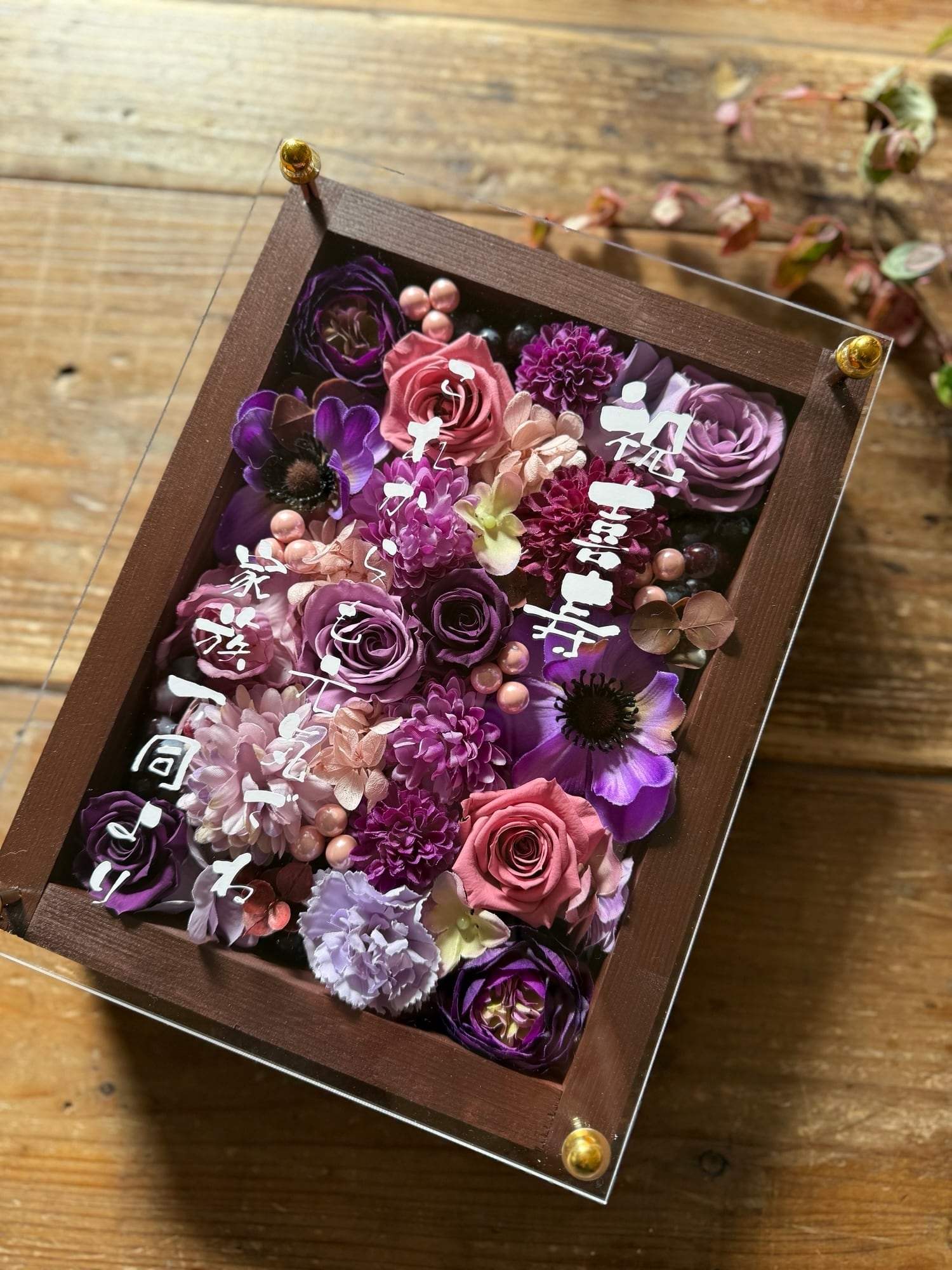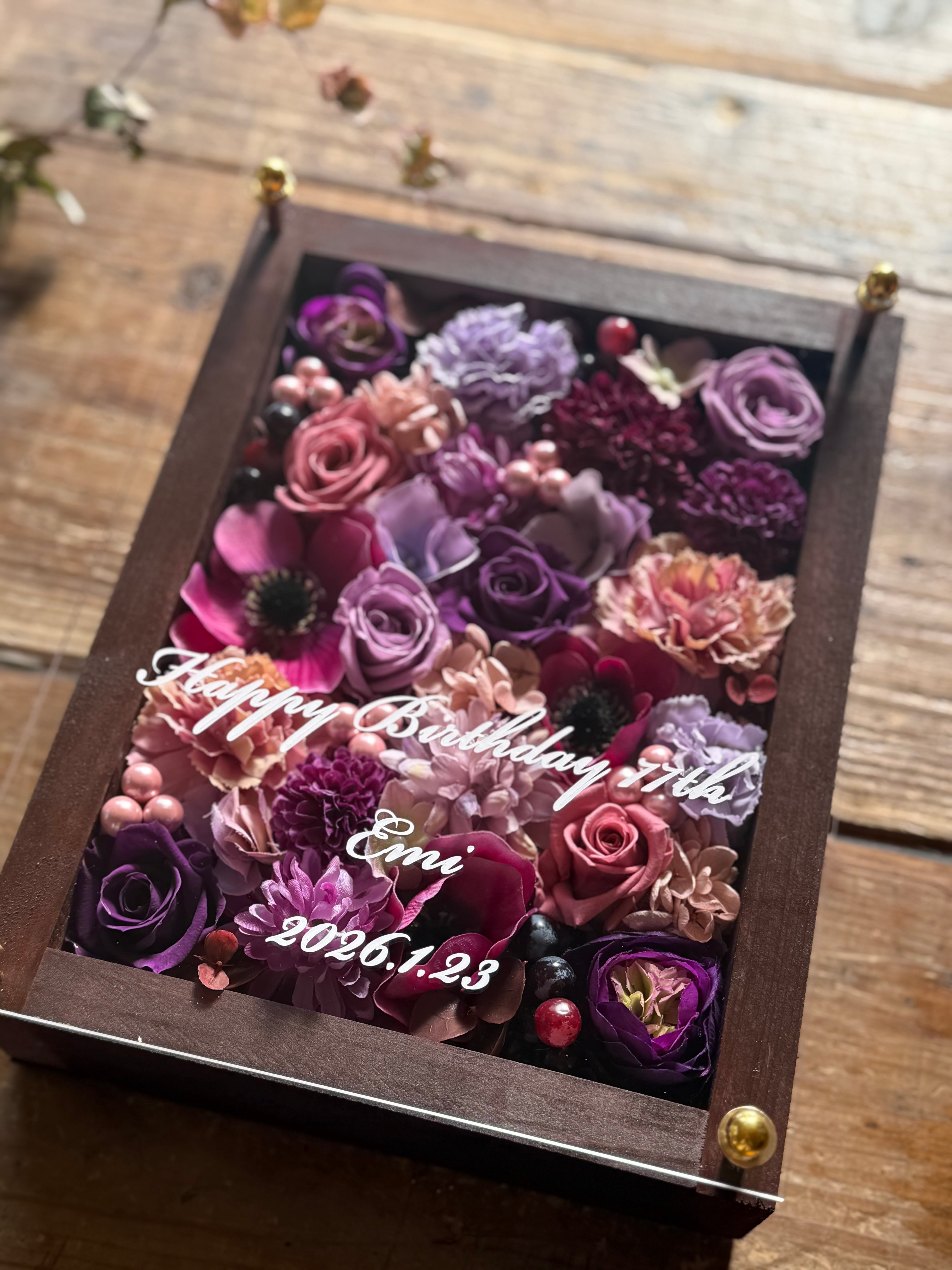 茶色のウッドフレームにプリザーブドフラワーと造花をぎっしり詰め込み、アクリル板にはカッティングシートでメッセージをお入れします。